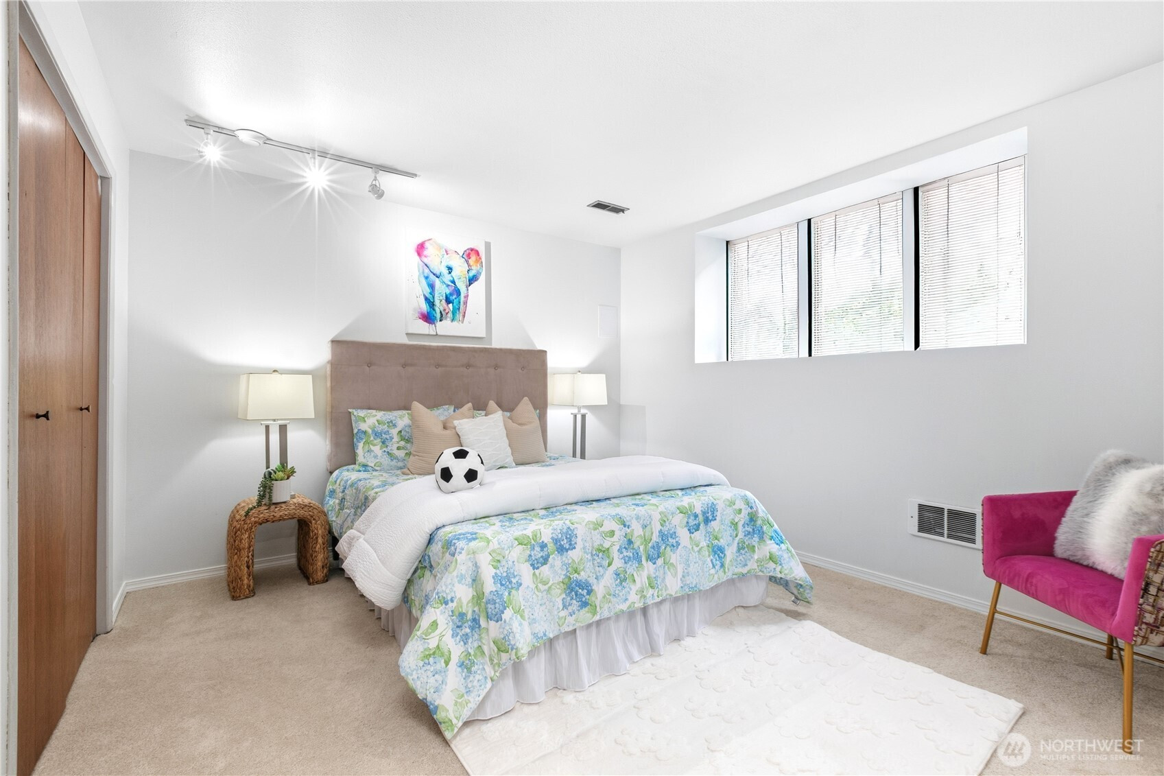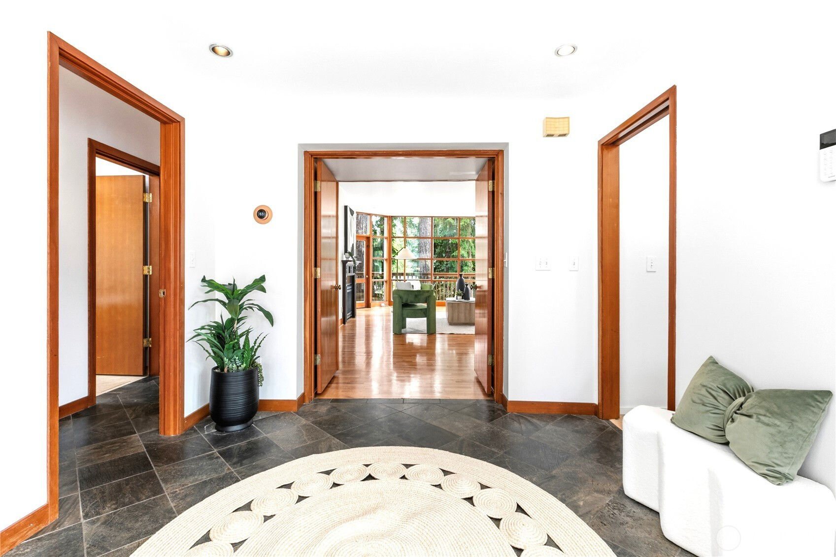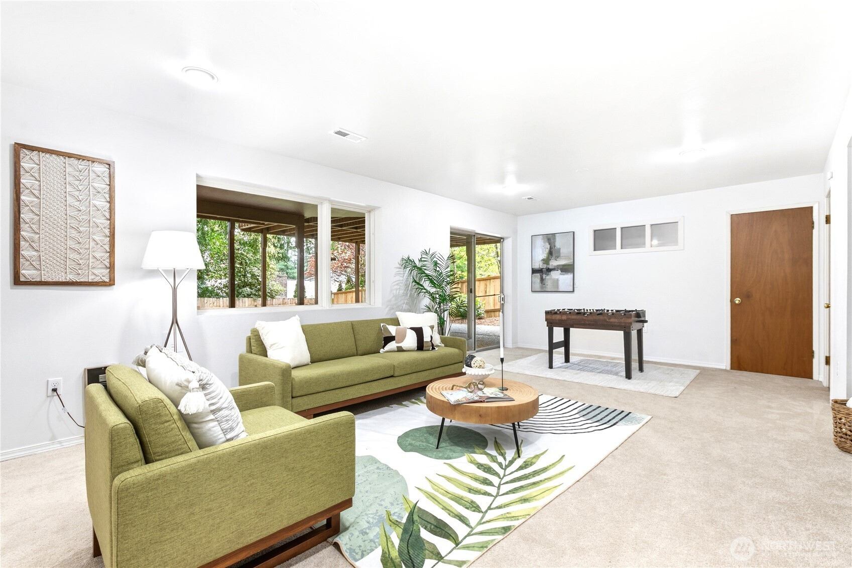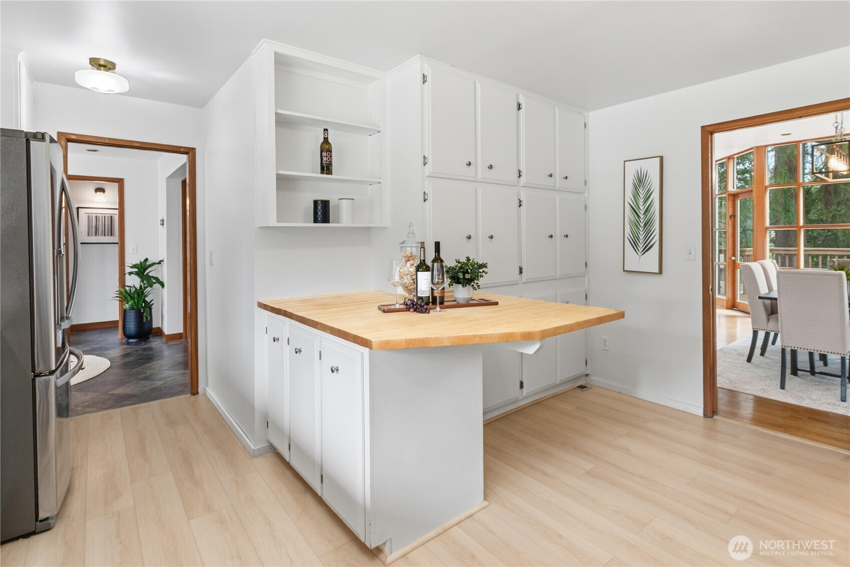 Beautifully updated contemporary home in a prime Redmond location in the heart of the Eastside tech hub. This 3,000 sq ft South-East facing home offers expansive living spaces, abundant natural light, and seamless indoor-outdoor flow. Vaulted ceilings and dramatic wood-framed windows, including a stunning glass wall, create a bright and airy atmosphere throughout. Sun-filled living and dining areas feature hardwood floors, built-ins, and French doors that open to a spacious deck—ideal for entertaining and enjoying the private, tree-lined setting. The updated kitchen features white cabinetry, stainless steel appliances, a wine cooler, and quartz countertops, offering ample prep and storage space. The main-level primary suite includes a well-appointed bath with a custom glass block shower, heated tile floors, steam shower, and jetted tub. The lower level offers a generous rec room with patio access, providing flexible space for guests, media, or a second living area. Recent updates include a new paint, fully redone deck, new HVAC, water heater, washer, dryer, and kitchen flooring. Huge, flat, usable front and backyard. Located just blocks from Grass Lawn Park with tennis courts, playgrounds, and picnic areas. Conveniently situated in the heart of the Eastside tech corridor, minutes to Microsoft, major employers, shopping, dining, and easy access to SR-520. Top rated LWSD schools. Pre-inspected and move-in ready.