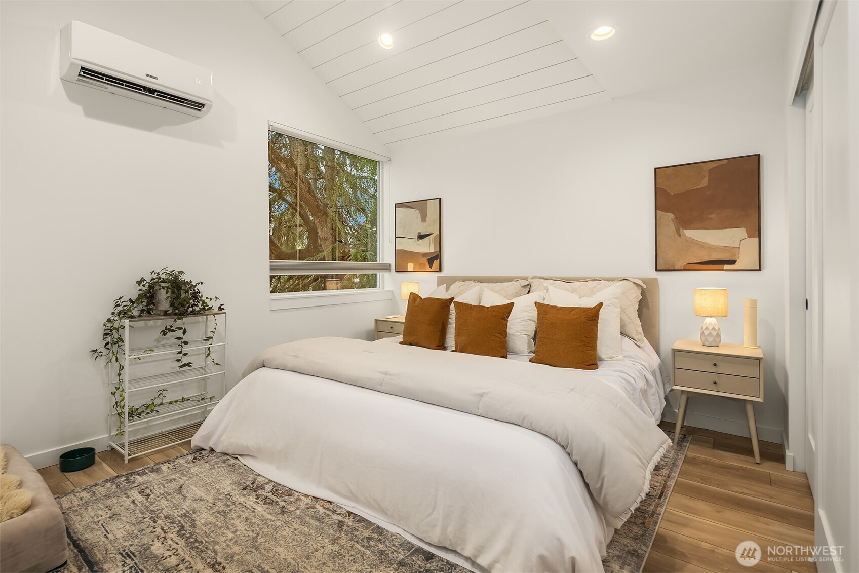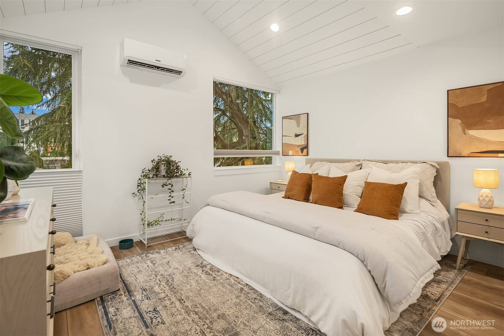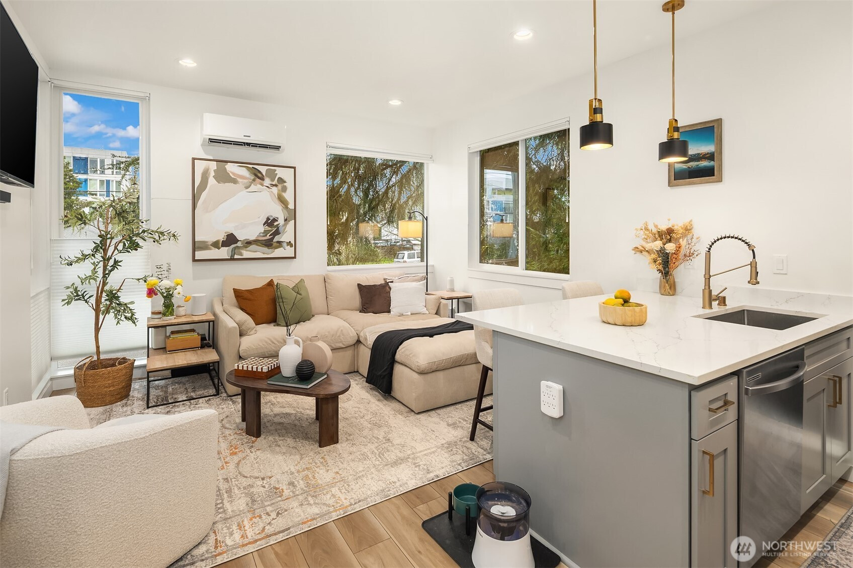 Modern Ballard living awaits in this beautifully designed 2-bed, 1.75-bath townhome offering approximately 1,123 square feet of thoughtfully crafted space. Tucked slightly off the street for added privacy, this contemporary home features an open-concept layout that seamlessly connects the living, dining, and kitchen areas—creating a bright and welcoming environment ideal for both everyday living and entertaining. Expansive windows invite natural light throughout the home, enhancing the airy feel and highlighting the clean, modern finishes. The well-appointed kitchen is the heart of the home, showcasing sleek cabinetry, quartz countertops, stainless steel appliances, and ample workspace for cooking and gathering. The spacious primary suite provides a comfortable retreat with generous closet space and a stylish ensuite bath featuring modern fixtures and finishes. A versatile second bedroom offers flexibility for guests, a home office, or creative space. Efficient ductless mini-split systems provide year-round heating and cooling, while thoughtful design elements maximize both comfort and functionality. Step outside to enjoy your private rooftop deck—an ideal setting for morning coffee, evening sunsets, or hosting friends while taking in neighborhood views. Dedicated off-street parking with EV charger adds everyday convenience. Ideally located in the vibrant Ballard neighborhood, this home offers easy access to some of Seattle’s most beloved amenities.