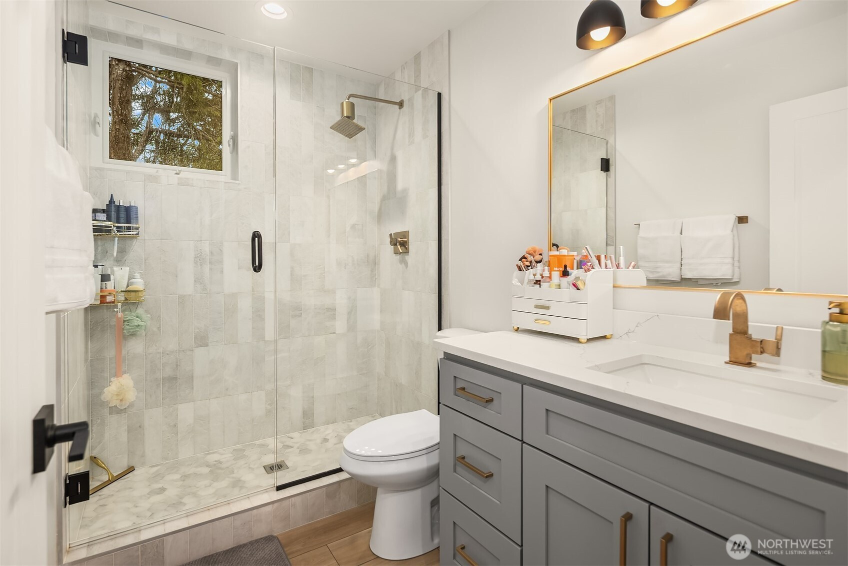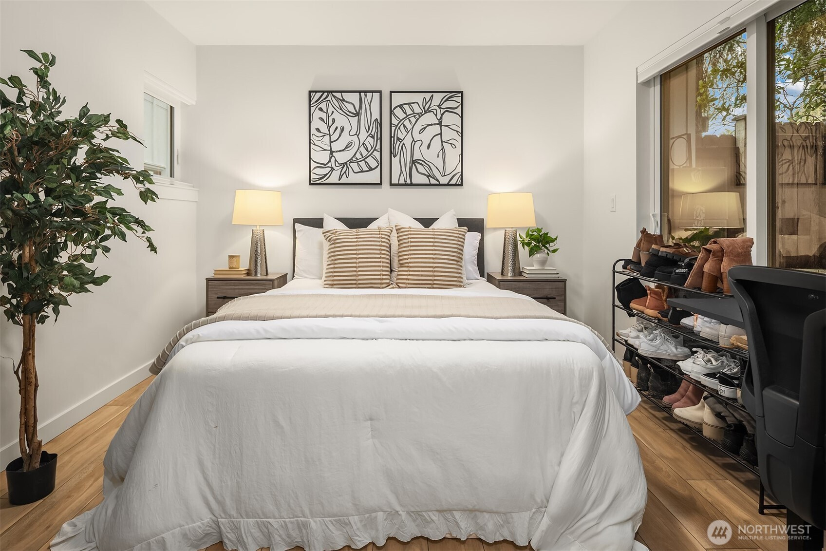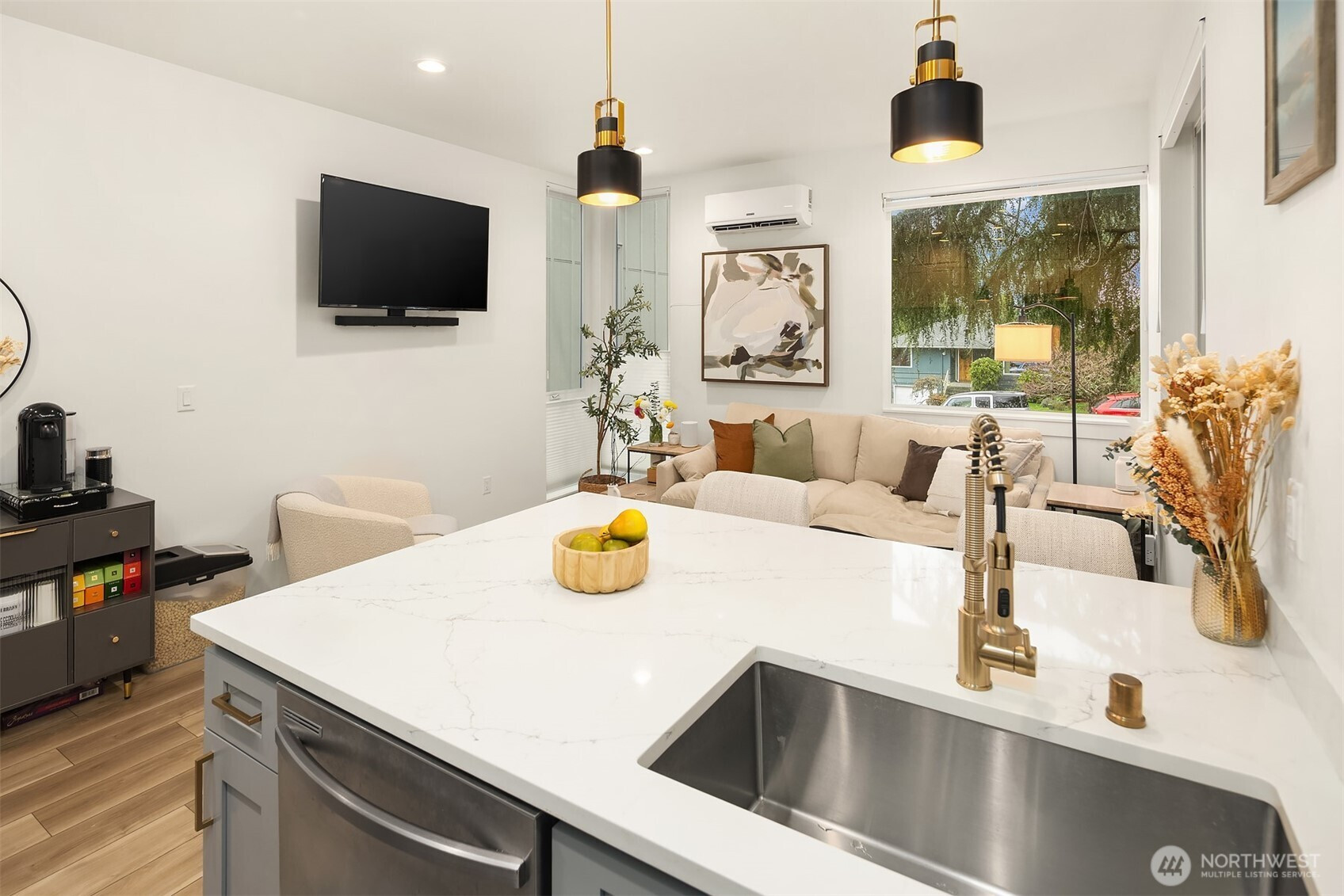Modern Ballard living awaits in this beautifully designed 2-bed, 1.75-bath townhome offering approximately 1,123 square feet of thoughtfully crafted space. Tucked slightly off the street for added privacy, this contemporary home features an open-concept layout that seamlessly connects the living, dining, and kitchen areas—creating a bright and welcoming environment ideal for both everyday living and entertaining. Expansive windows invite natural light throughout the home, enhancing the airy feel and highlighting the clean, modern finishes. The well-appointed kitchen is the heart of the home, showcasing sleek cabinetry, quartz countertops, stainless steel appliances, and ample workspace for cooking and gathering. The spacious primary suite provides a comfortable retreat with generous closet space and a stylish ensuite bath featuring modern fixtures and finishes. A versatile second bedroom offers flexibility for guests, a home office, or creative space. Efficient ductless mini-split systems provide year-round heating and cooling, while thoughtful design elements maximize both comfort and functionality. Step outside to enjoy your private rooftop deck—an ideal setting for morning coffee, evening sunsets, or hosting friends while taking in neighborhood views. Dedicated off-street parking with EV charger adds everyday convenience. Ideally located in the vibrant Ballard neighborhood, this home offers easy access to some of Seattle’s most beloved amenities.