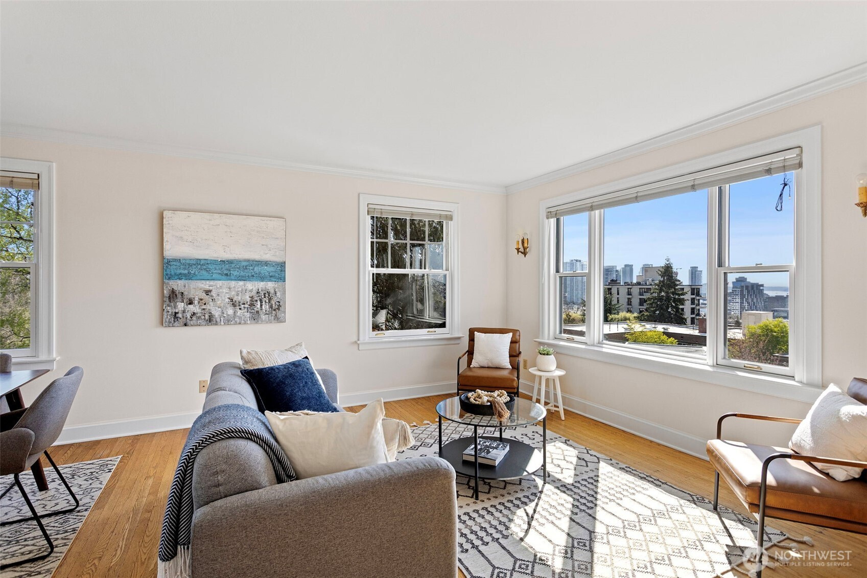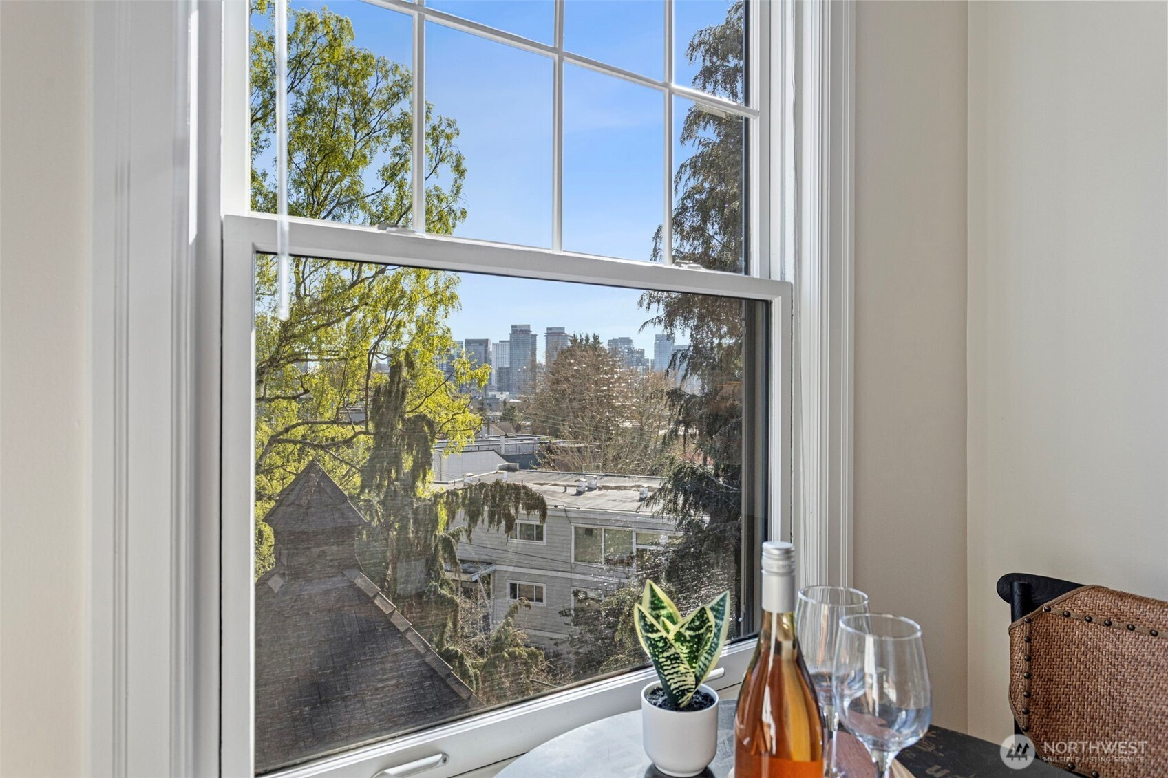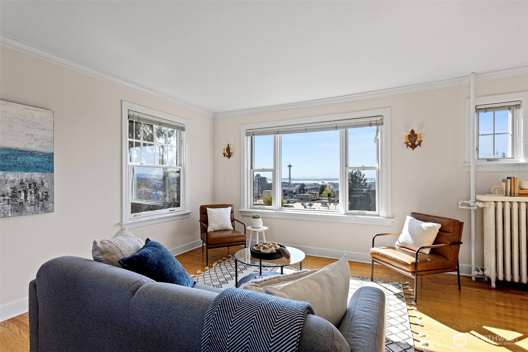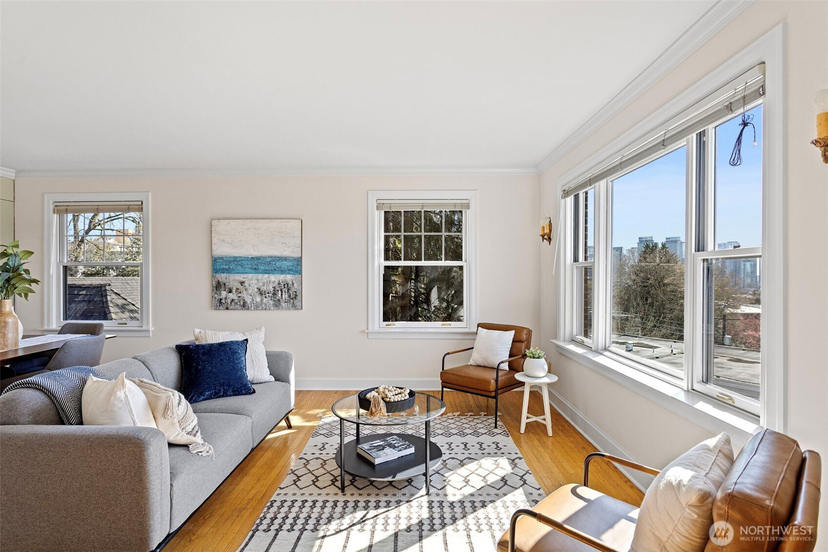 Experience the Bellemoral's “Gold Coast,” where abundant western light fills expansive windows, revealing inspired views of Lake Union, the Olympic Mountains, Elliott Bay, Seattle’s skyline, & beyond. Unit 304 is a spacious 711 sf, top-floor corner unit with just one shared wall. As you enter through the foyer, you’ll find a living & dining area featuring high ceilings, hardwood floors, an arched passage & a versatile alcove, & those views! The kitchen has tile countertops, ample cabinets, & an inviting eating area with a view of greenery & the city. Down the hall, you’ll discover a tiled bath with original floors, a pedestal sink & a relaxing tub. The generous bedroom offers a nicely sized closet and a peaceful outlook. Nestled in Capitol Hill’s Historic Harvard District, the 1927 Bellemoral Co-op is surrounded by beautiful homes. Everything you need is nearby: incredible restaurants, cafes, shops, Volunteer Park, groceries, schools, nightlife, transit, & light rail. Enjoy the convenience of monthly fees that cover all utilities except electricity, including taxes and insurance. Monthly fees include: HOA Fees & Taxes & Insurance. This well-managed building also features a resident caretaker. Cats & service dogs welcome. For those in need of parking, there is no waitlist for a garage spot, available for just $70 a month. Whether you seek vibrant activities or quieter moments, this location allows you to choose both for an ideal lifestyle.