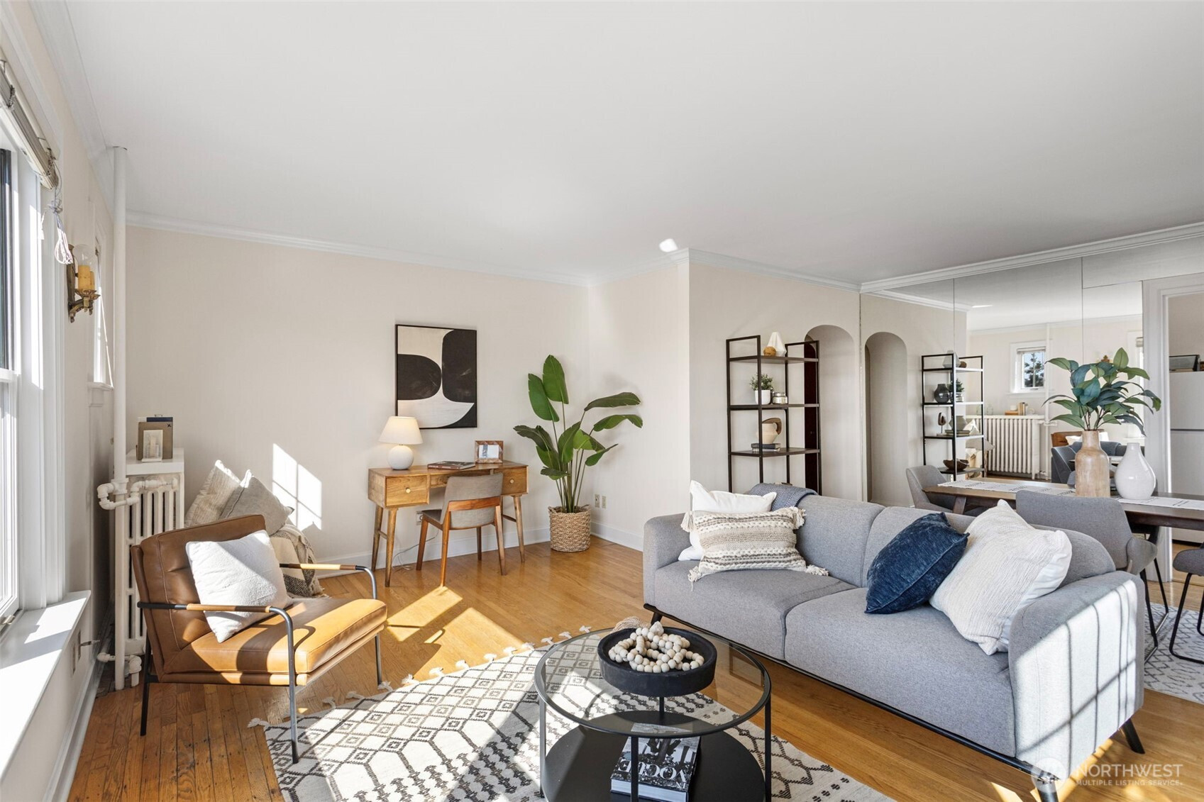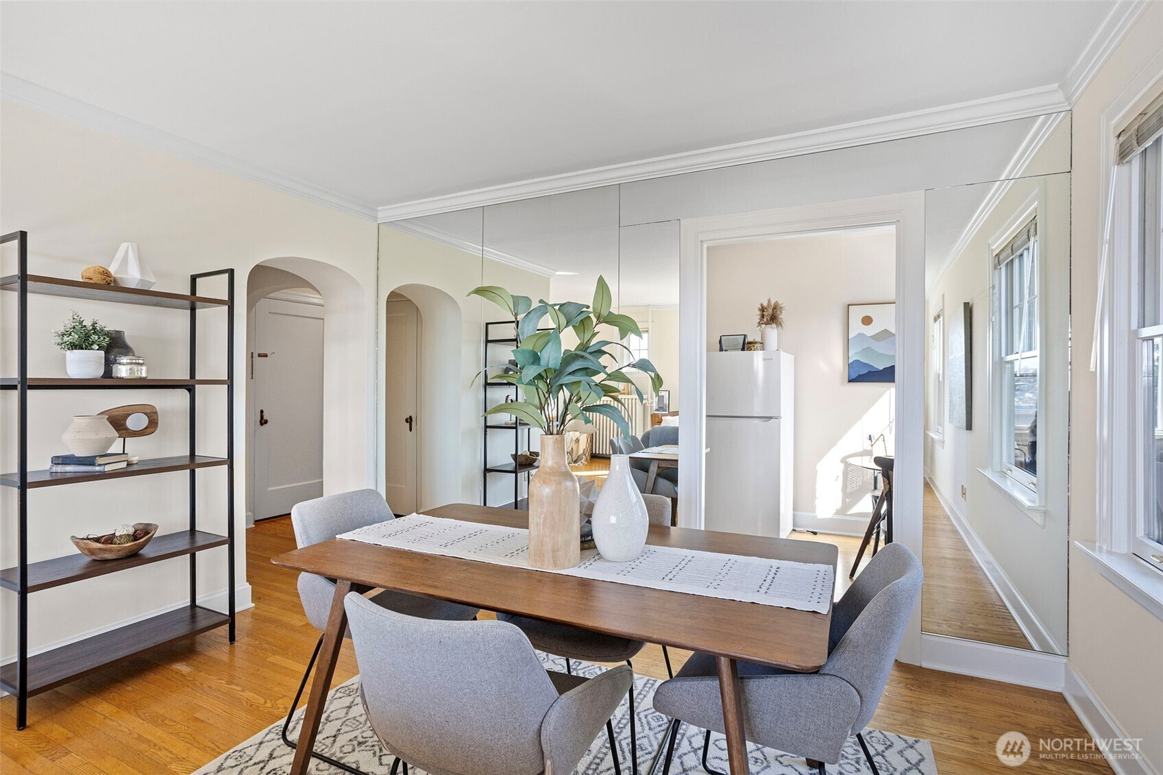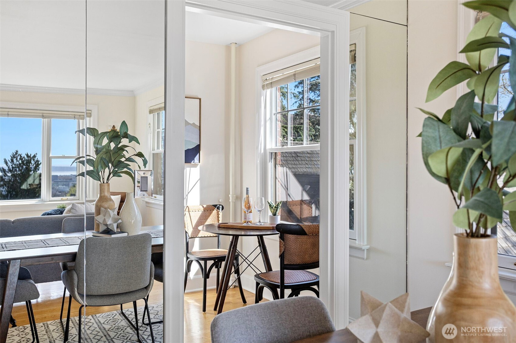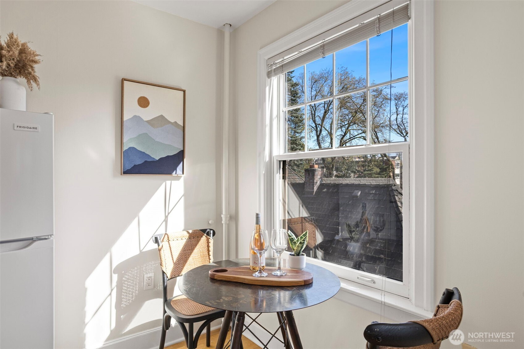 Experience the Bellemoral's “Gold Coast,” where abundant western light fills expansive windows, revealing inspired views of Lake Union, the Olympic Mountains, Elliott Bay, Seattle’s skyline, & beyond. Unit 304 is a spacious 711 sf, top-floor corner unit with just one shared wall. As you enter through the foyer, you’ll find a living & dining area featuring high ceilings, hardwood floors, an arched passage & a versatile alcove, & those views! The kitchen has tile countertops, ample cabinets, & an inviting eating area with a view of greenery & the city. Down the hall, you’ll discover a tiled bath with original floors, a pedestal sink & a relaxing tub. The generous bedroom offers a nicely sized closet and a peaceful outlook. Nestled in Capitol Hill’s Historic Harvard District, the 1927 Bellemoral Co-op is surrounded by beautiful homes. Everything you need is nearby: incredible restaurants, cafes, shops, Volunteer Park, groceries, schools, nightlife, transit, & light rail. Enjoy the convenience of monthly fees that cover all utilities except electricity, including taxes and insurance. Monthly fees include: HOA Fees & Taxes & Insurance. This well-managed building also features a resident caretaker. Cats & service dogs welcome. For those in need of parking, there is no waitlist for a garage spot, available for just $70 a month. Whether you seek vibrant activities or quieter moments, this location allows you to choose both for an ideal lifestyle.