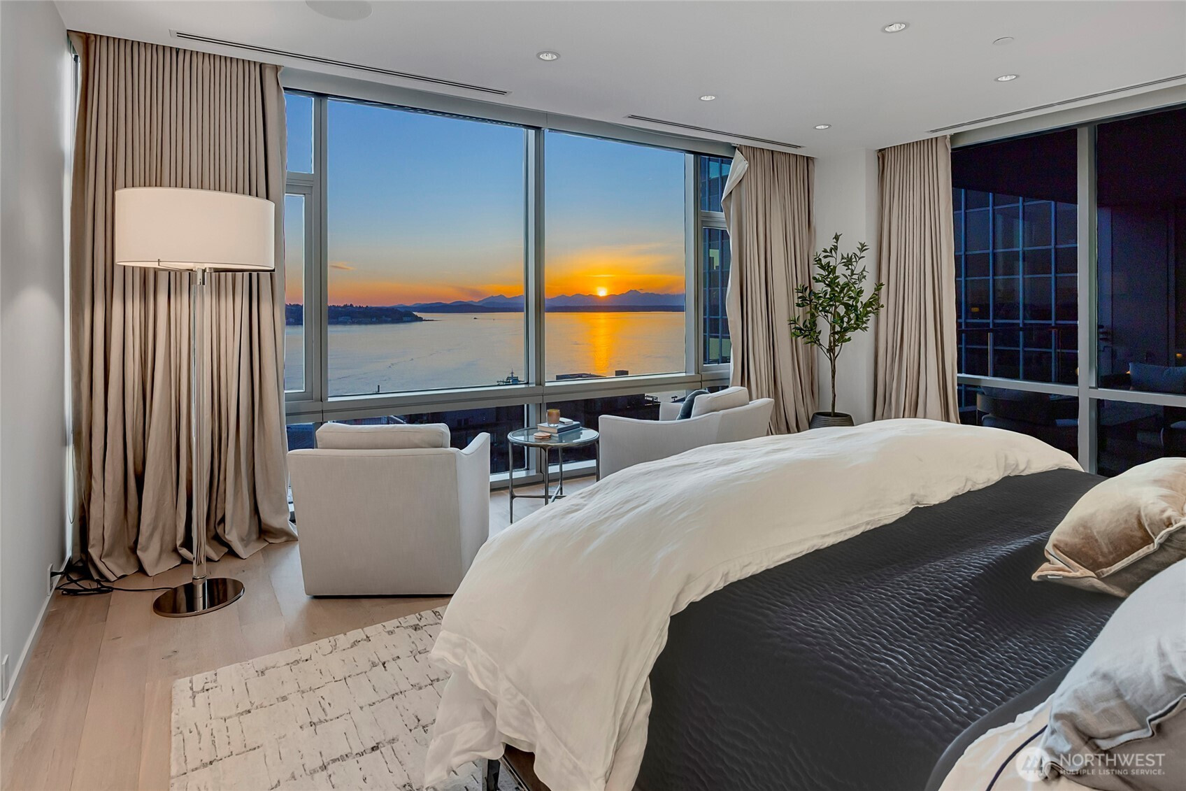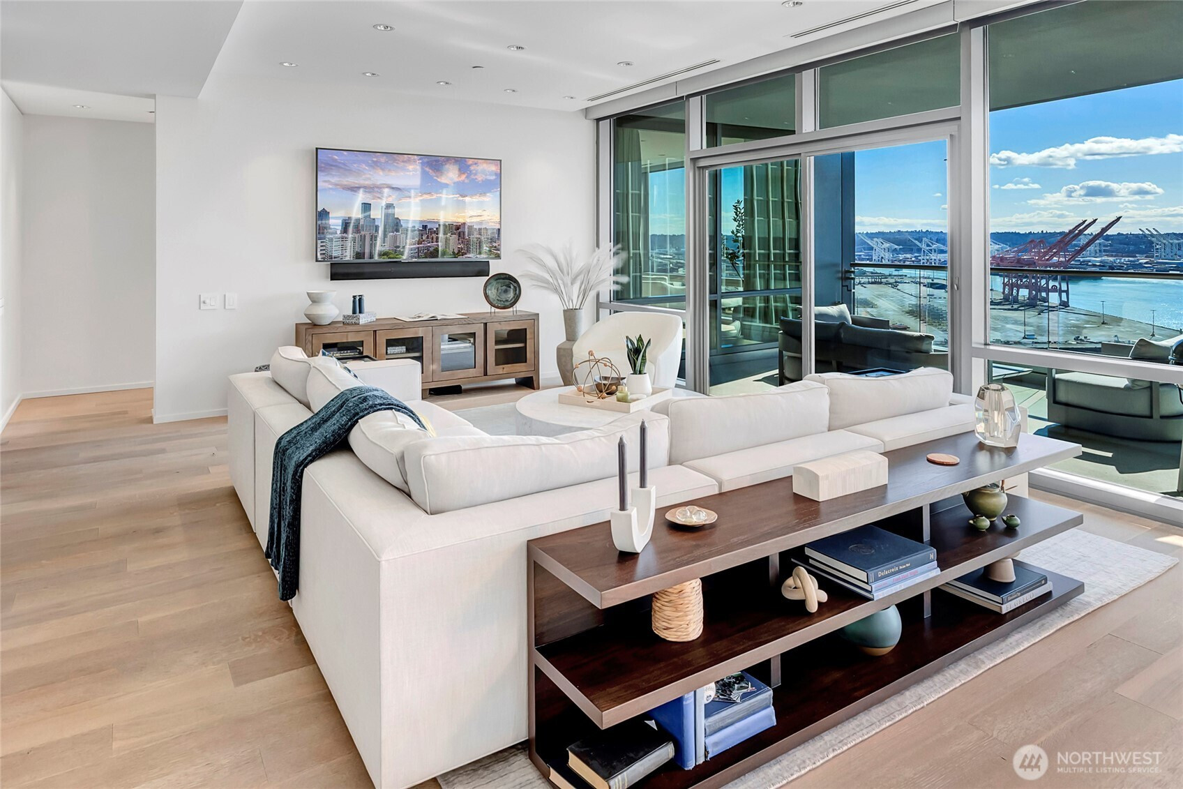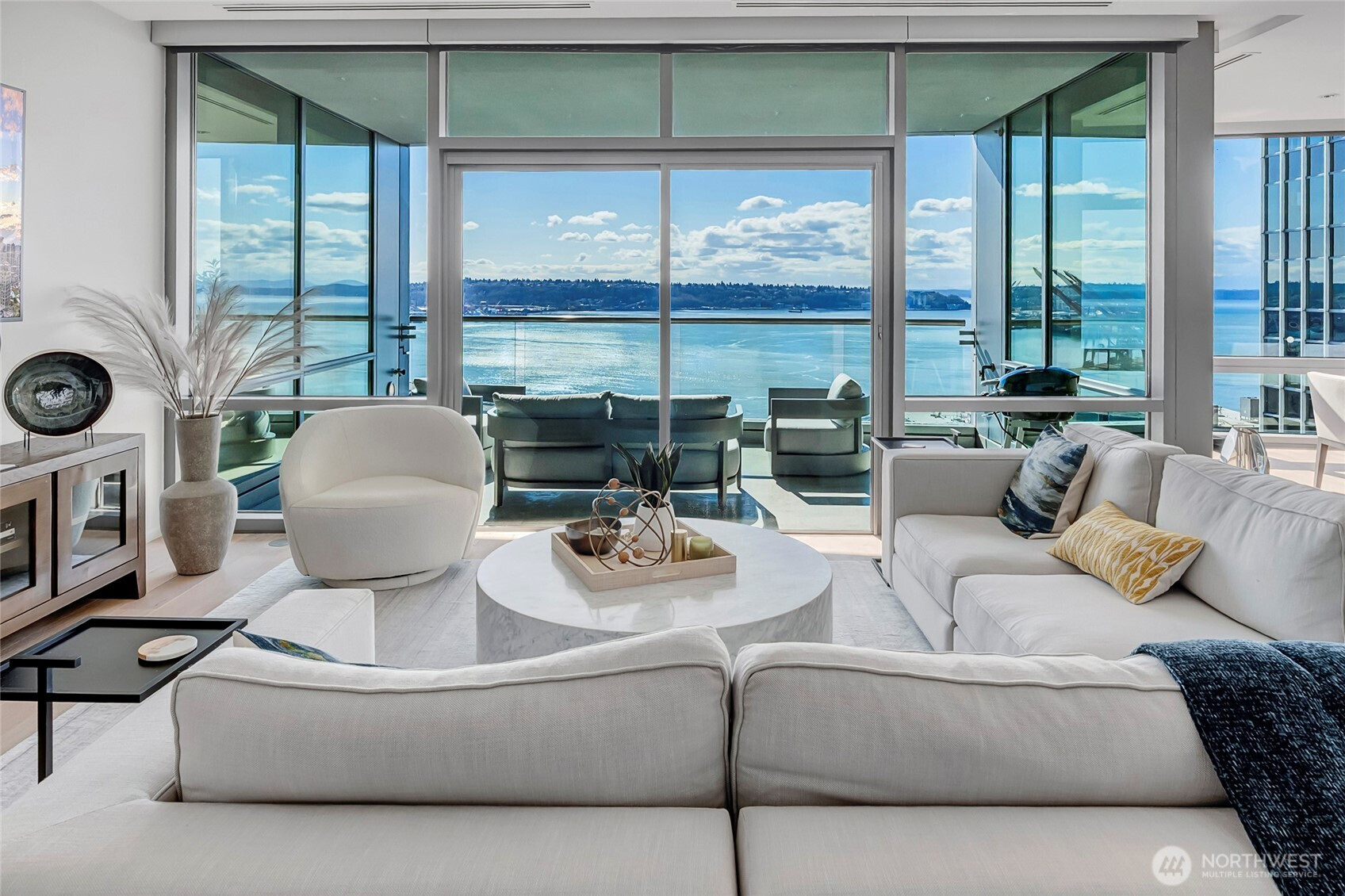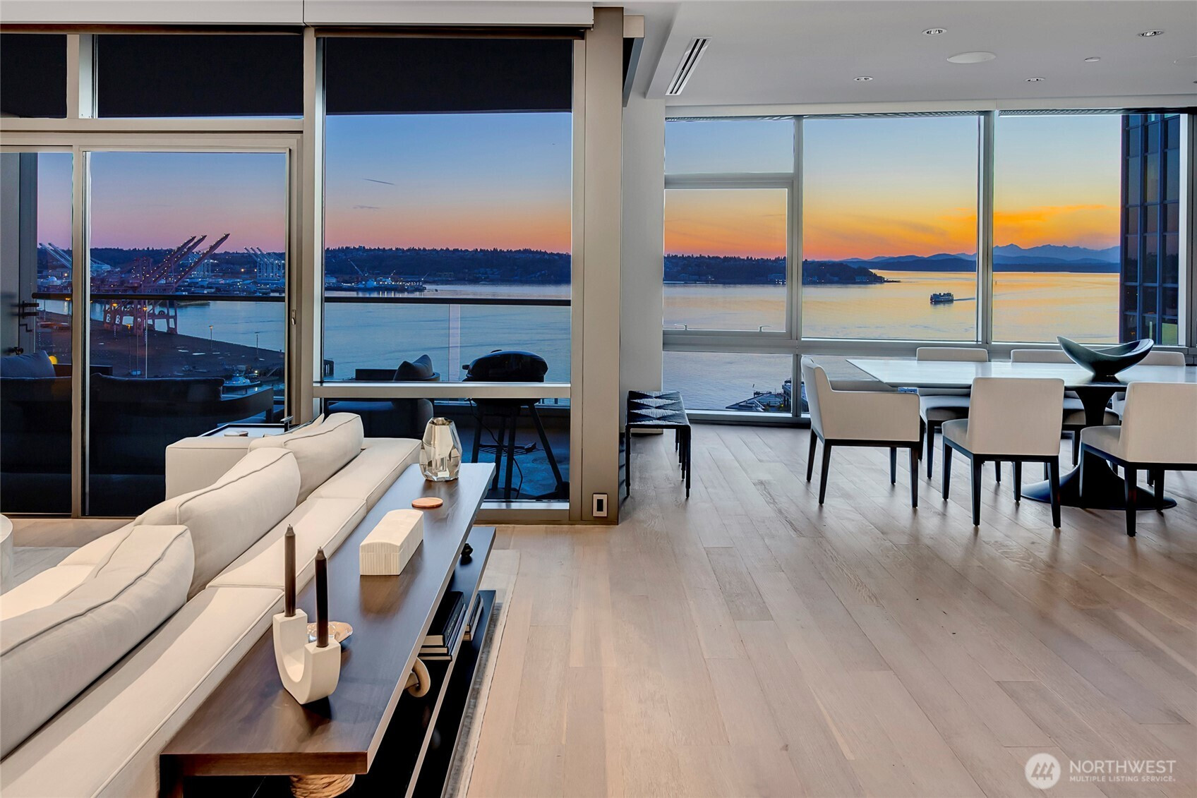 This is the epitome of an active "close the door and go" lifestyle. Elevated above the heart of Downtown Seattle, this striking residence at Millennium Tower delivers front row views of Elliott Bay, the Olympic Mountains and the glittering city skyline. Wrapped in dramatic walls of glass, the home is bathed in natural light from sunrise to sunset, creating a sophisticated yet inviting retreat in the sky. Thoughtfully designed by Olson Sundberg Kundig this property works for both entertaining and everyday comfort. The entire property has been beautifully renovated with wide plank hardwood floors, open living and dining spaces that flow seamlessly to a rare private terrace. Its the perfect spot for outdoor dining, evening cocktails or simply taking in the sweeping water and mountain vistas. Refined details add warmth and texture throughout. The chef’s kitchen anchors the space with style and functionality. Slab Carrara marble, Subzero, Wolf. A dedicated office offers an ideal work from home environment. The primary suite is a serene sanctuary featuring a spa caliber bath and walk in closet that feels like pure luxury. A beautifully appointed guest suite with private bath ensures comfort for visitors. Two secure parking spaces complete the offering. Just steps from the revitalized Seattle waterfront, Pike Place Market, Mariners, Sounders, Seahawk games, acclaimed restaurants, arts venues and boutique shopping. This is luxury urban living at its most vibrant!