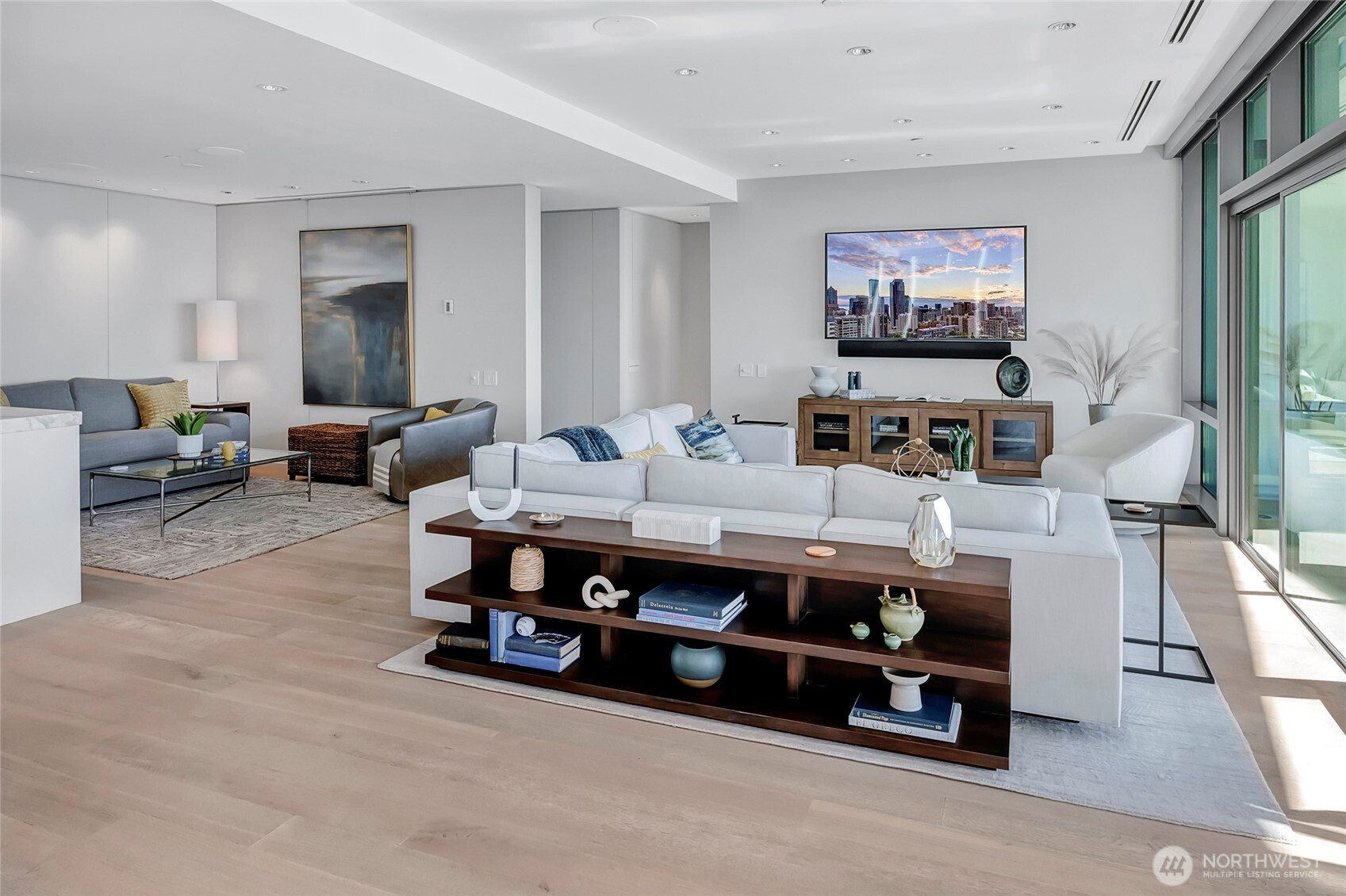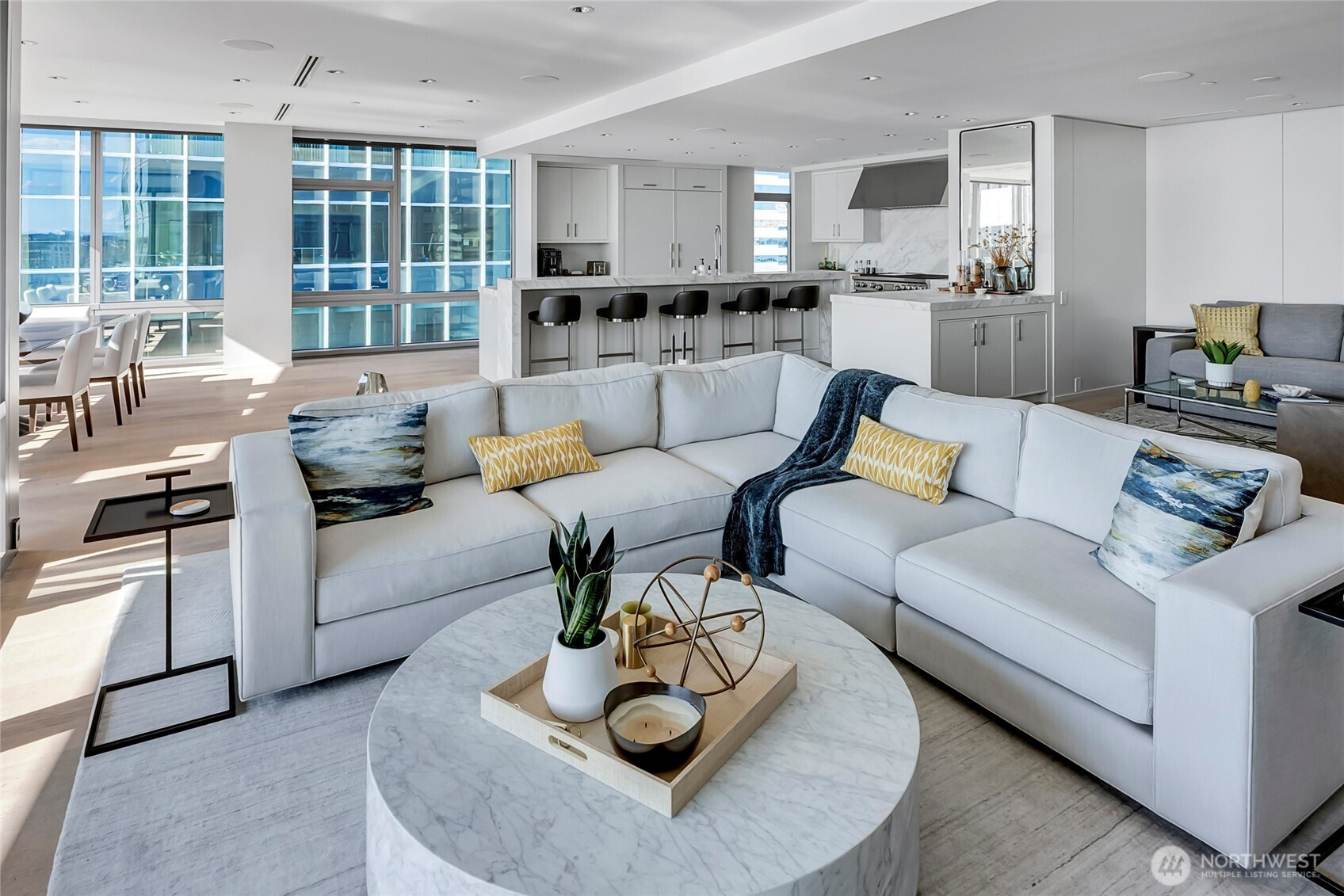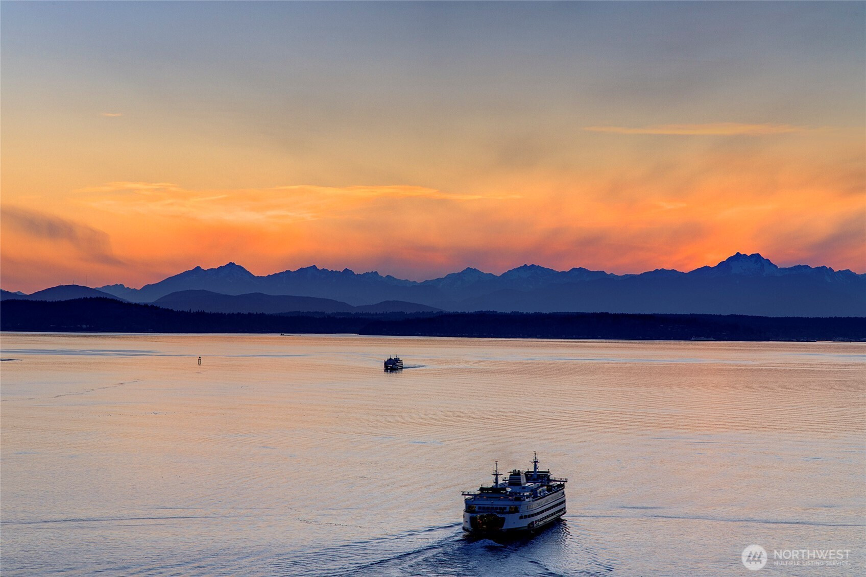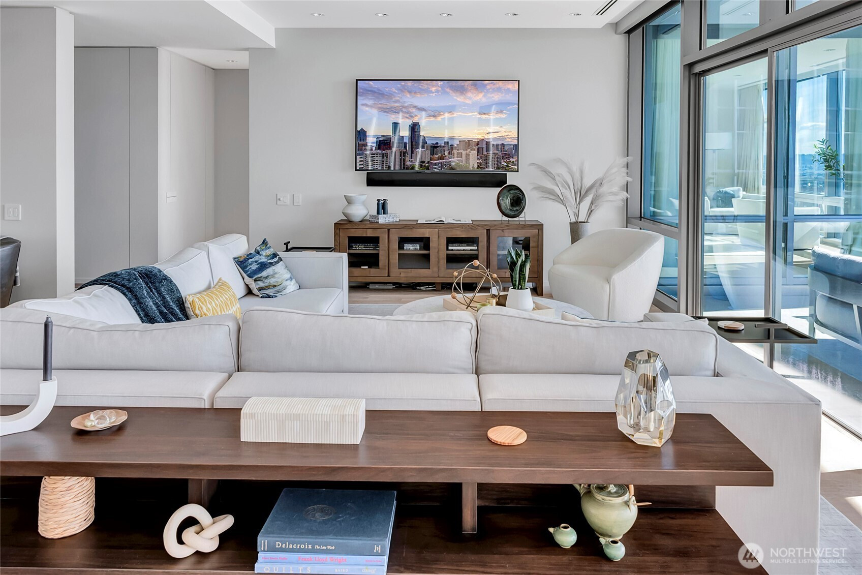 This is the epitome of an active "close the door and go" lifestyle. Elevated above the heart of Downtown Seattle, this striking residence at Millennium Tower delivers front row views of Elliott Bay, the Olympic Mountains and the glittering city skyline. Wrapped in dramatic walls of glass, the home is bathed in natural light from sunrise to sunset, creating a sophisticated yet inviting retreat in the sky. Thoughtfully designed by Olson Sundberg Kundig this property works for both entertaining and everyday comfort. The entire property has been beautifully renovated with wide plank hardwood floors, open living and dining spaces that flow seamlessly to a rare private terrace. Its the perfect spot for outdoor dining, evening cocktails or simply taking in the sweeping water and mountain vistas. Refined details add warmth and texture throughout. The chef’s kitchen anchors the space with style and functionality. Slab Carrara marble, Subzero, Wolf. A dedicated office offers an ideal work from home environment. The primary suite is a serene sanctuary featuring a spa caliber bath and walk in closet that feels like pure luxury. A beautifully appointed guest suite with private bath ensures comfort for visitors. Two secure parking spaces complete the offering. Just steps from the revitalized Seattle waterfront, Pike Place Market, Mariners, Sounders, Seahawk games, acclaimed restaurants, arts venues and boutique shopping. This is luxury urban living at its most vibrant!