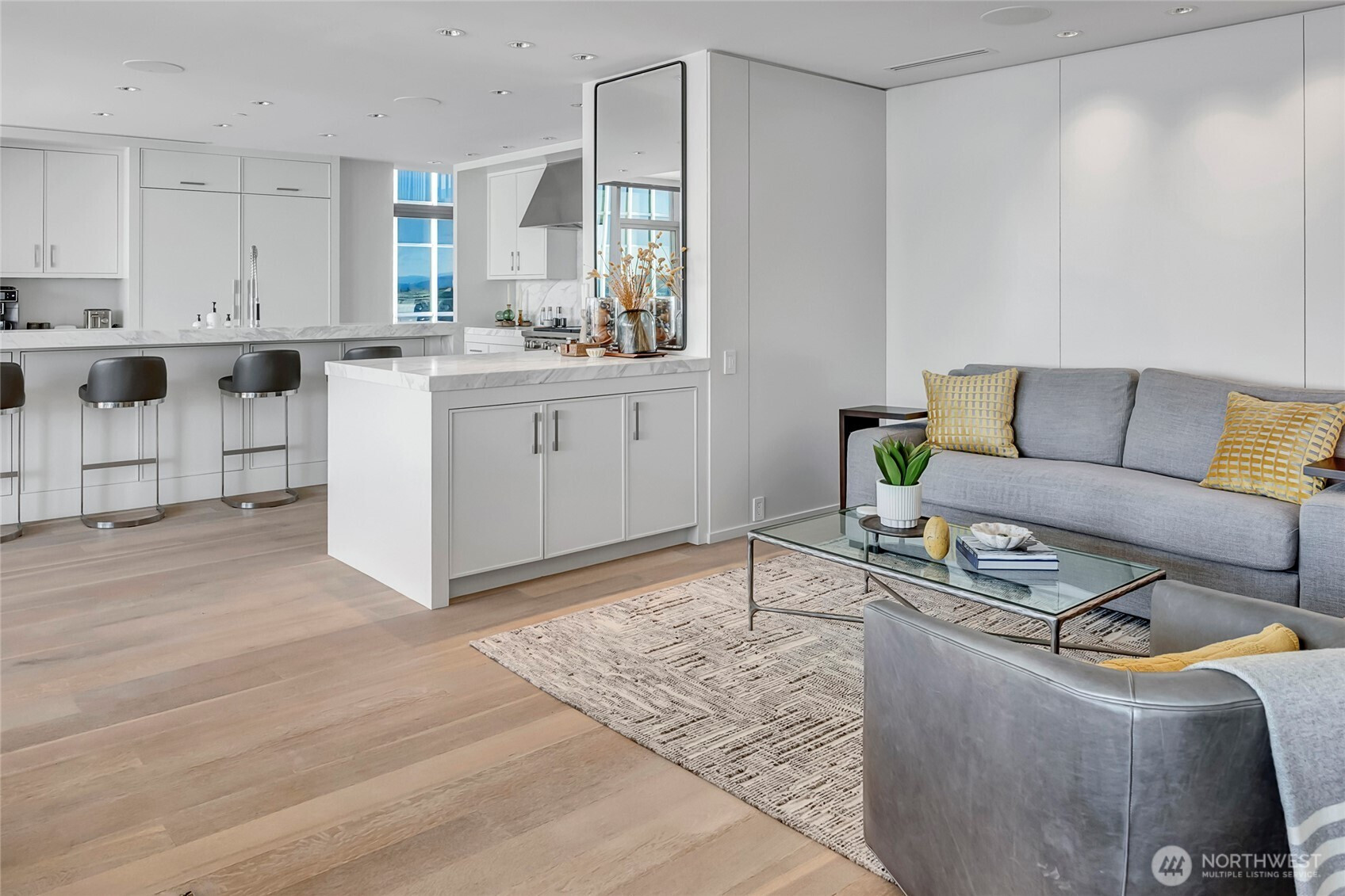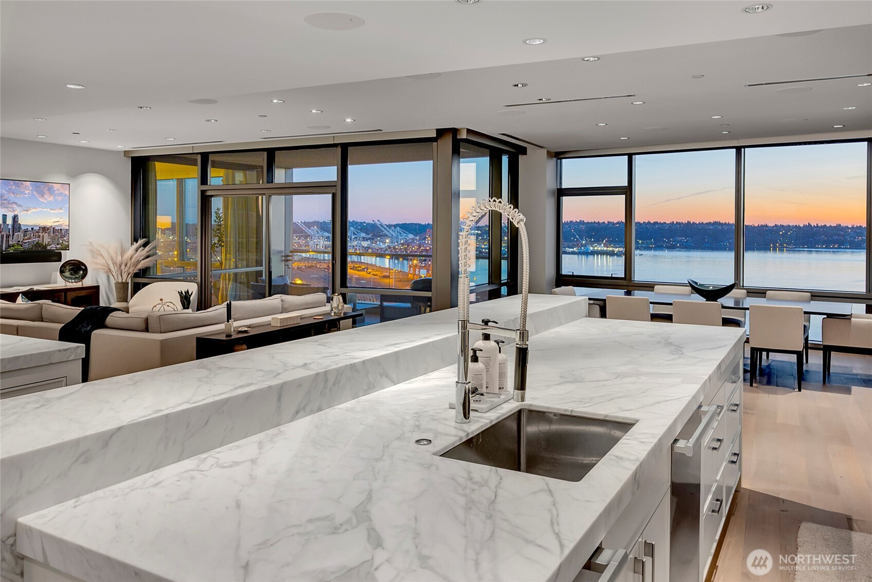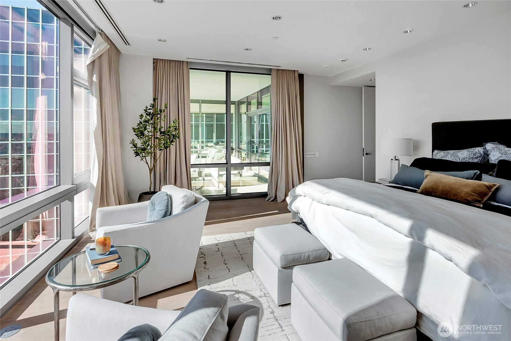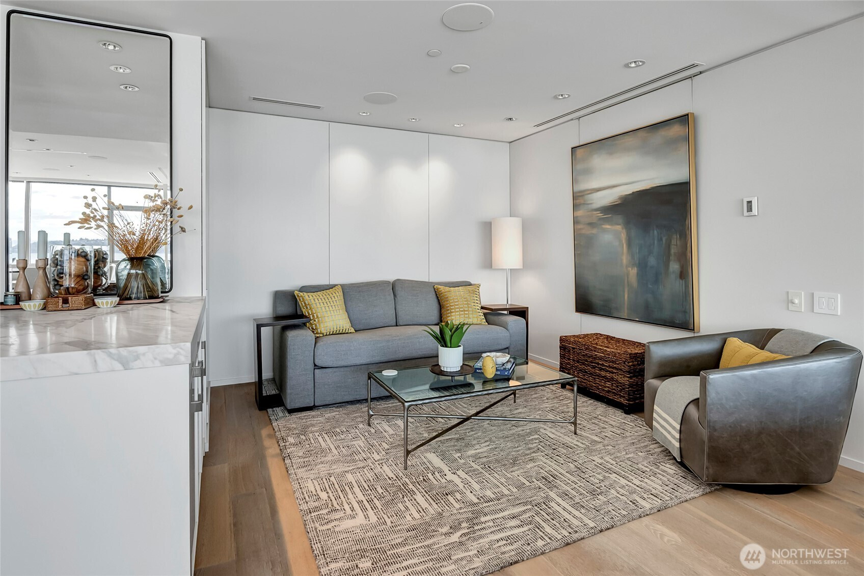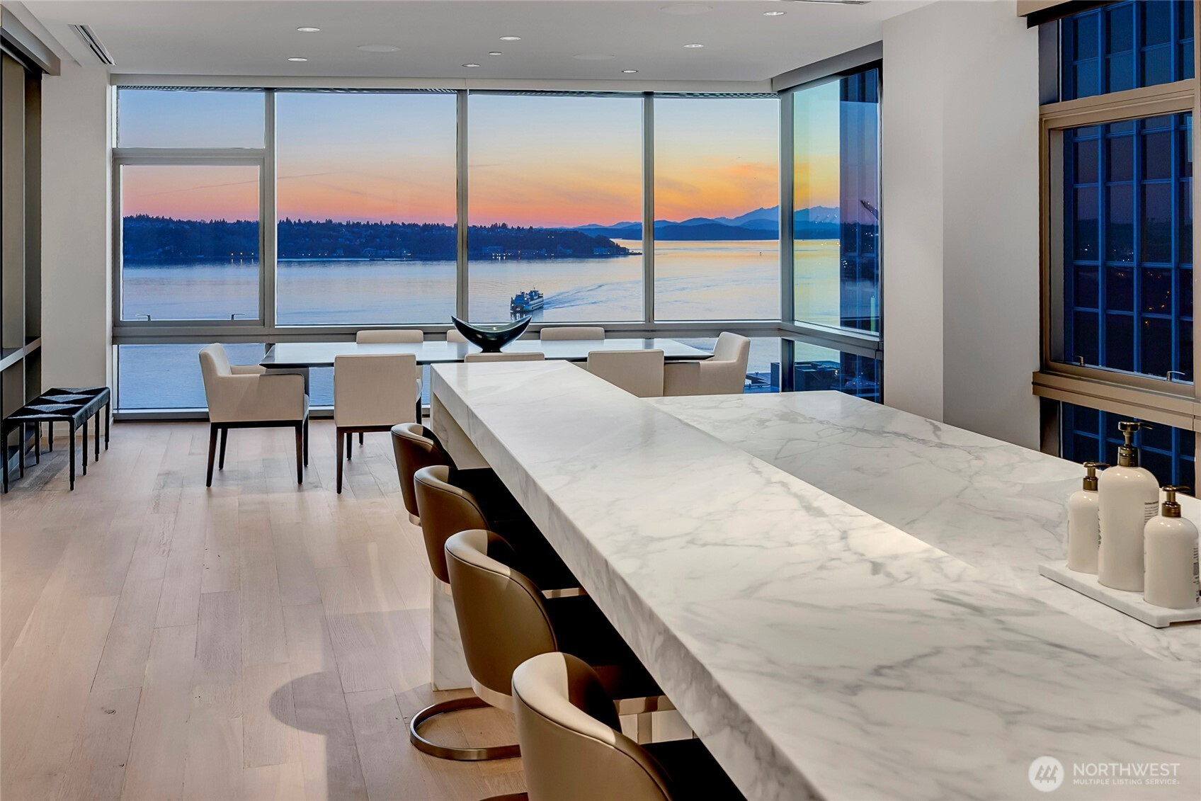 This is the epitome of an active "close the door and go" lifestyle. Elevated above the heart of Downtown Seattle, this striking residence at Millennium Tower delivers front row views of Elliott Bay, the Olympic Mountains and the glittering city skyline. Wrapped in dramatic walls of glass, the home is bathed in natural light from sunrise to sunset, creating a sophisticated yet inviting retreat in the sky. Thoughtfully designed by Olson Sundberg Kundig this property works for both entertaining and everyday comfort. The entire property has been beautifully renovated with wide plank hardwood floors, open living and dining spaces that flow seamlessly to a rare private terrace. Its the perfect spot for outdoor dining, evening cocktails or simply taking in the sweeping water and mountain vistas. Refined details add warmth and texture throughout. The chef’s kitchen anchors the space with style and functionality. Slab Carrara marble, Subzero, Wolf. A dedicated office offers an ideal work from home environment. The primary suite is a serene sanctuary featuring a spa caliber bath and walk in closet that feels like pure luxury. A beautifully appointed guest suite with private bath ensures comfort for visitors. Two secure parking spaces complete the offering. Just steps from the revitalized Seattle waterfront, Pike Place Market, Mariners, Sounders, Seahawk games, acclaimed restaurants, arts venues and boutique shopping. This is luxury urban living at its most vibrant!