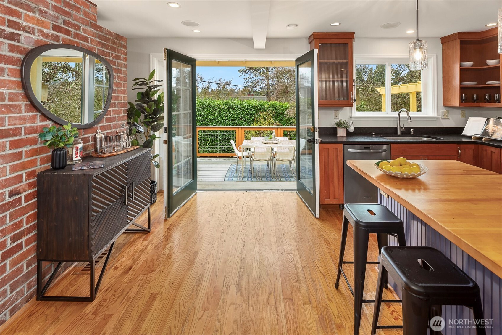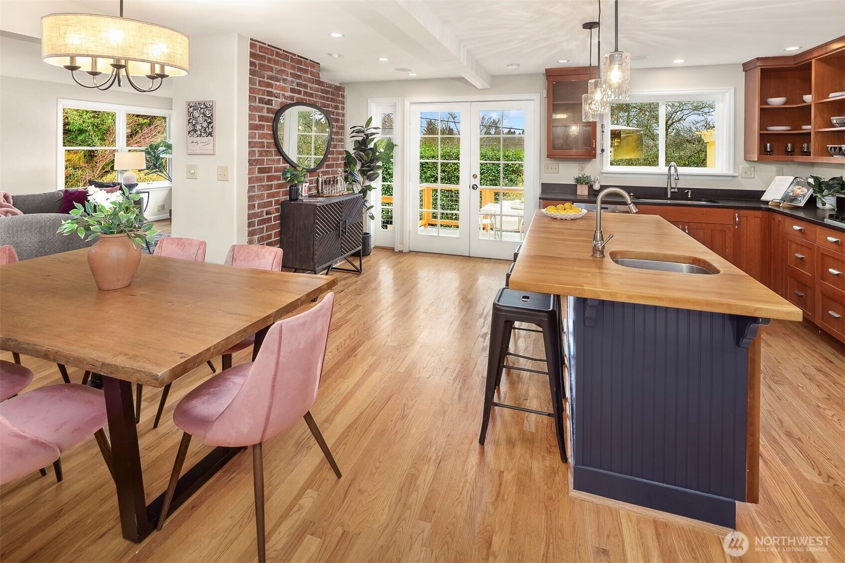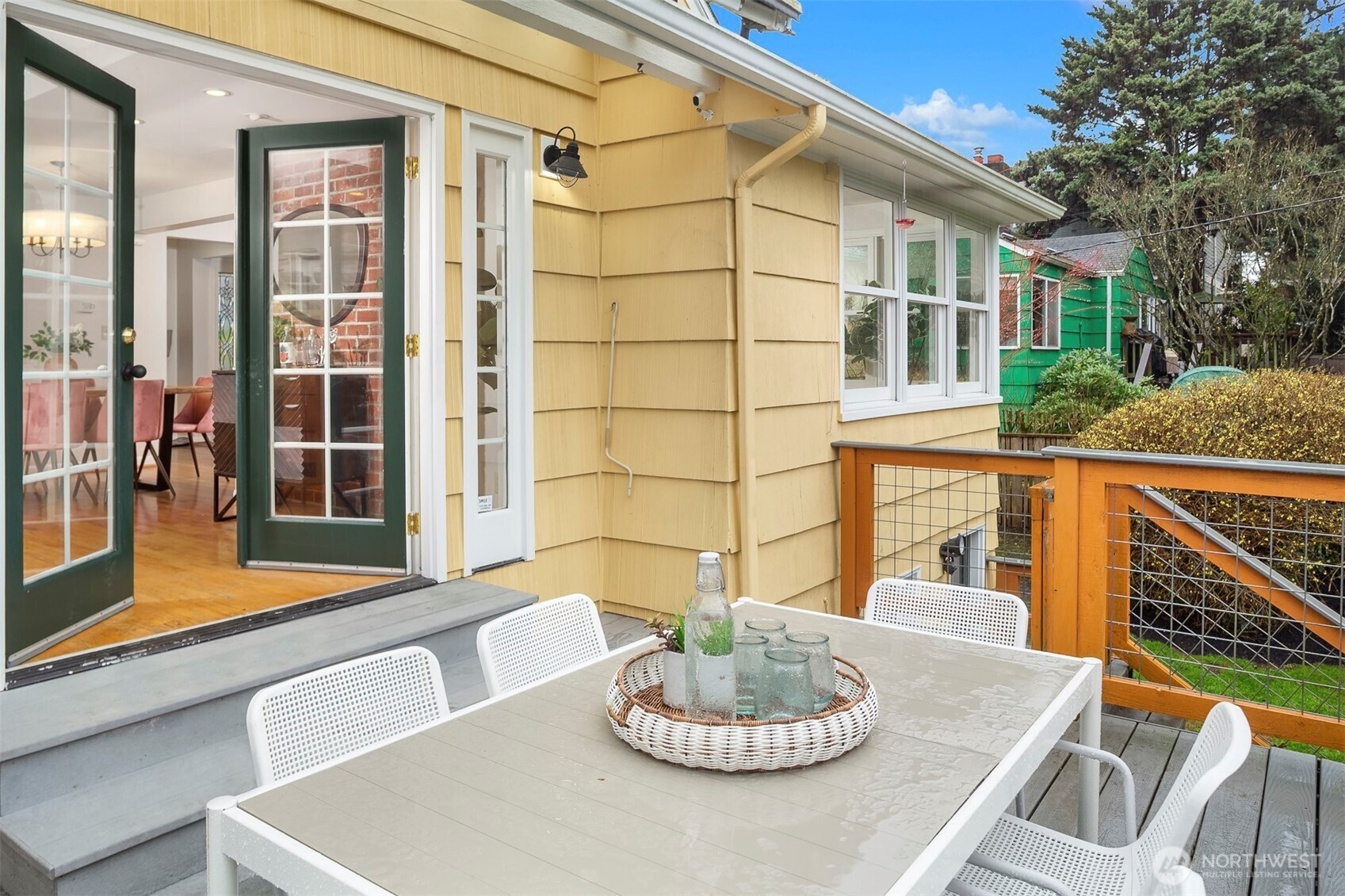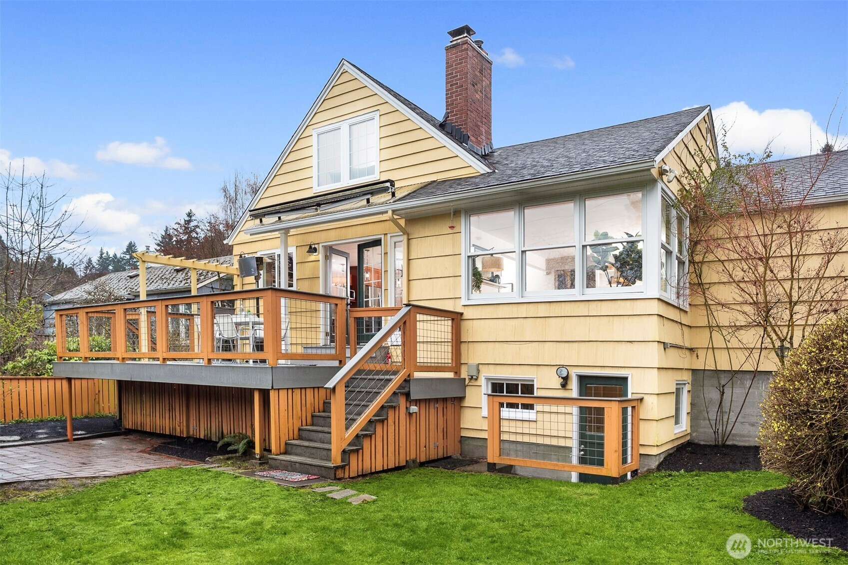 Sitting on the cusp of two of the most desirable neighorhoods, Ravenna & Wedgwood, this sweet home offers it all! From first sight this home exudes warmth, whether it be the charming Dutch front door or the secret passageways. Once through your proper entry, the large living room greets you with a wood burning fireplace and corner windows, looking out through climbing rose bushes to your backyard. The kitchen and dining area sit open with your living room, where the fully updated kitchen really shines. The newer trex deck has a retractable walled awning, offering protection from all sorts of weather! The convenient main floor bathroom is newly remodeled. Two main floor bedrooms are spacious with an incredibly cool “secret passageway” between the two closets. Upstairs houses your primary bedroom, newer full bathroom, and an additional bedroom hidden behind a bookshelf door. The basement offers a 5th bedroom plus a three quarter bathroom. So nice having a bathroom on every level! A large workshop lives downstairs, already equipped with a filtration system, plus ample storage. The backyard is simply dreamy with a sweet bush fort (find it!) and garden space. The 1 car garage offers a brand new door, plus thoughtful wood storage that is accessible through the entry closet. So many details have been considered here! Excellently located, sitting on a residential street while only a few blocks to shops, restaurant, grocery options, and University Village. Welcome home!