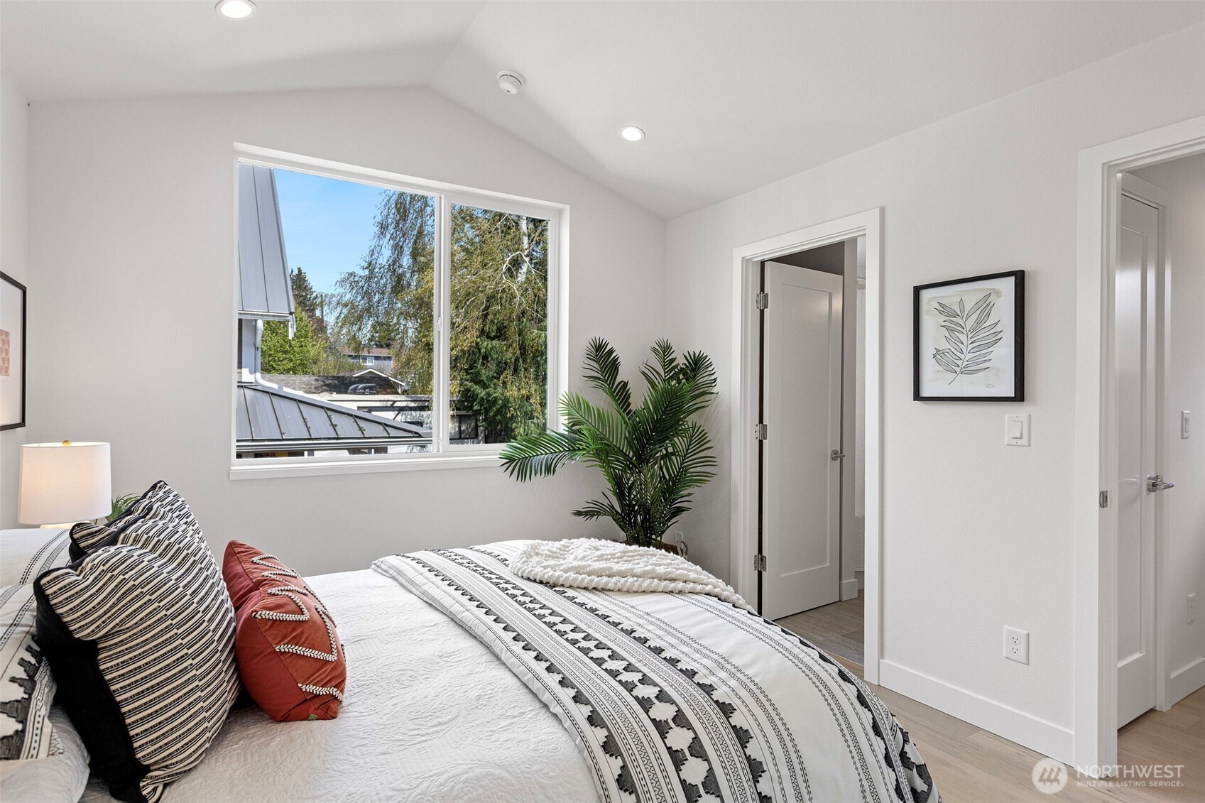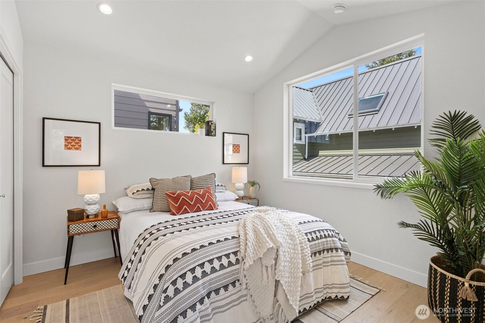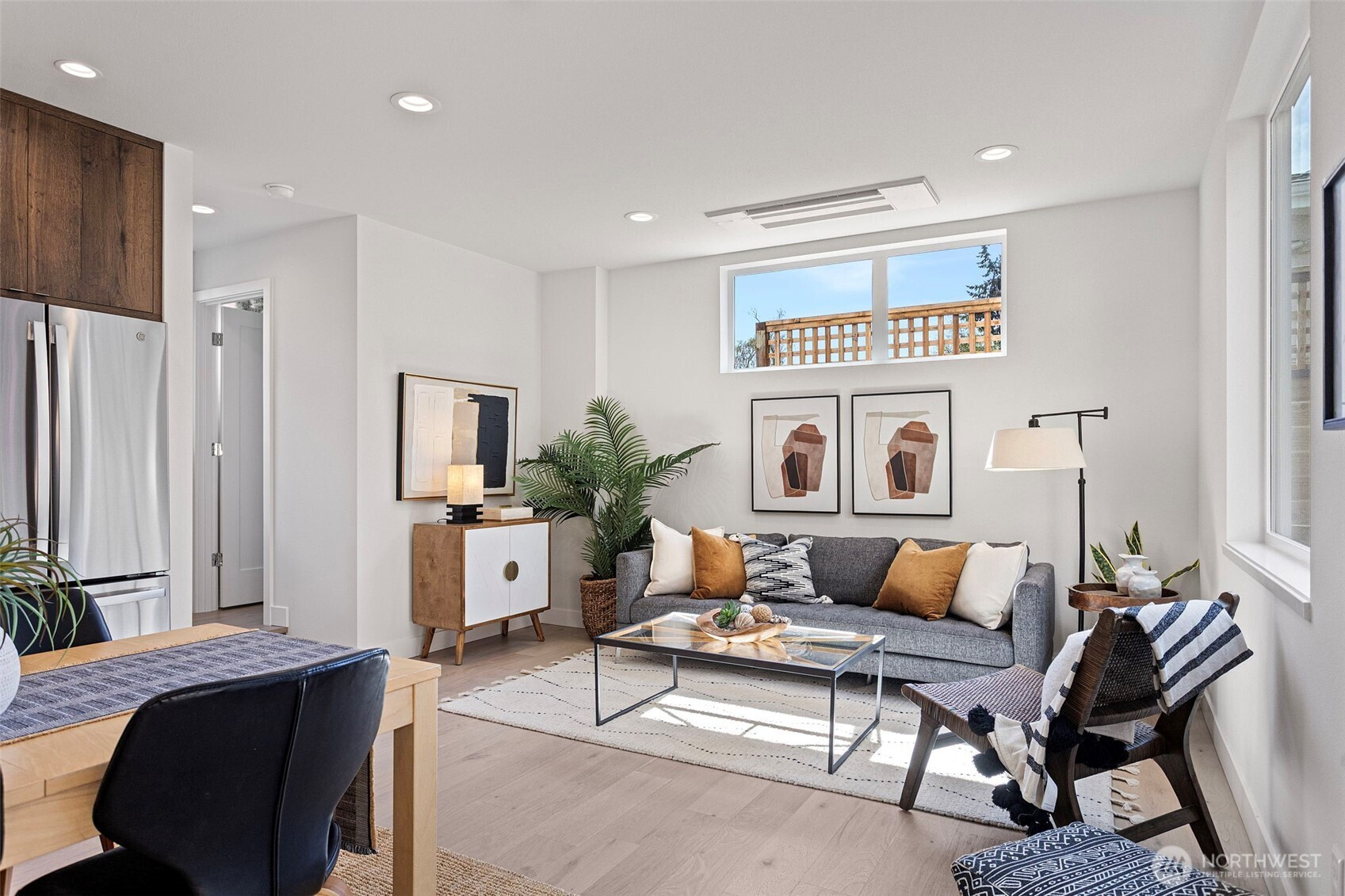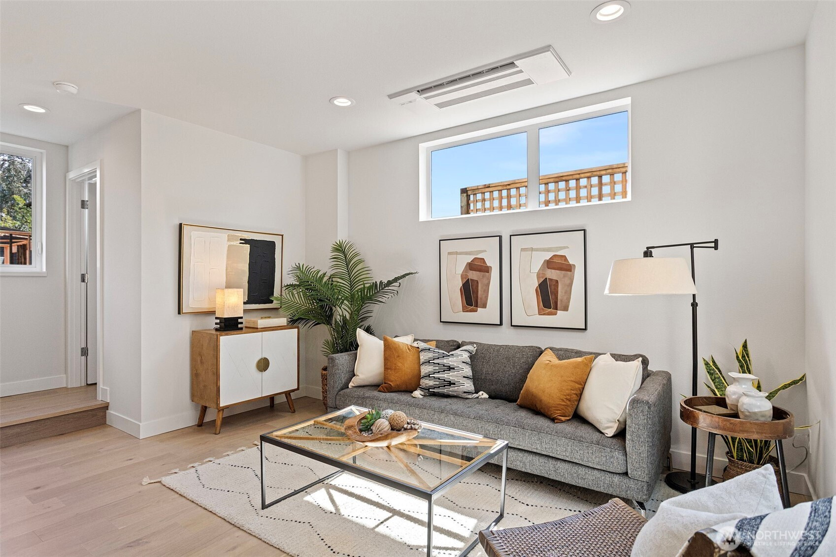 Discover modern living in this beautifully crafted 4-Star Built Green home ideally situated in the highly coveted Sunset Hills neighborhood by AM Northwest Homes! Thoughtfully designed with both style and functionality in mind, this residence offers 2 bedrooms and 2.25 baths, blending contemporary design with everyday comfort. Soaring vaulted ceilings and expansive full-height windows flood the home with natural light, highlighting the open, inviting layout and rich hardwood floors throughout. The stylish kitchen features premium Belmont cabinetry and quality finishes that blend form and function seamlessly and flows effortlessly into the main living area—perfect for entertaining or relaxing at home. The main level also includes a versatile storage or workout room, adding flexibility to the space. Additional highlights include A/C units in the bedrooms, convenient alley-access parking with EV charging, and a location just moments from Ballard’s vibrant shops, restaurants, and nightlife. A perfect balance of thoughtful design, sustainability, and urban convenience.