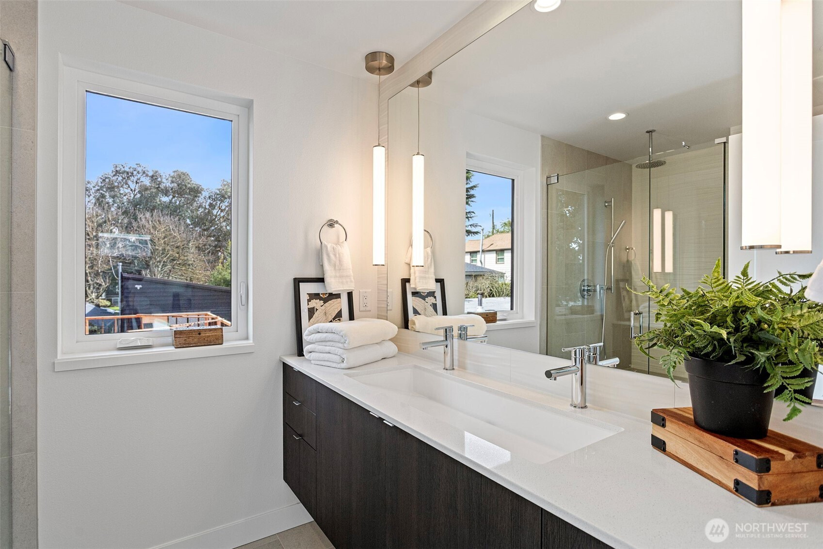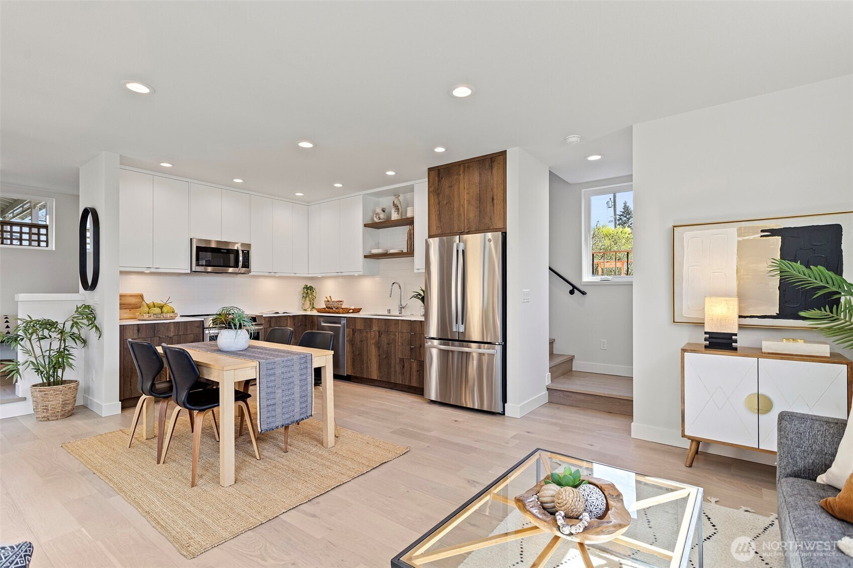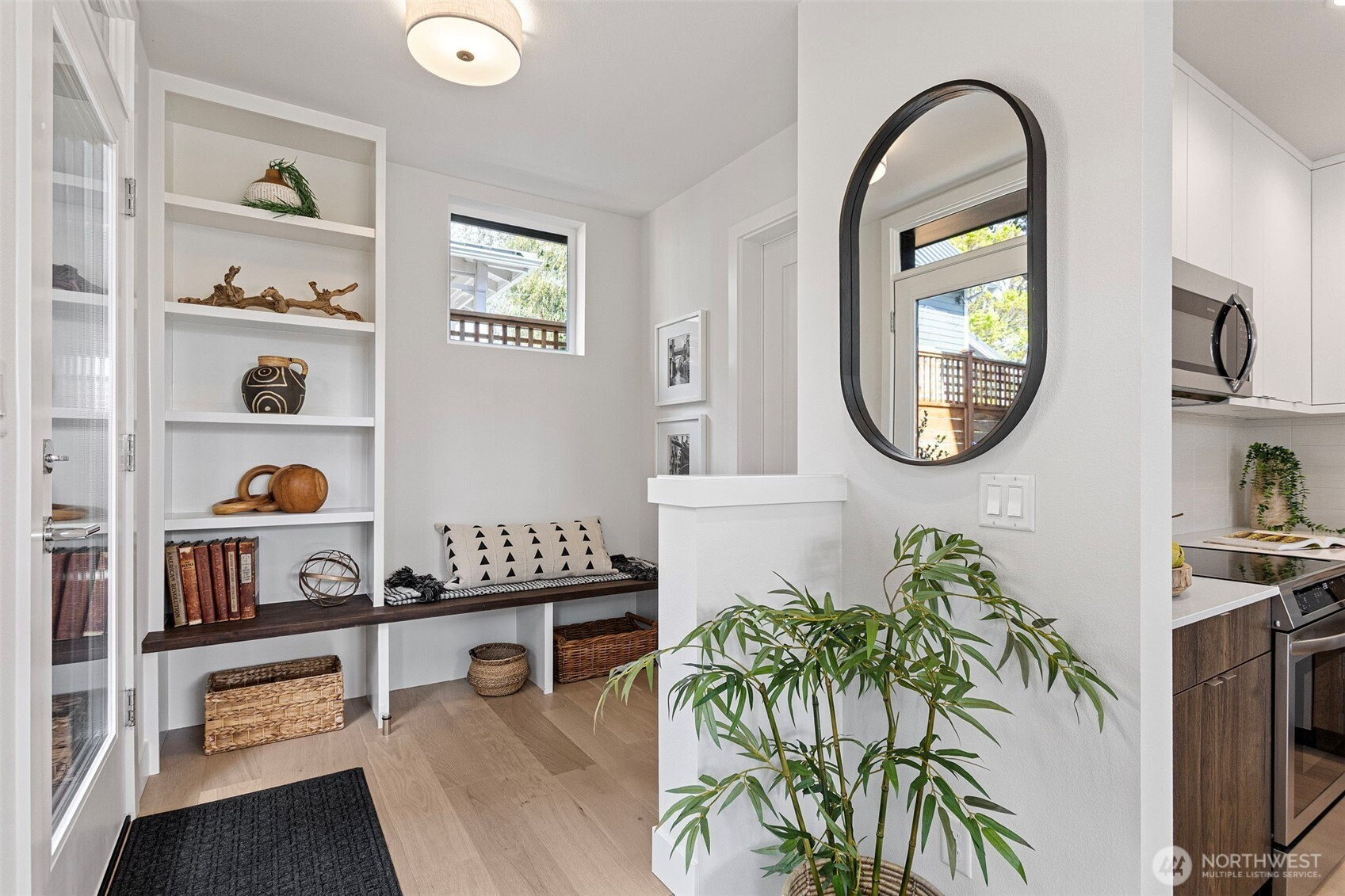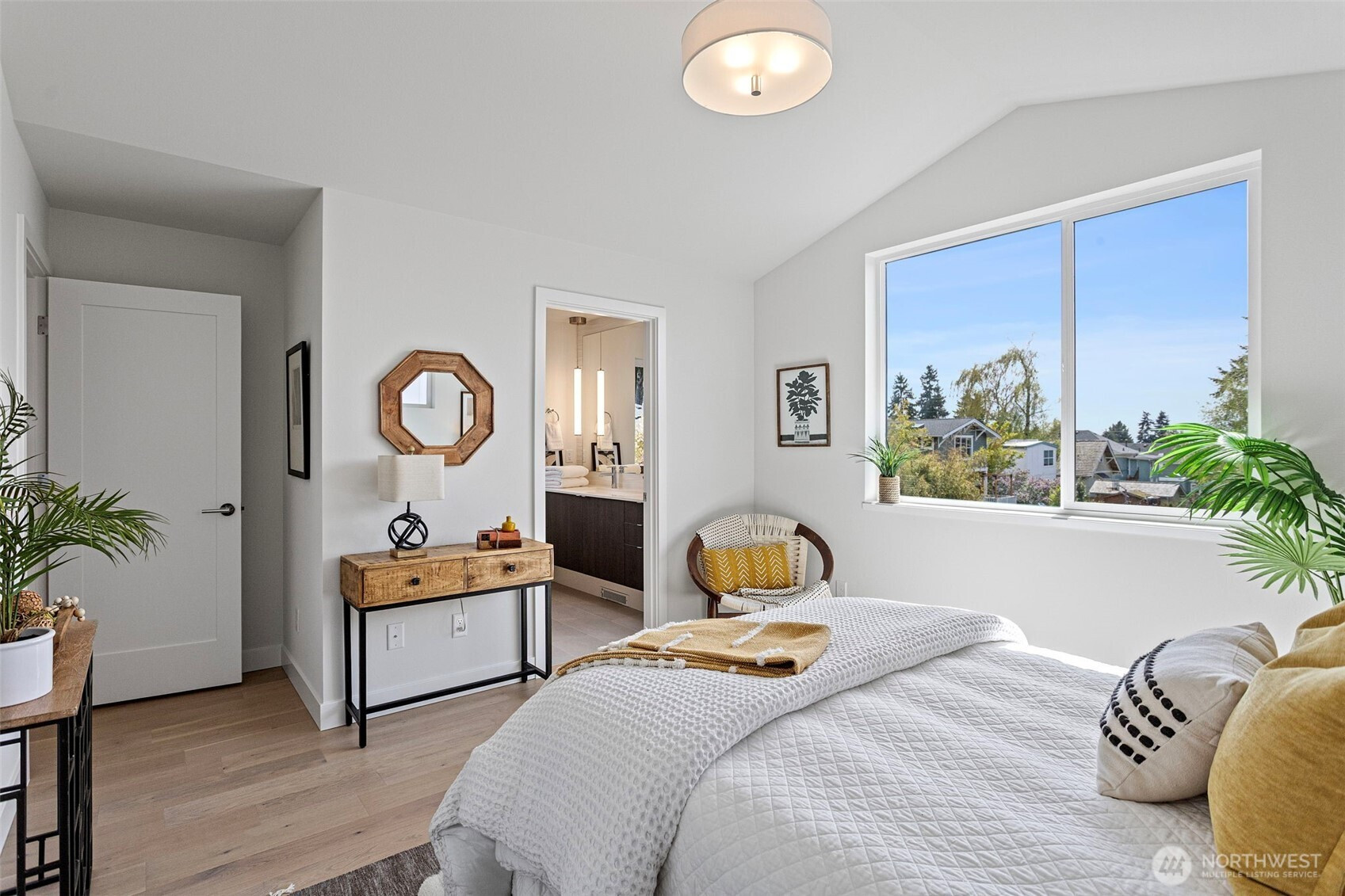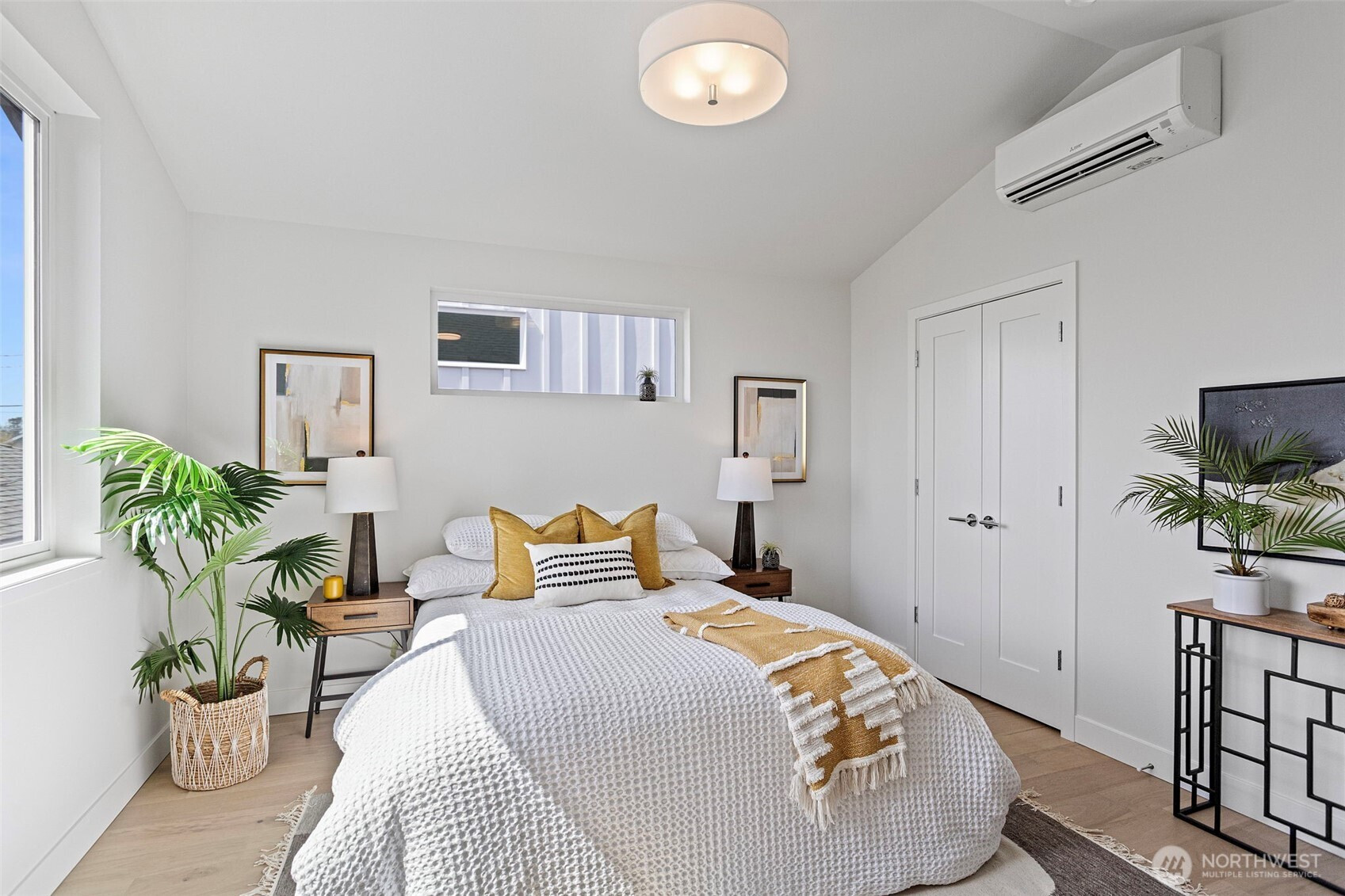 Discover modern living in this beautifully crafted 4-Star Built Green home ideally situated in the highly coveted Sunset Hills neighborhood by AM Northwest Homes! Thoughtfully designed with both style and functionality in mind, this residence offers 2 bedrooms and 2.25 baths, blending contemporary design with everyday comfort. Soaring vaulted ceilings and expansive full-height windows flood the home with natural light, highlighting the open, inviting layout and rich hardwood floors throughout. The stylish kitchen features premium Belmont cabinetry and quality finishes that blend form and function seamlessly and flows effortlessly into the main living area—perfect for entertaining or relaxing at home. The main level also includes a versatile storage or workout room, adding flexibility to the space. Additional highlights include A/C units in the bedrooms, convenient alley-access parking with EV charging, and a location just moments from Ballard’s vibrant shops, restaurants, and nightlife. A perfect balance of thoughtful design, sustainability, and urban convenience.