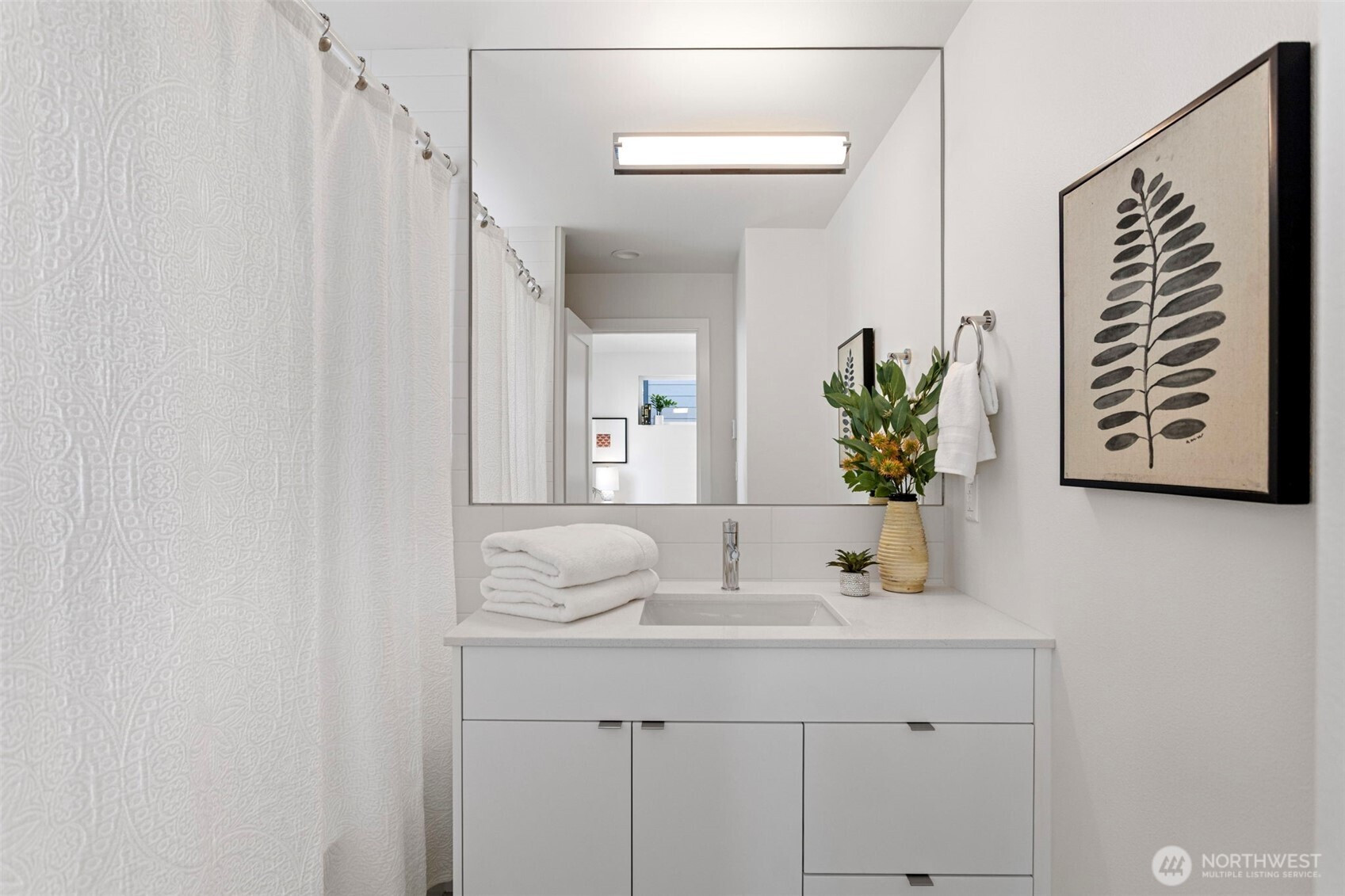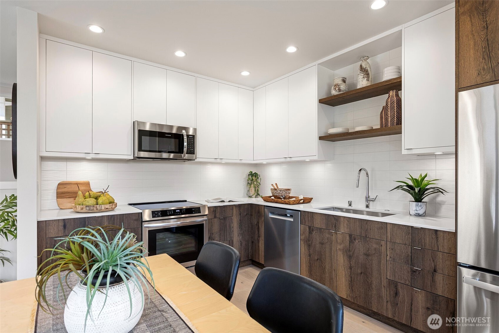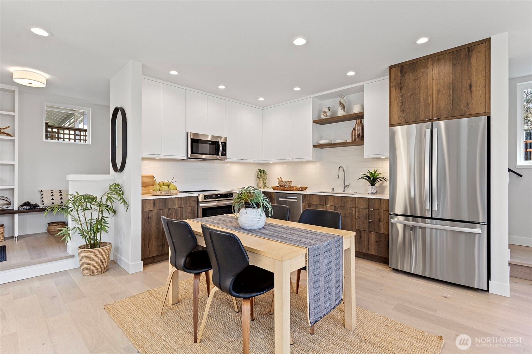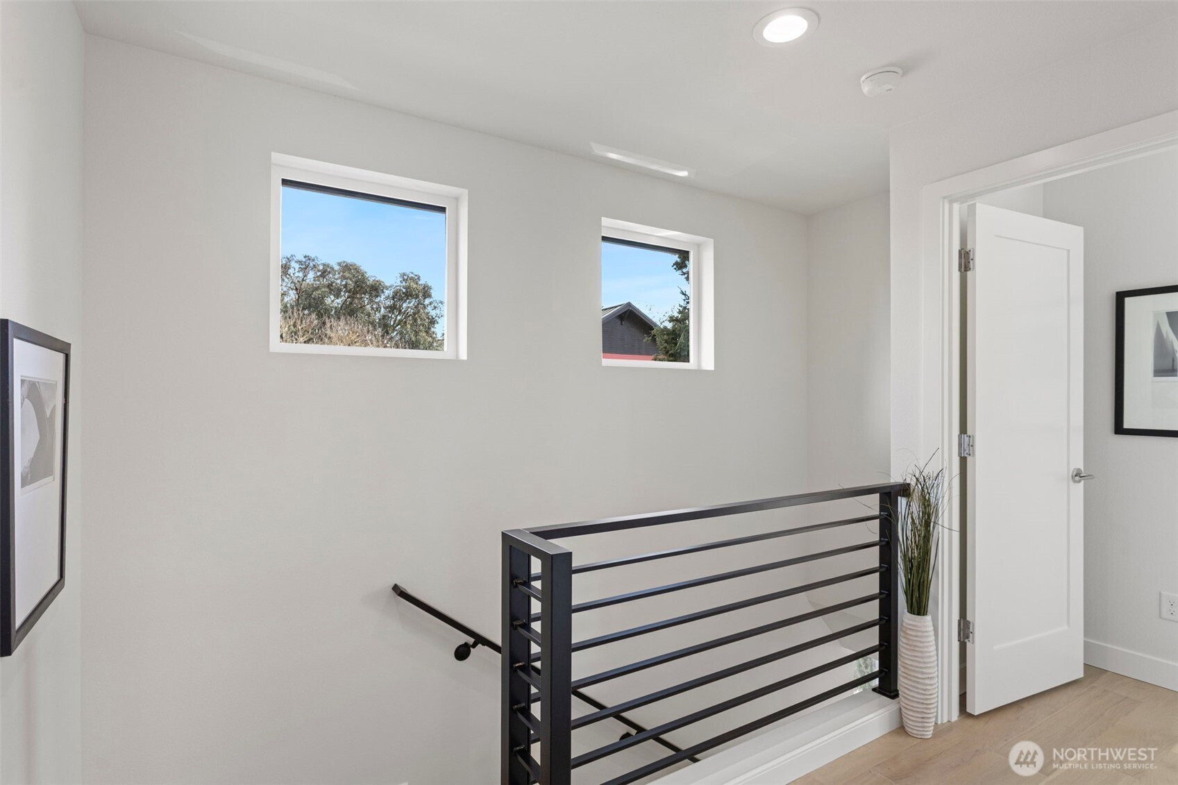 Discover modern living in this beautifully crafted 4-Star Built Green home ideally situated in the highly coveted Sunset Hills neighborhood by AM Northwest Homes! Thoughtfully designed with both style and functionality in mind, this residence offers 2 bedrooms and 2.25 baths, blending contemporary design with everyday comfort. Soaring vaulted ceilings and expansive full-height windows flood the home with natural light, highlighting the open, inviting layout and rich hardwood floors throughout. The stylish kitchen features premium Belmont cabinetry and quality finishes that blend form and function seamlessly and flows effortlessly into the main living area—perfect for entertaining or relaxing at home. The main level also includes a versatile storage or workout room, adding flexibility to the space. Additional highlights include A/C units in the bedrooms, convenient alley-access parking with EV charging, and a location just moments from Ballard’s vibrant shops, restaurants, and nightlife. A perfect balance of thoughtful design, sustainability, and urban convenience.
