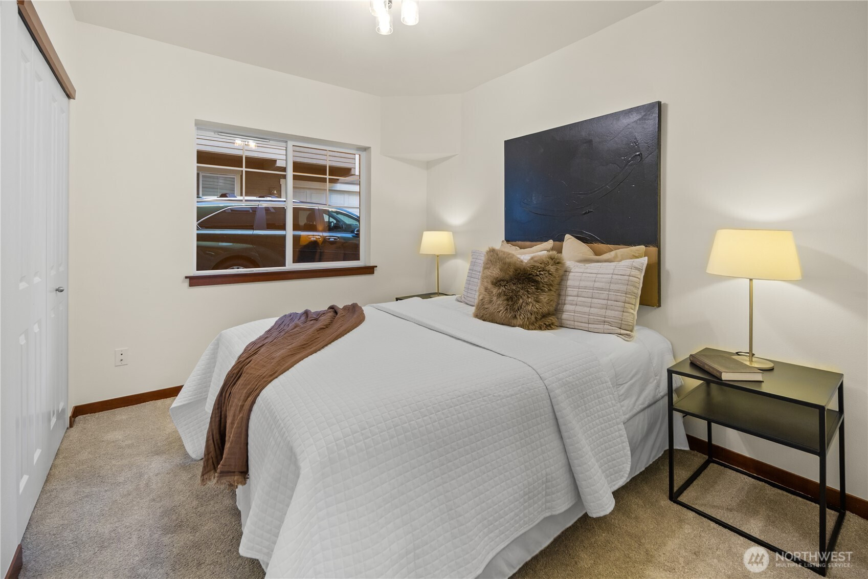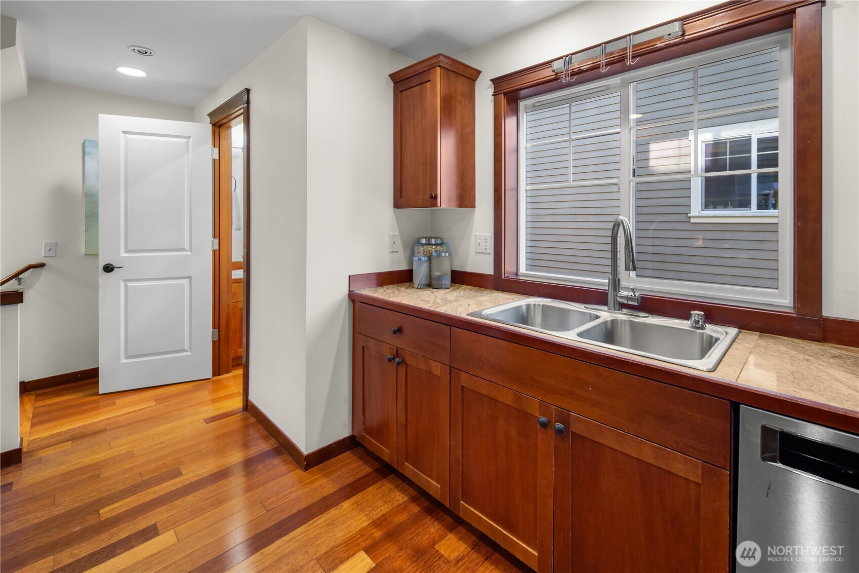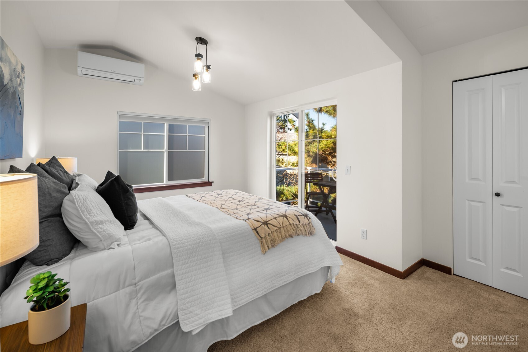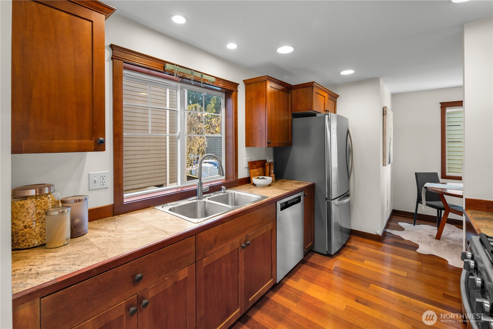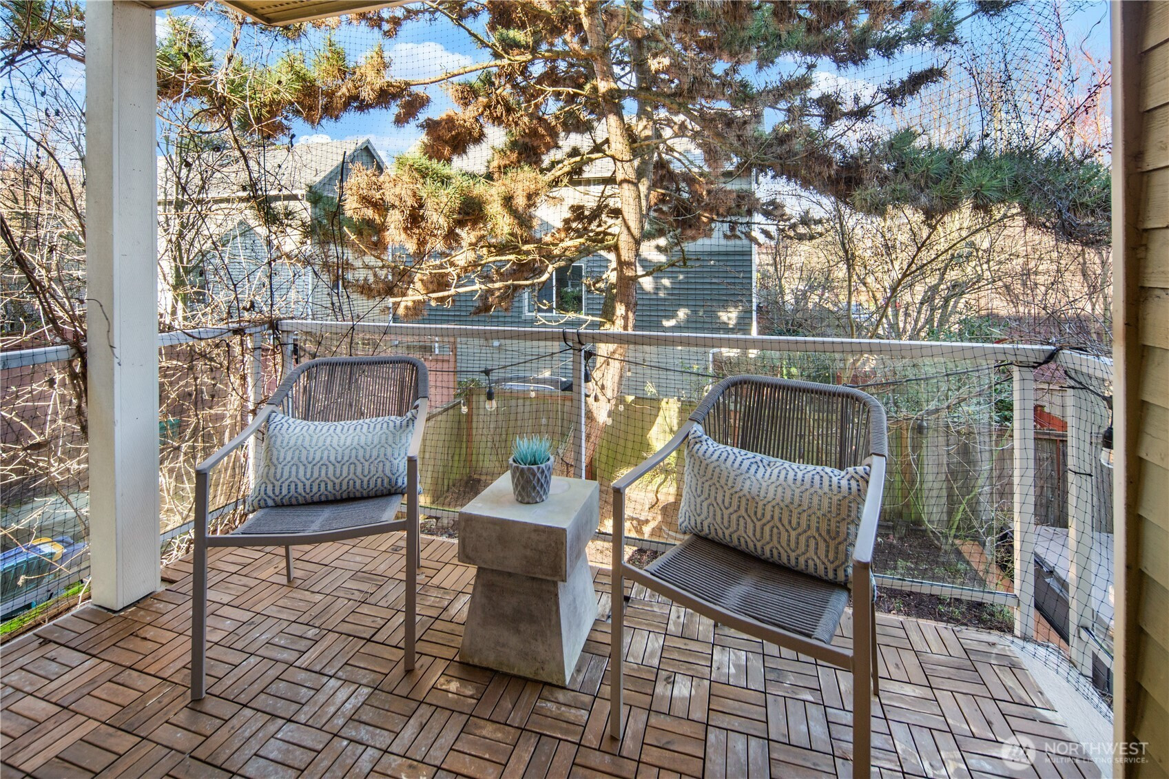 Stop your scroll, this 2005 townhome is not like the others! Enjoy an extra large fully fenced private backyard with mature foliage, gardening space and patio. Plus, covered decks on the second and third level for all-season enjoyment. On the top floor, both bedrooms have en suite baths for ultimate flexibility. Third bedroom on lower level has high ceilings and could function as office or guest space. Thoughtfully updated with mini splits for cooling and heating. Newer refrigerator, stove and water heater; move in and enjoy! Set back from the street for privacy and attached one car garage. Fun Greenwood location near 92nd street North Seattle Neighborhood Greenway, Greenwood Park and convenient commuting access via 99. No HOA!