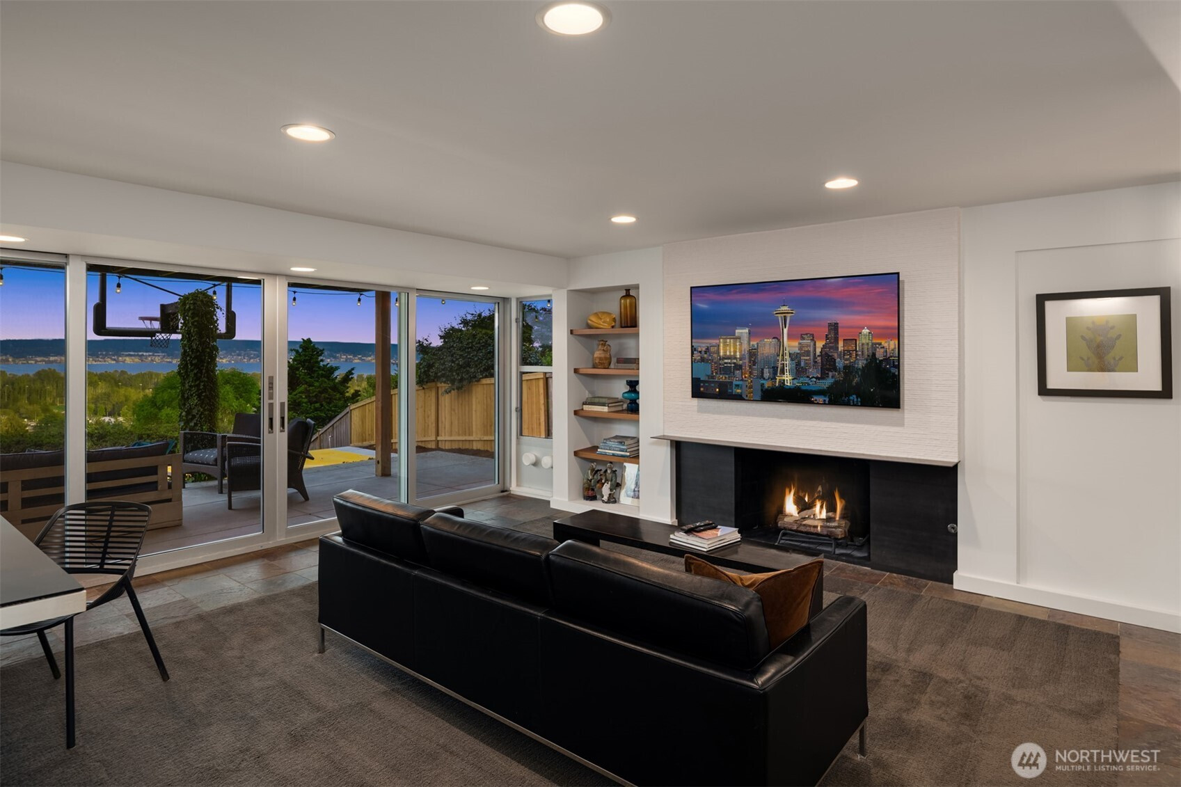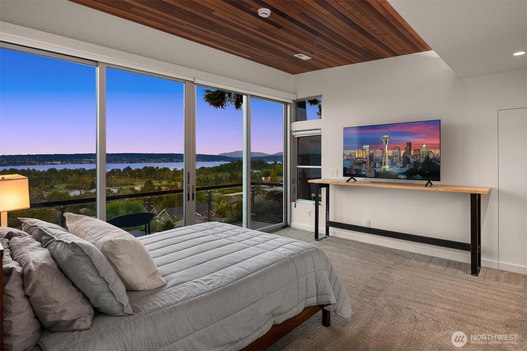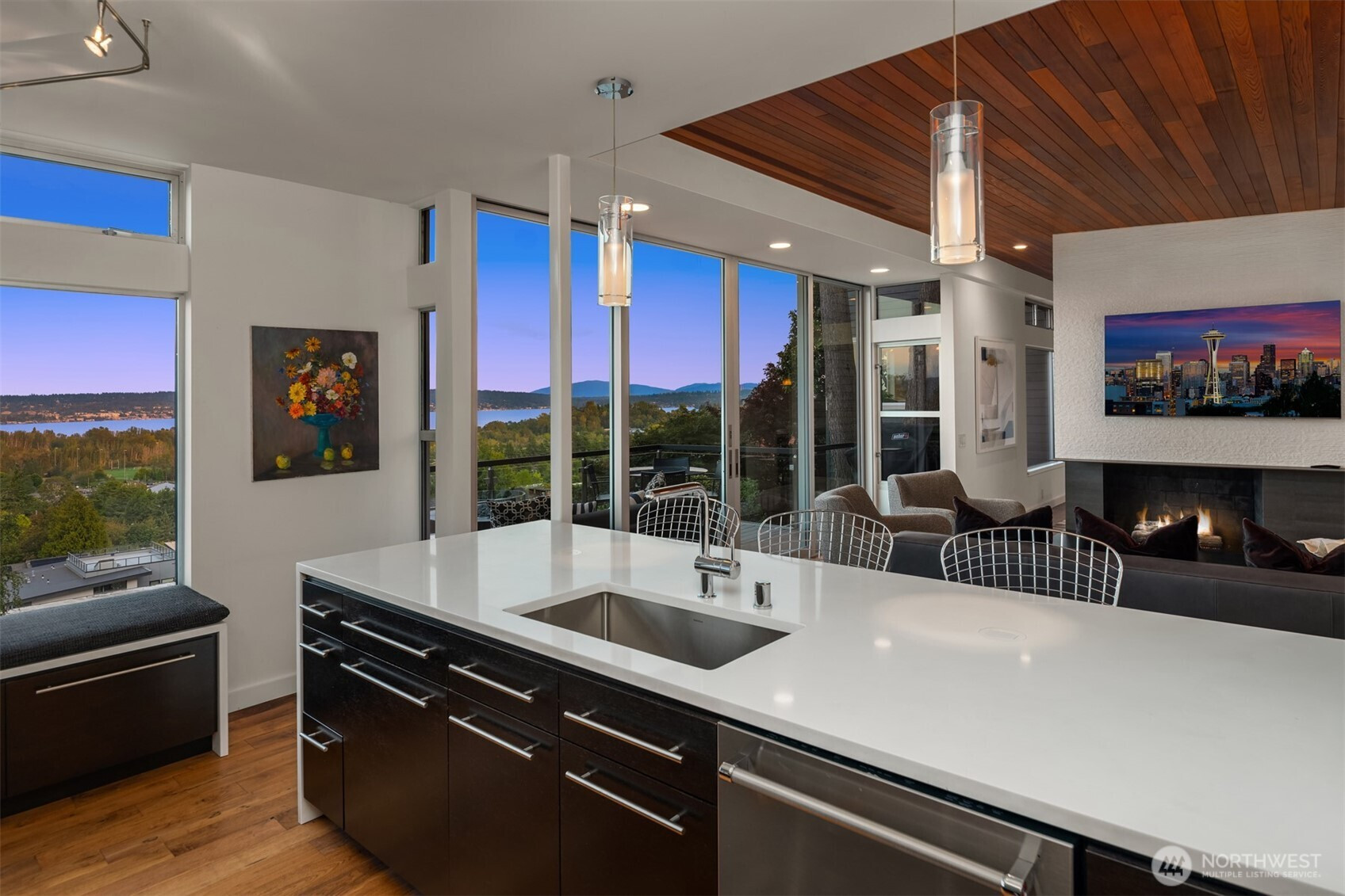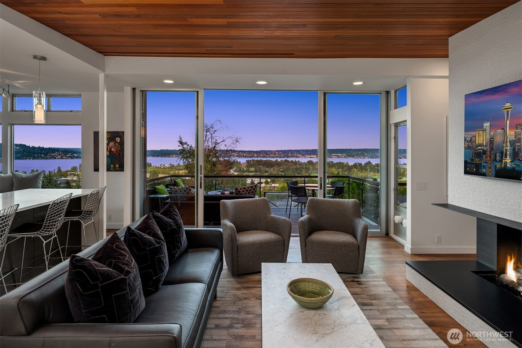 A rare View Ridge retreat where design, quality & setting converge. Panoramic 180° views of Lake Washington & Magnuson Park pour through walls of glass, framing everyday living in natural beauty. Completed in 2025, this custom remodel feels better than new with cedar ceilings, radiant hardwoods & seamless indoor-outdoor flow via Western Alum sliders. The primary suite is a serene haven of light. Lower level offers 3 bedrooms, media lounge & patio. Entertain on 2 view decks or retreat to the gym with soaring ceilings. Private yard with basketball court, 2-car garage, A/C & premium finishes throughout—crafted for those who covet views & expect the best.