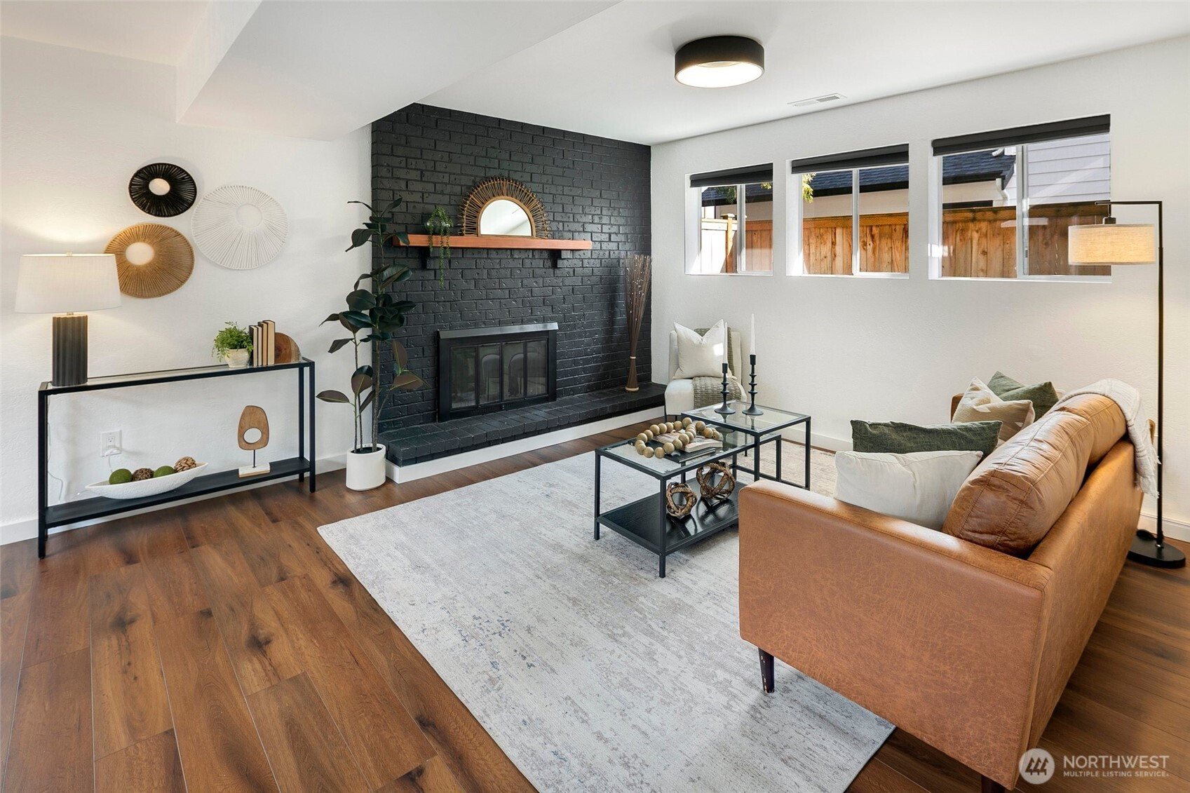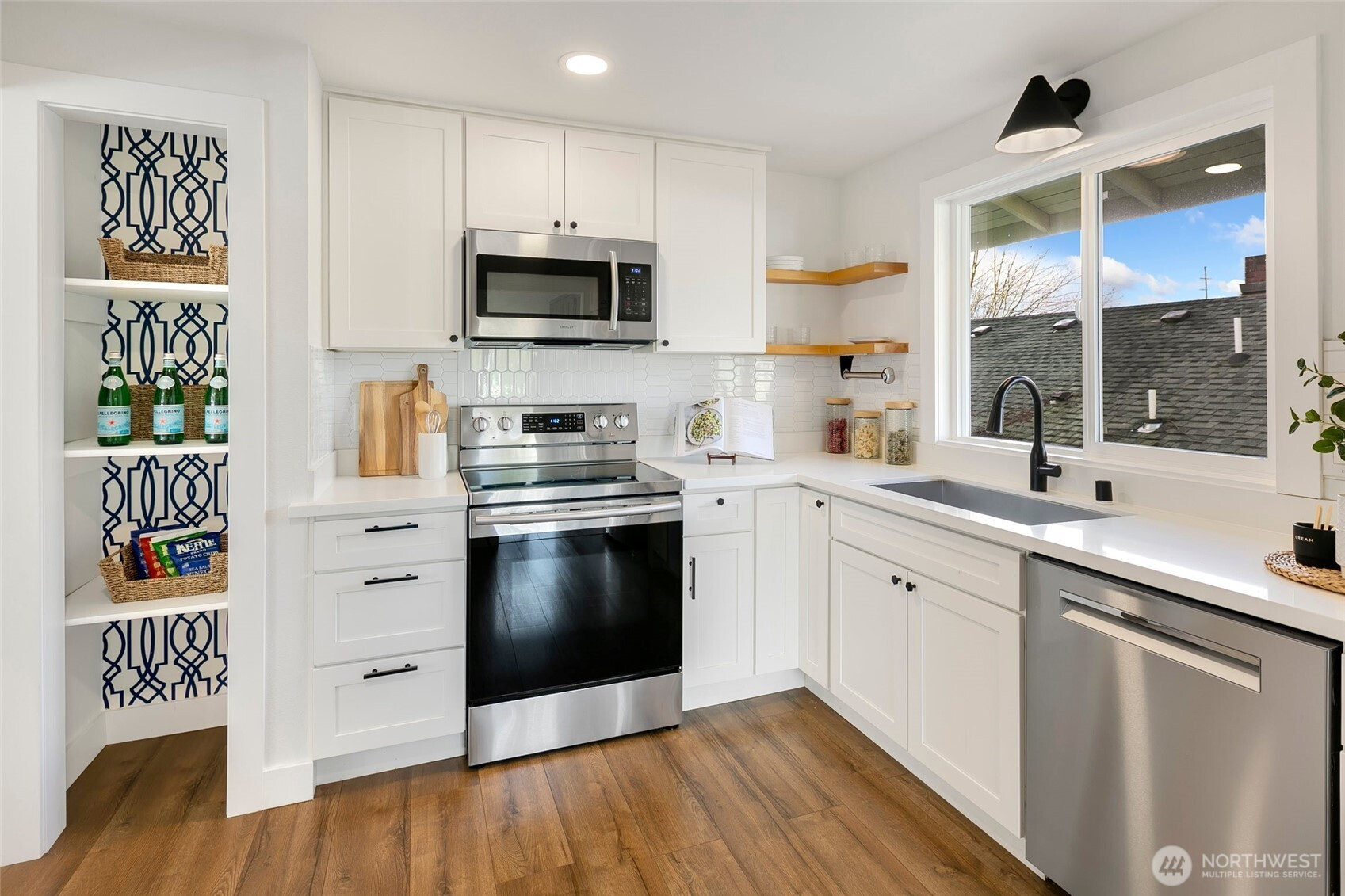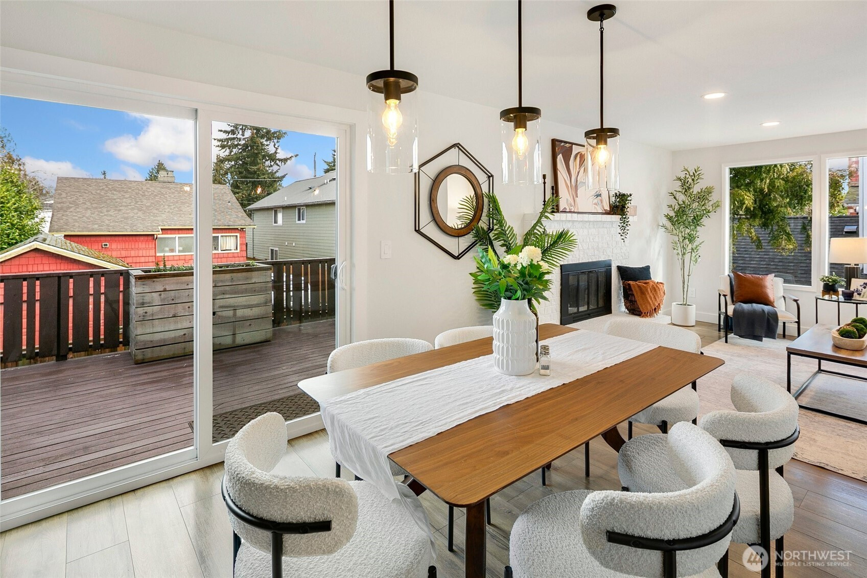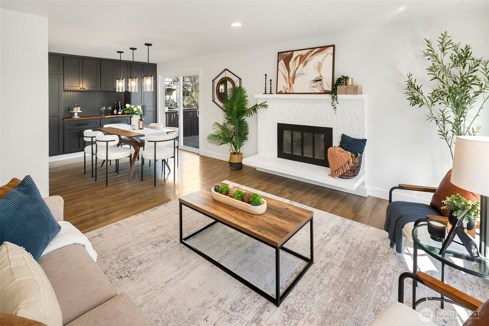 Reimagined Greenwood beauty with designer-level finishes throughout. Sun-drenched interiors and warm wide-plank flooring set the tone, while a striking statement fireplace anchors the main living space. The updated kitchen shines with crisp white cabinetry, stainless appliances, open shelving, and stylish accents that blend modern elegance with everyday functionality. Three bedrooms and two beautifully refreshed bathrooms on the main level include a serene primary suite with en-suite bath. The lower level offers exceptional versatility with a spacious rec room featuring a dramatic second fireplace, custom navy wet bar with wood counters, and built-in shelving, ideal for entertaining, guests, or multi-generational living. A dedicated office and additional bath complete the space. Step outside to a charming back deck and fully fenced yard, perfect for gatherings or quiet mornings. A massive two-car garage provides abundant storage and convenience. All just minutes to Green Lake, Trader Joe’s, parks, and the vibrant dining scene that makes Greenwood so loved.