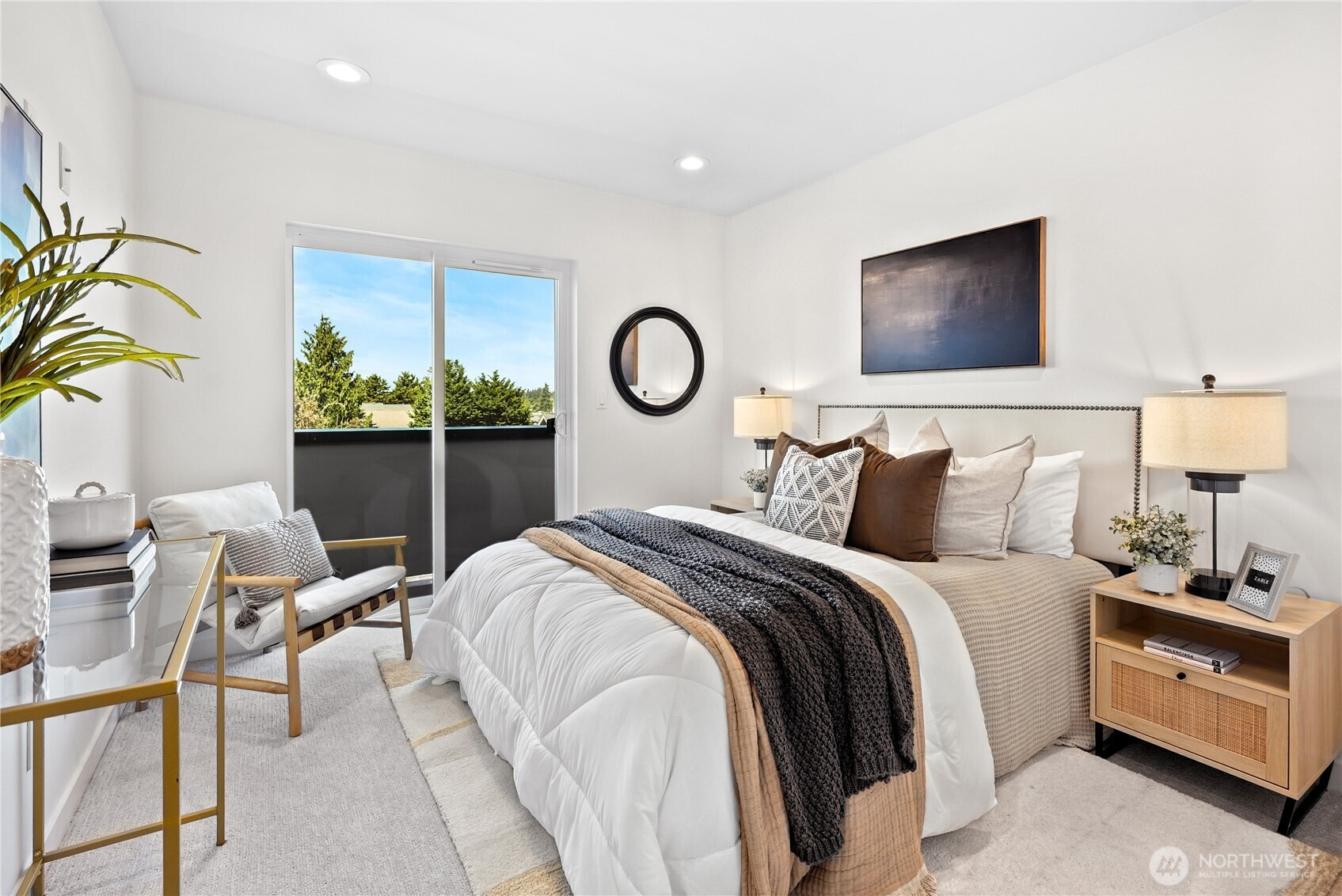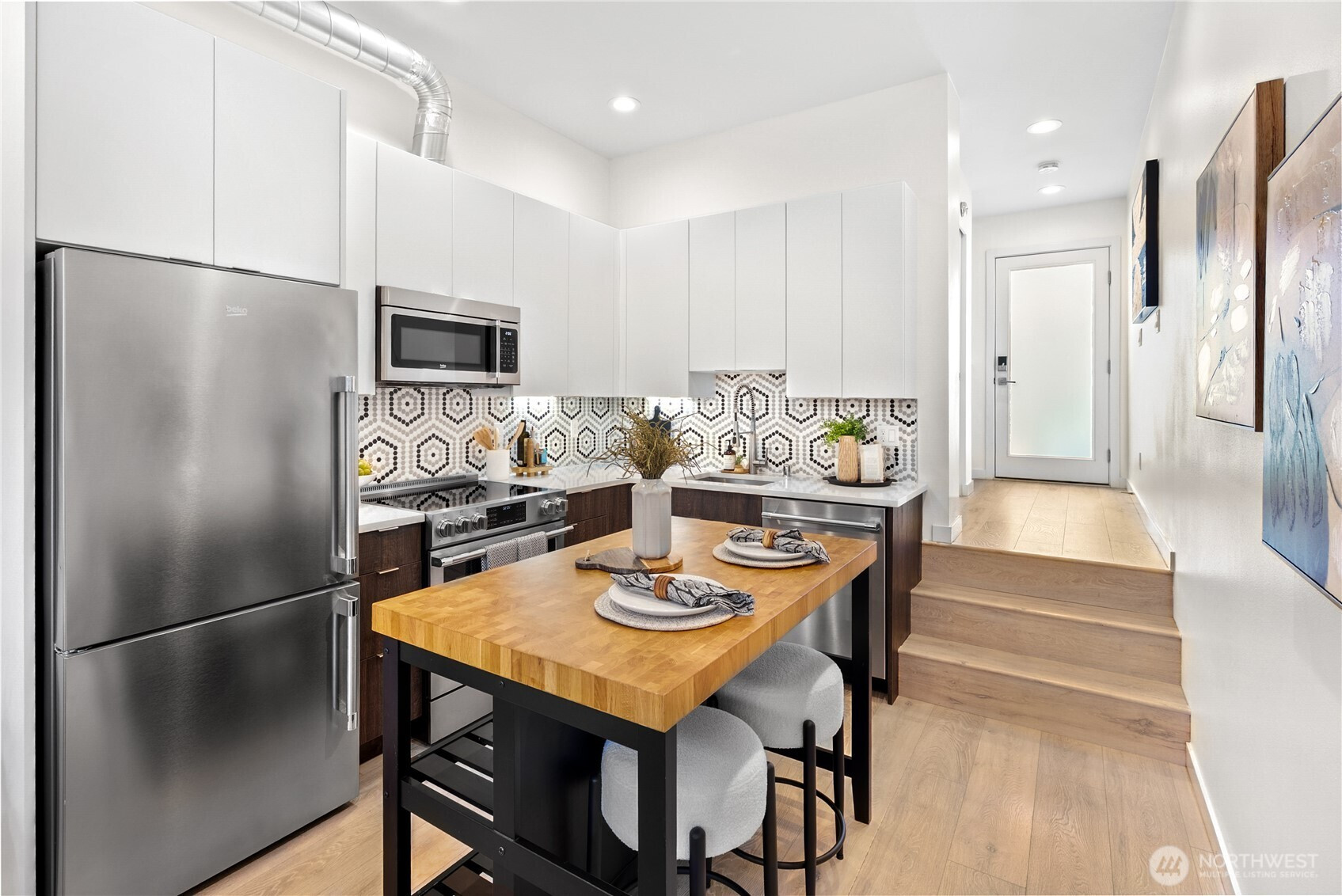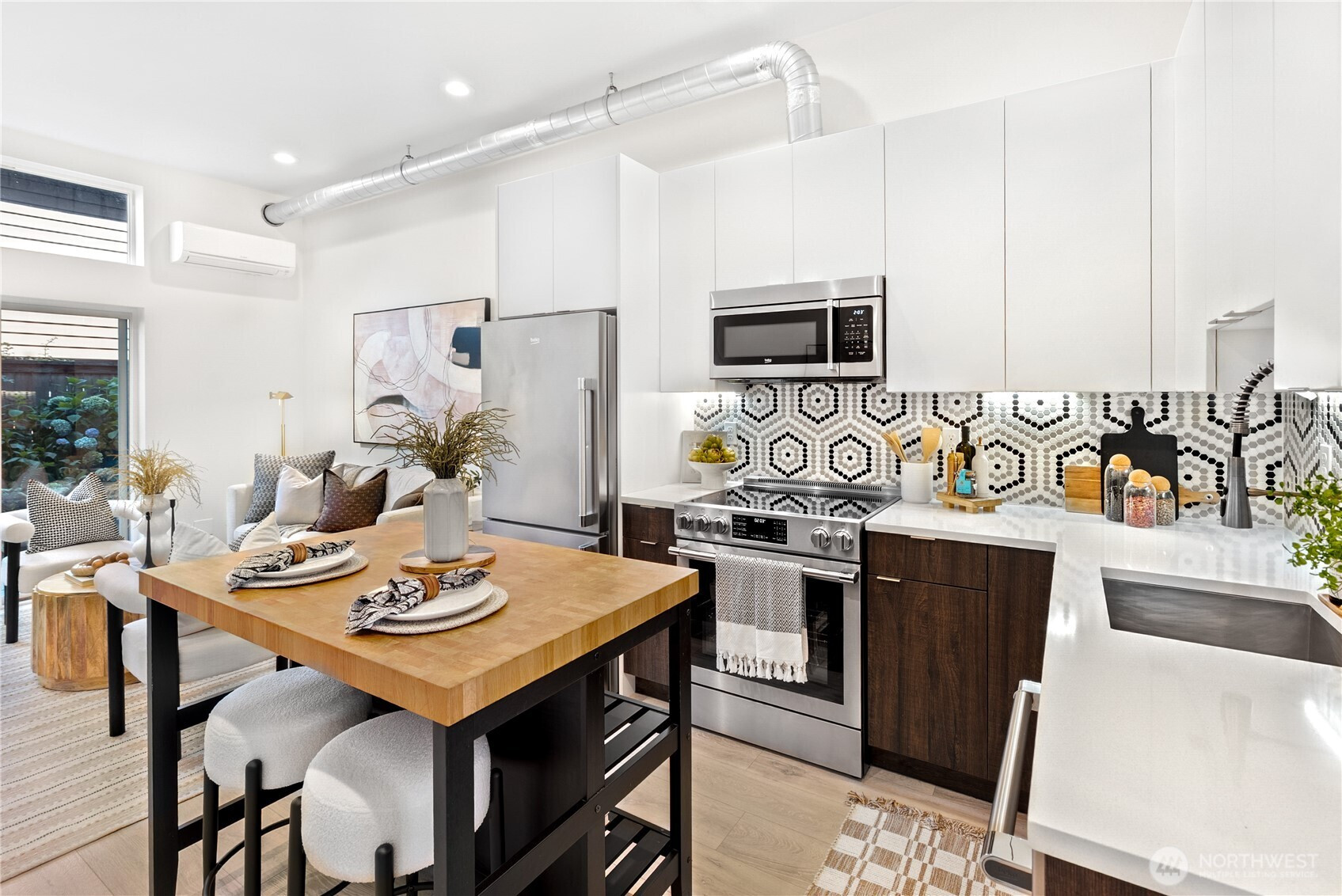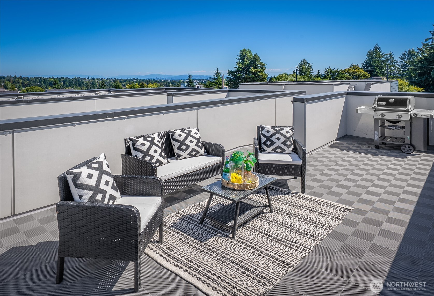 Escape to this chic Greenwood townhome, tucked away for privacy. This light-filled unit lives large with an open floor plan featuring a modern kitchen, breakfast bar, and inviting living area on the main level. Enjoy easy access to a fully fenced patio with a custom-built shed. The upper levels offer spacious bedrooms each with en-suite bathrooms plus a sunny balcony just off the primary. The crown jewel is the rooftop deck with stunning 360° views of the Olympics, downtown skylines, Cascades and Mount Rainier. No HOA. 4-Star Built Green for high energy efficiency and equipped with A/C. Just blocks from Greenwood Park and the shops, restaurants, breweries, and cafes along Greenwood Ave.