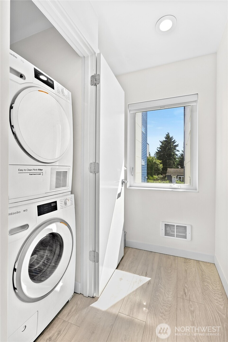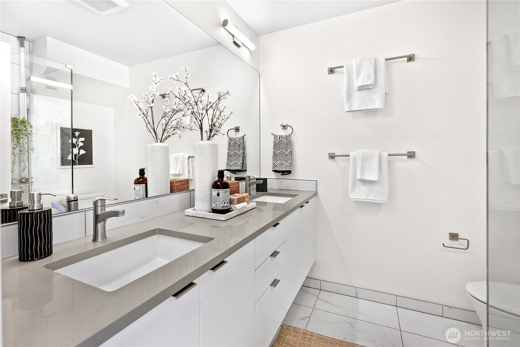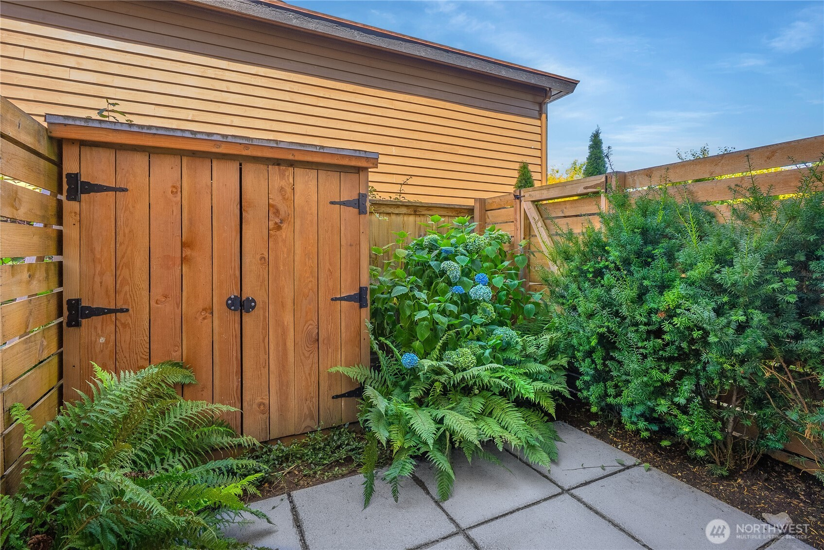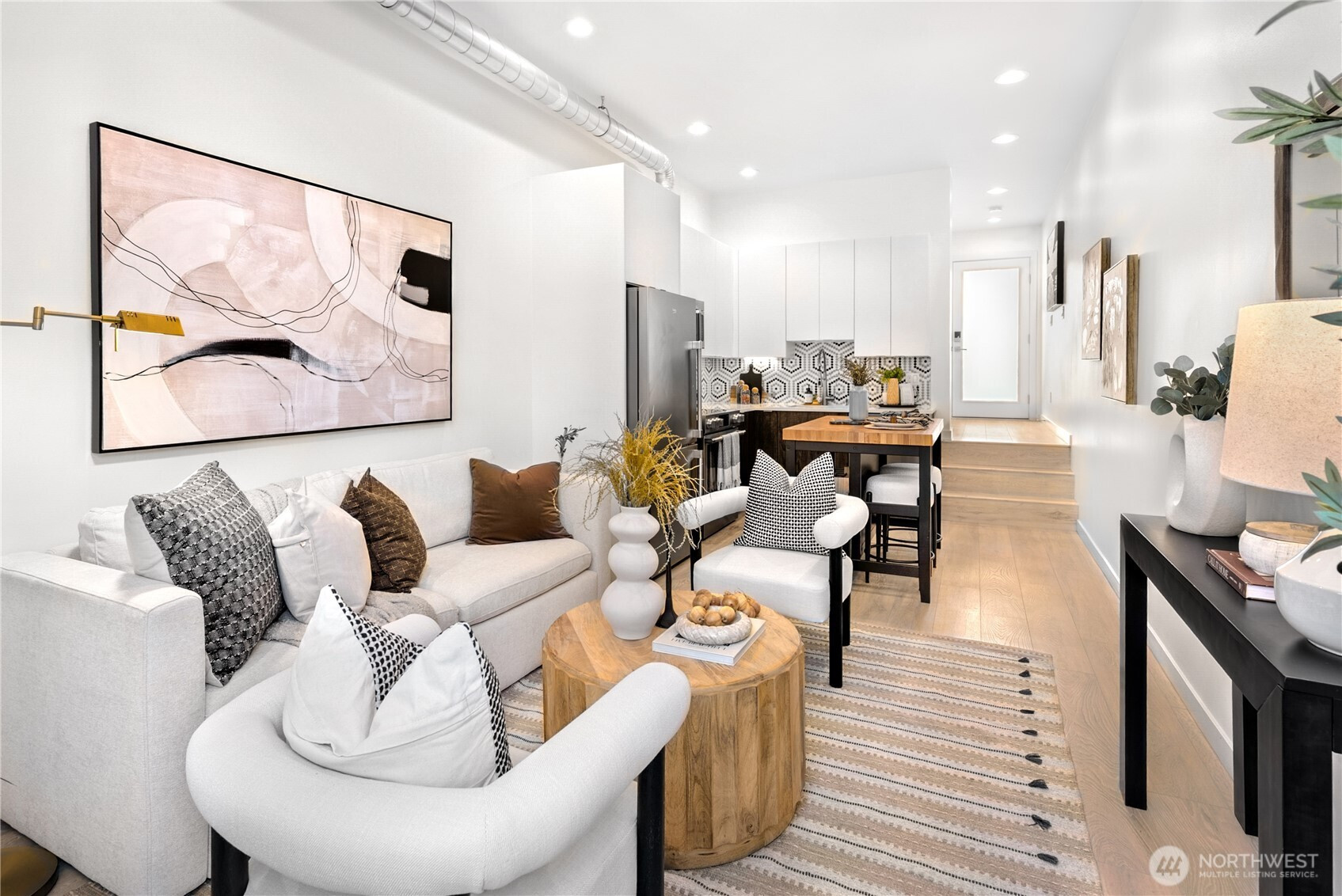 Escape to this chic Greenwood townhome, tucked away for privacy. This light-filled unit lives large with an open floor plan featuring a modern kitchen, breakfast bar, and inviting living area on the main level. Enjoy easy access to a fully fenced patio with a custom-built shed. The upper levels offer spacious bedrooms each with en-suite bathrooms plus a sunny balcony just off the primary. The crown jewel is the rooftop deck with stunning 360° views of the Olympics, downtown skylines, Cascades and Mount Rainier. No HOA. 4-Star Built Green for high energy efficiency and equipped with A/C. Just blocks from Greenwood Park and the shops, restaurants, breweries, and cafes along Greenwood Ave.