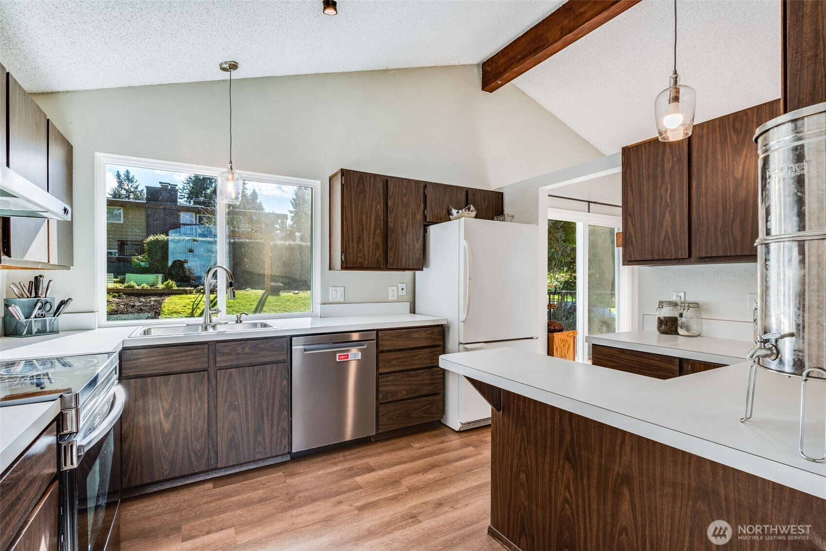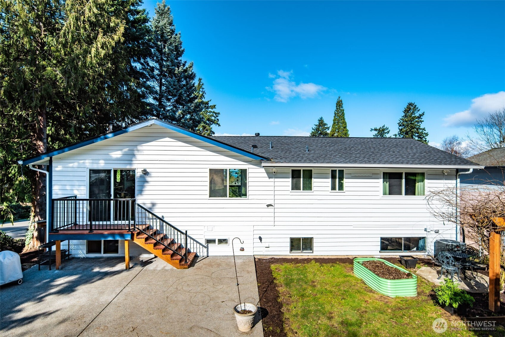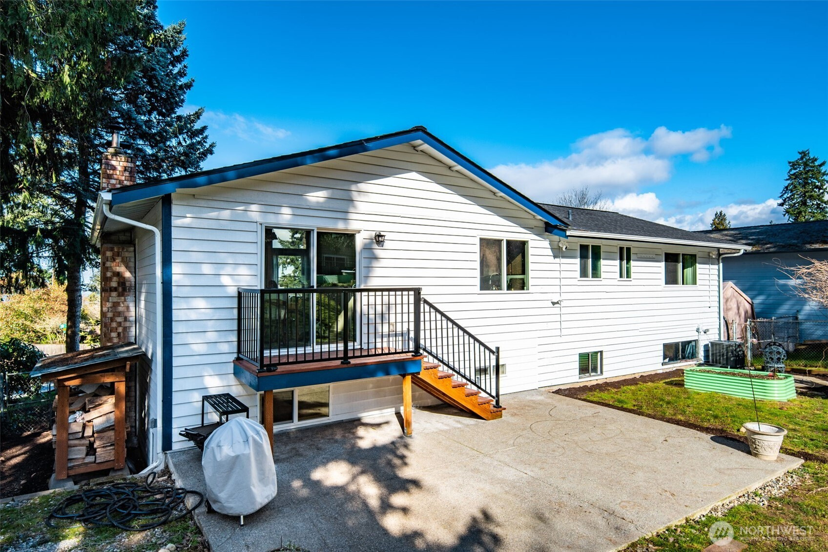 Light and bright home with the major updates already completed!! New 50 year roof w transferable warranty, new furnace & AC, new windows & garage doors, new LVP flooring, carpeting, paint, & beautifully finished lower level primary suite w primary bath. Peekaboo views of the Sound & Mt Baker! Additional primary suite upstairs w attached updated bath & 2 more upper bedrooms. Coveted Redondo area on a large corner lot w RV parking & RV electrical hookup. Room to play outside & entertain on the large backyard patio, fully fenced. Fantastic location near desired amenities and great for commuting North or South!