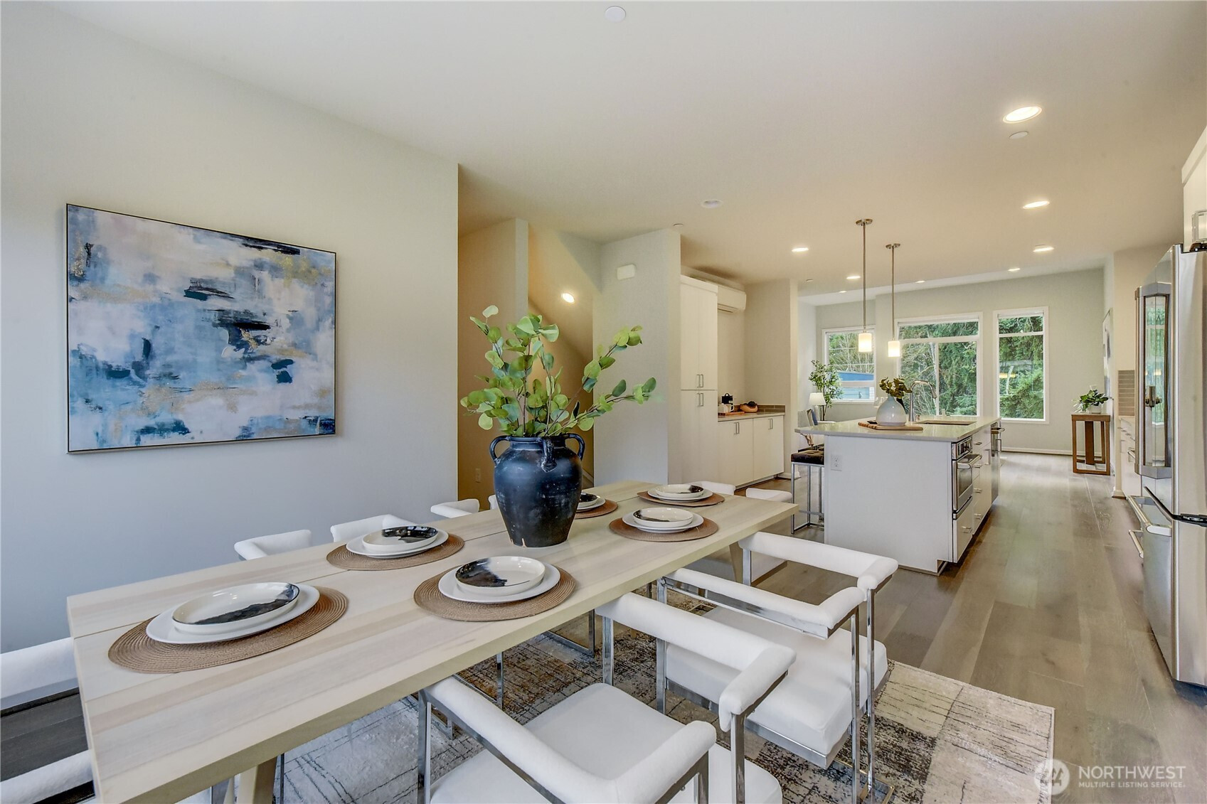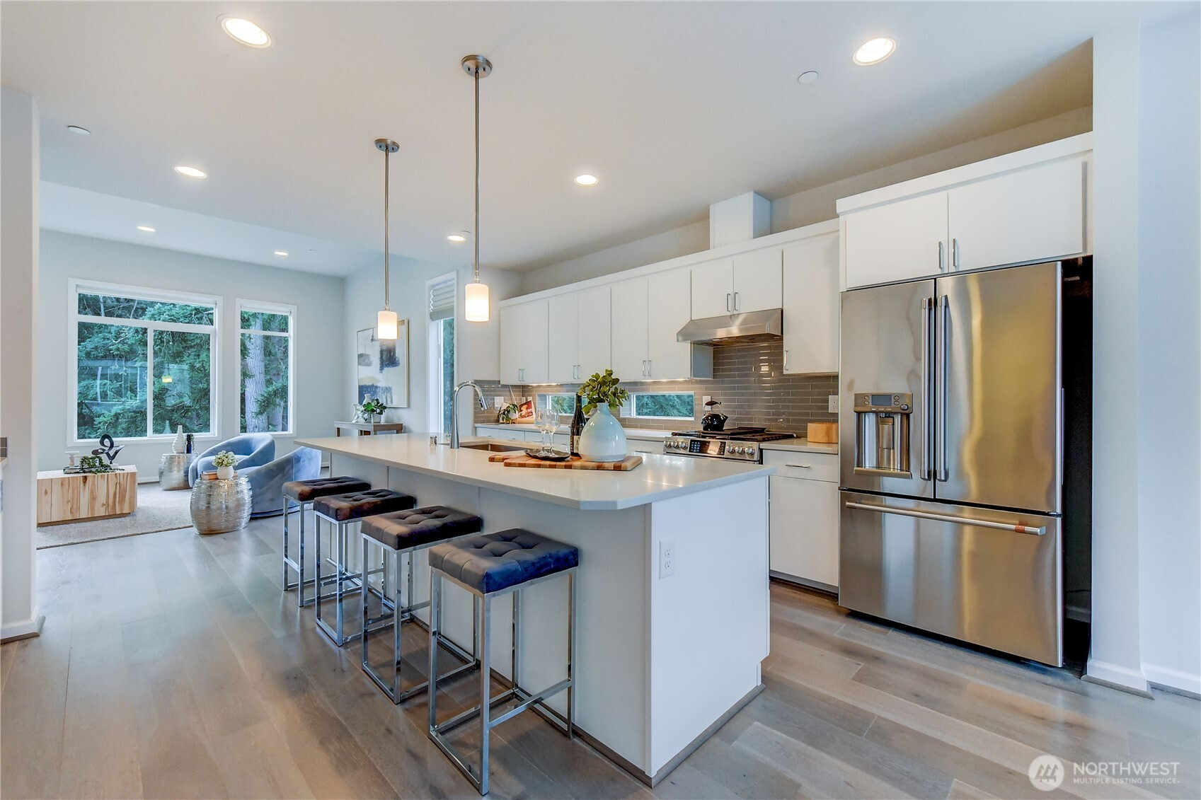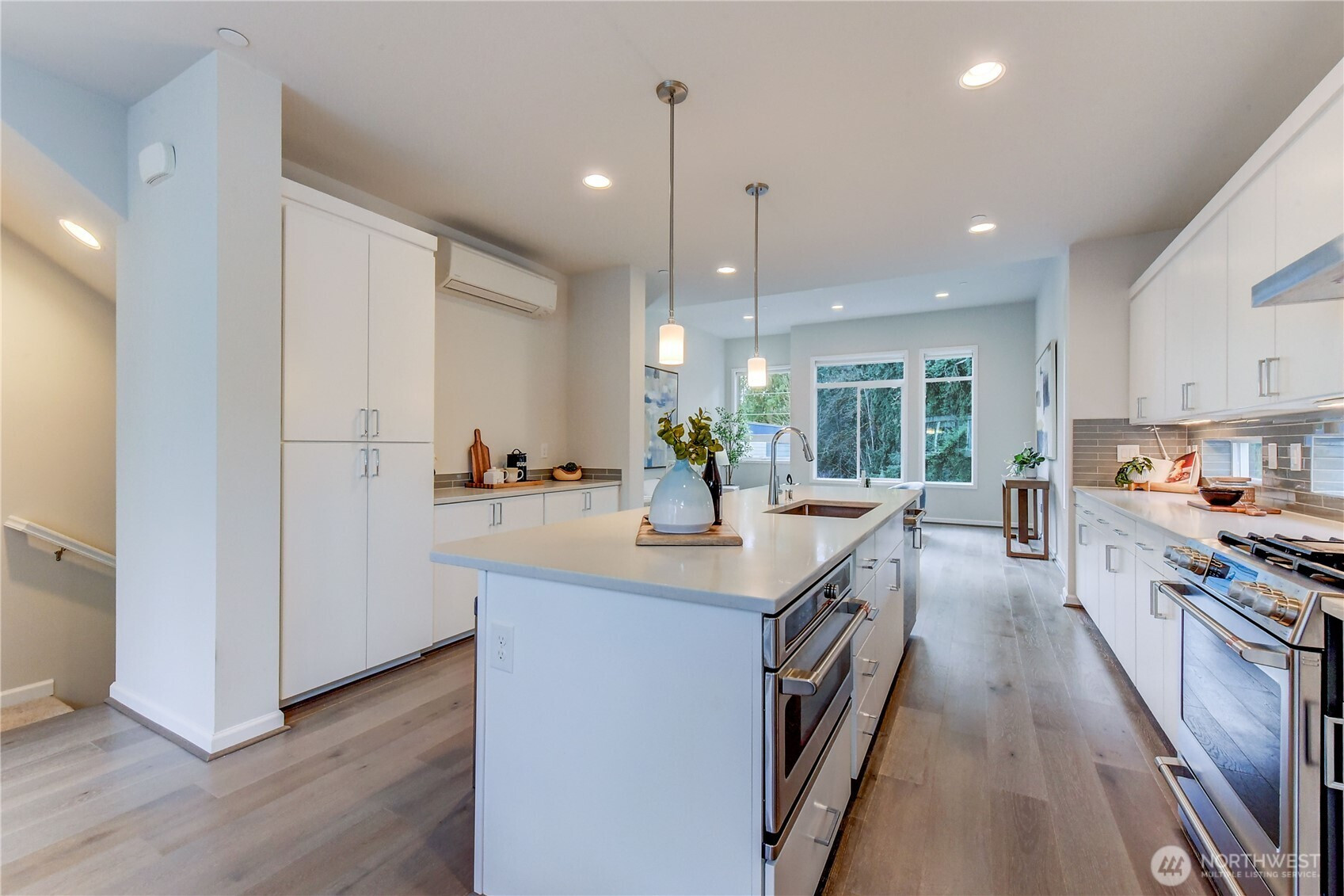 Stylish end-unit townhouse in the sought-after Kirkland/Juanita area, offering privacy and the feel of a single-family home with peaceful tree views. This modern open-concept design showcases upscale finishes and is perfect for entertaining. The gourmet kitchen features quartz countertops, high-end stainless-steel appliances including a gas range, a large center island, and pantry cabinetry. Light-filled living room with soaring 11’ ceilings and a spacious dining area. Enjoy outdoor living on the expansive rooftop deck equipped with gas, water, and power. The two-car tandem garage provides extra storage space. Mini-split systems deliver efficient air conditioning throughout, with an additional unit added to the second bedroom for enhanced comfort. Conveniently located near Lake Washington, Juanita Beach Park, local dining, shopping, and the many walking and hiking trails at the O.O. Denny Park Loop Trail. Top-rated Lake Washington schools. No rental cap offers excellent investment potential. Plenty of guest parking. Fresh interior paint makes this home move-in ready.