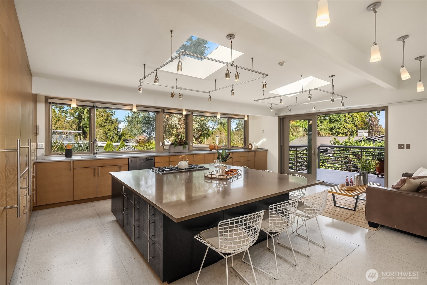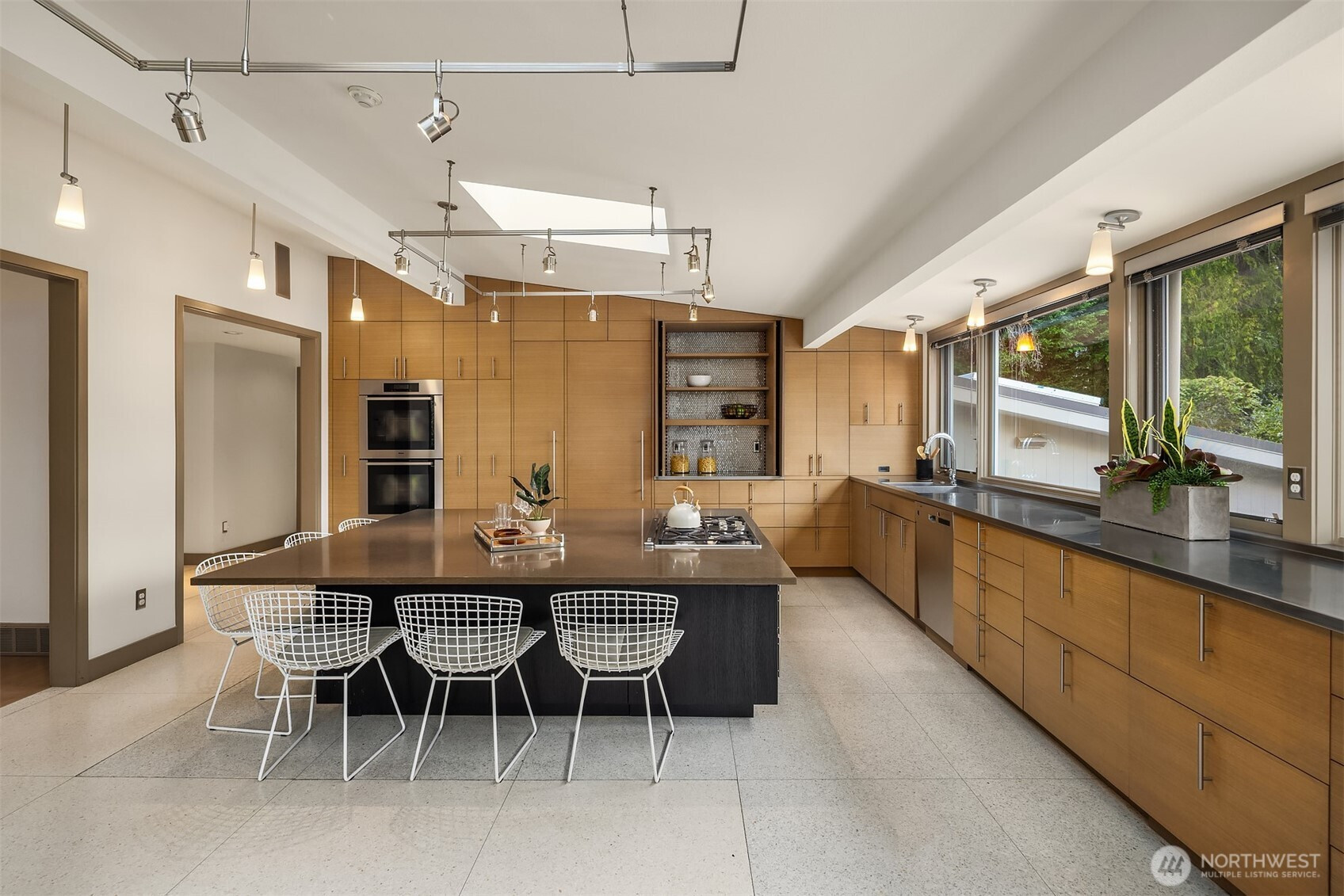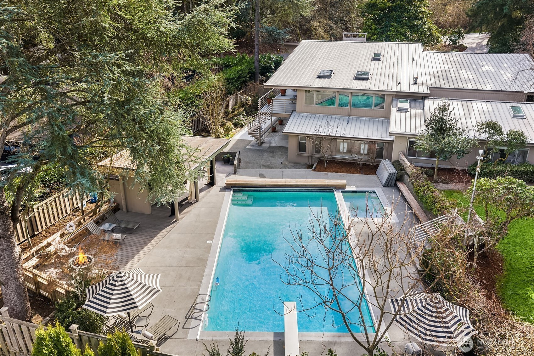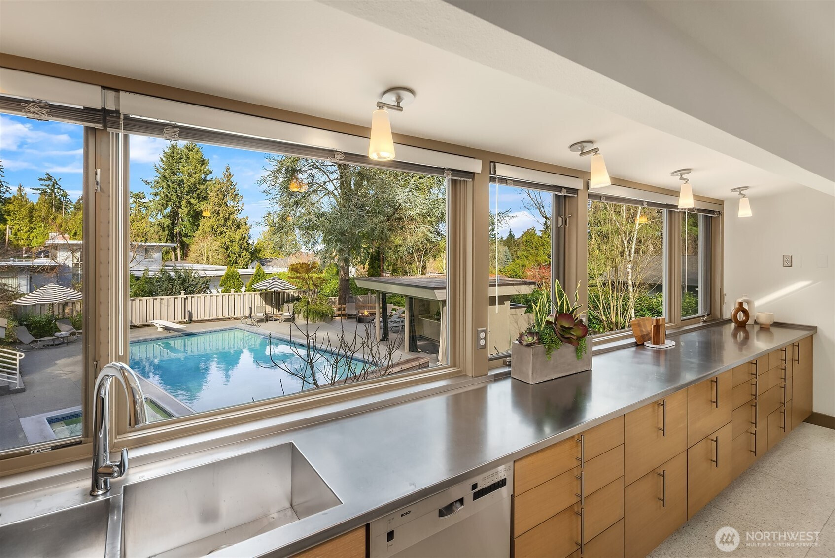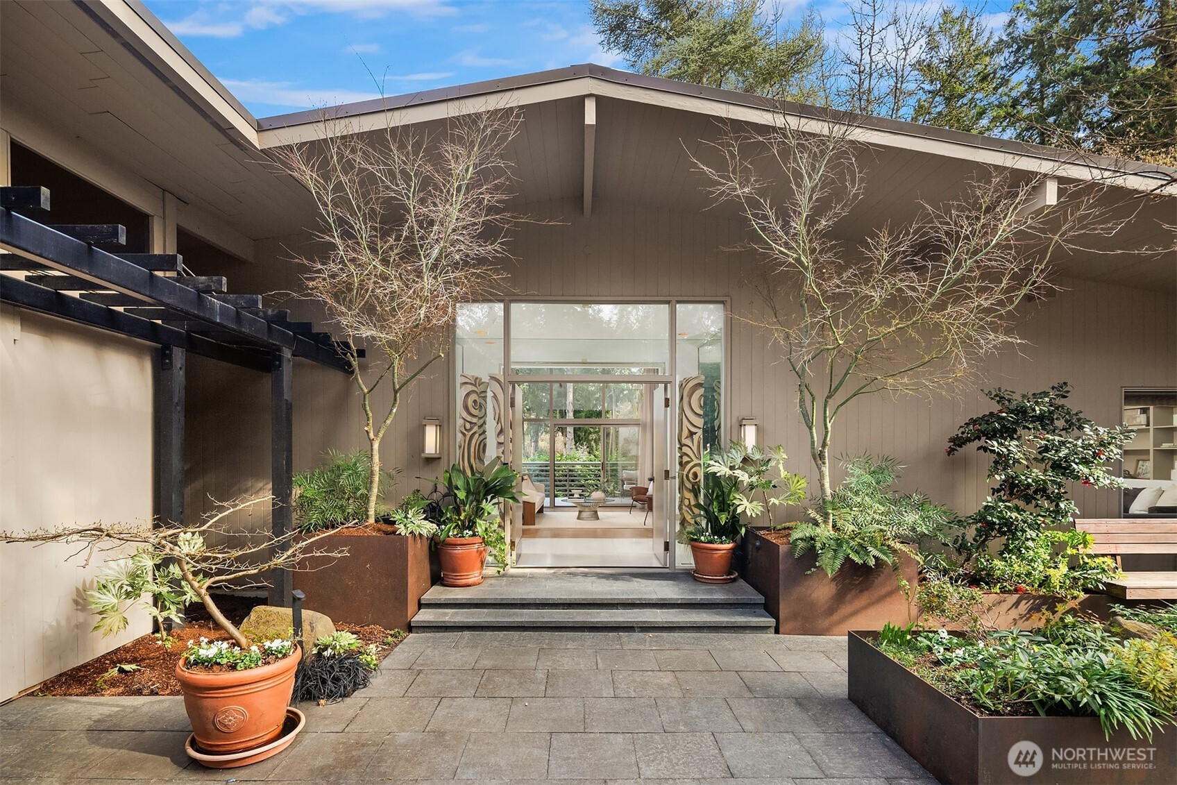 A beautiful arrival through Japanese-inspired gardens, featuring a dramatic fifteen-foot custom steel planting bed, invites you into an iconic Mid-Century Modern home inspired by the visionary legacy of Paul Hayden Kirk. Open the doors to luxurious, light-filled breadth: signature terrazzo floors, soaring walls of glass, and half acre of park-like grounds. This is a rare home where artistry defines the architecture and communion with nature is not a feature, it is the experience. Coveted ceiling heights and generous art walls create gathering rooms designed for everyday living and confident entertaining. Superbly updated while honoring its important original details. The kitchen's table-height island is a perfect nod to the thought behind every choice. Designed to invite conversation and comfort, the layout is masterful. The main floor primary suite opens to the deck with beautiful garden views and sits adjacent to the library offering a quiet retreat. Two closets and an updated 5-piece bath make it thoroughly modern. The sunny garden level is surprisingly spacious, with 4 bedrooms, a bonus/game room, and office-generous rooms to write a beautiful life story. Outside, a cabana, pool, hot tub and backyard celebrate the best of PNW living, while just across the street the protected Fairweather Preserve awaits. This is a rare diamond of esteemed PNW design with all of Medina's celebrated lifestyle convenience. Enjoy a home as beautifully special as the life you want to live!