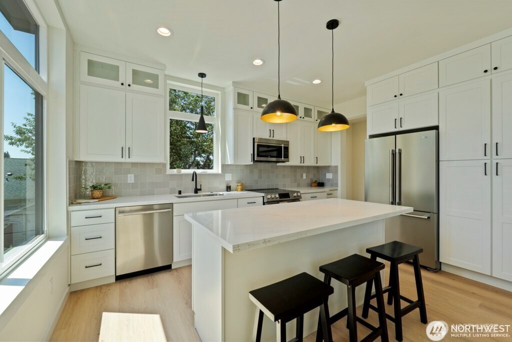 Where Roosevelt, Ravenna & Maple Leaf meet: Discover modern living in “The Triangle.” This brand-new 1,563 sq ft standalone home features 3BR, 2.25BA & a layout built for comfort. The primary suite offers territorial views, a walk-in closet & ensuite bath. The kitchen shines w/ white shaker cabinets, quartz counters & SS appliances. Energy-efficient mini-splits, LVP flooring & rooftop deck enhance daily living. Walk score of 84 puts Project 9, Growler Guys, Mojitos & Macrina Bakery just steps away. Heated garage w/ EV charging + off-street parking. Near Maple Leaf Park & UW and I-5 for easy commuting. **Northwest corner unit with the garage and 1 parking space off the alley.