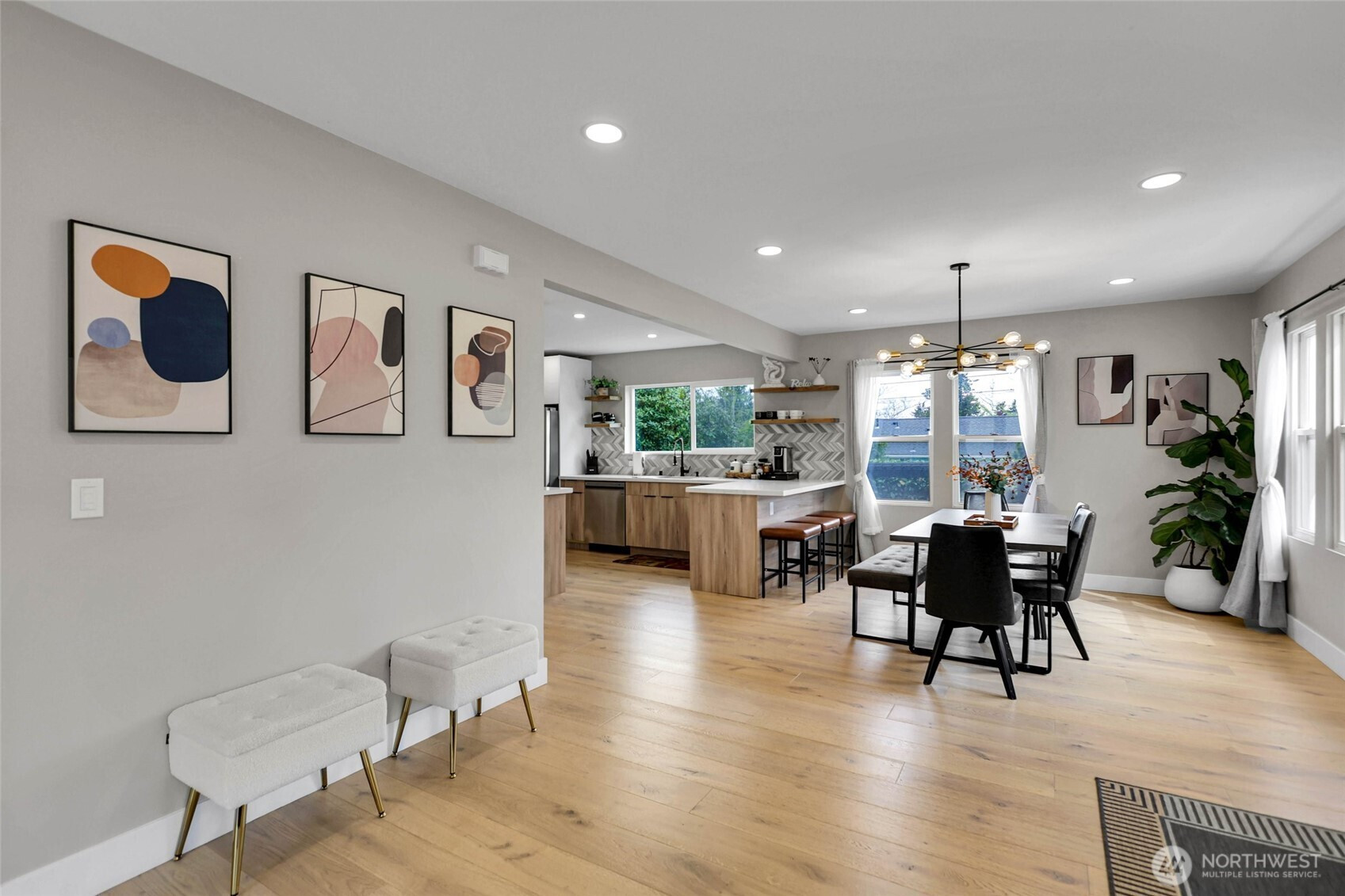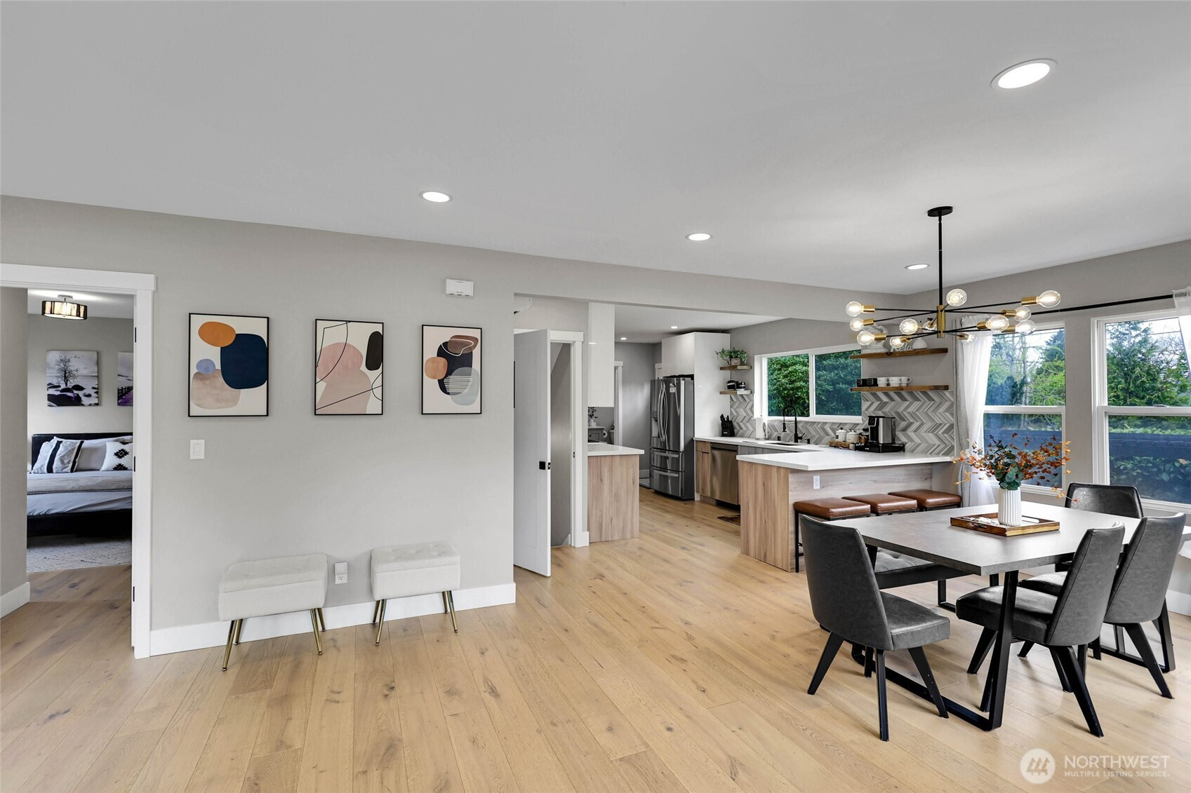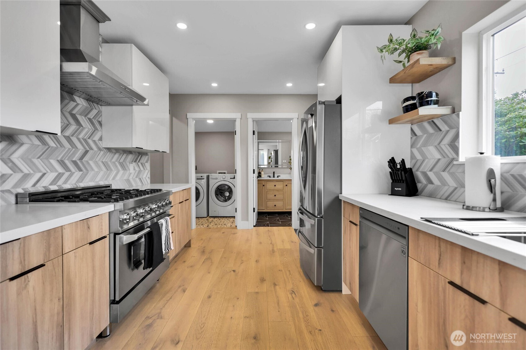 Experience the perfect blend of craftsmanship and modern comfort in this stunning, fully remodeled gem in Highland Park—a small community with three homes nestled in a friendly, quiet neighborhood. The main floor boasts an open-concept layout that seamlessly flows from the chef's kitchen to the dining and living areas. The kitchen is equipped with a high-end six-burner gas stove, stainless steel appliances, quartz countertops, and ample cabinetry. The master bedroom includes dual walk-in closets and luxury ensuite bathroom with heated tile floors. Additional second full bathroom is conveniently located off the stairs, as well as dedicated laundry room. Upstairs, you'll find two spacious bedrooms, an open loft, and two large walk-in storage areas. The lower level adds flexibility with additional living space, featuring a kitchen, full bathroom with heated tile floors, washer/dryer, and separate entry—ideal for guests, multi-generational living, or rental opportunities. The exterior features an oversized level corner lot, surrounded by tall hedges, a covered patio with solar lighting, RV parking, dedicated alley parking, and ample street parking. With extensive renovations already completed, including engineered hardwood flooring throughout the main floor and mini-split heating and cooling systems, this move-in-ready home delivers the perfect balance of style, functionality, and flexibility.