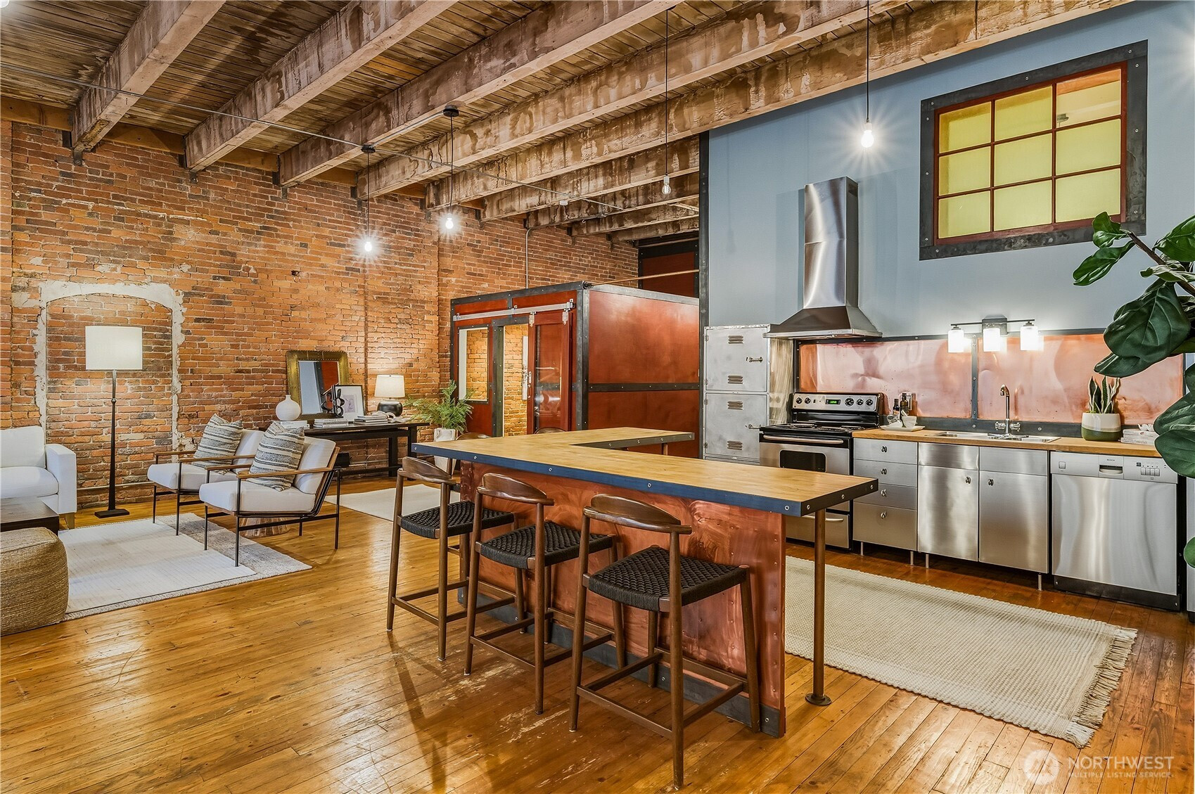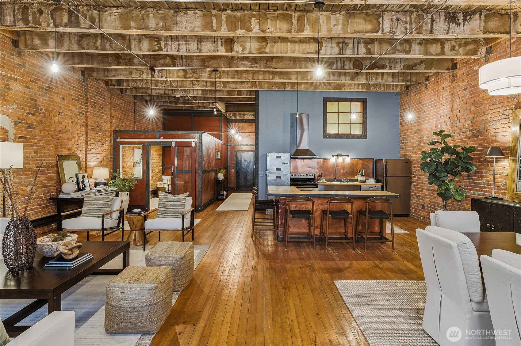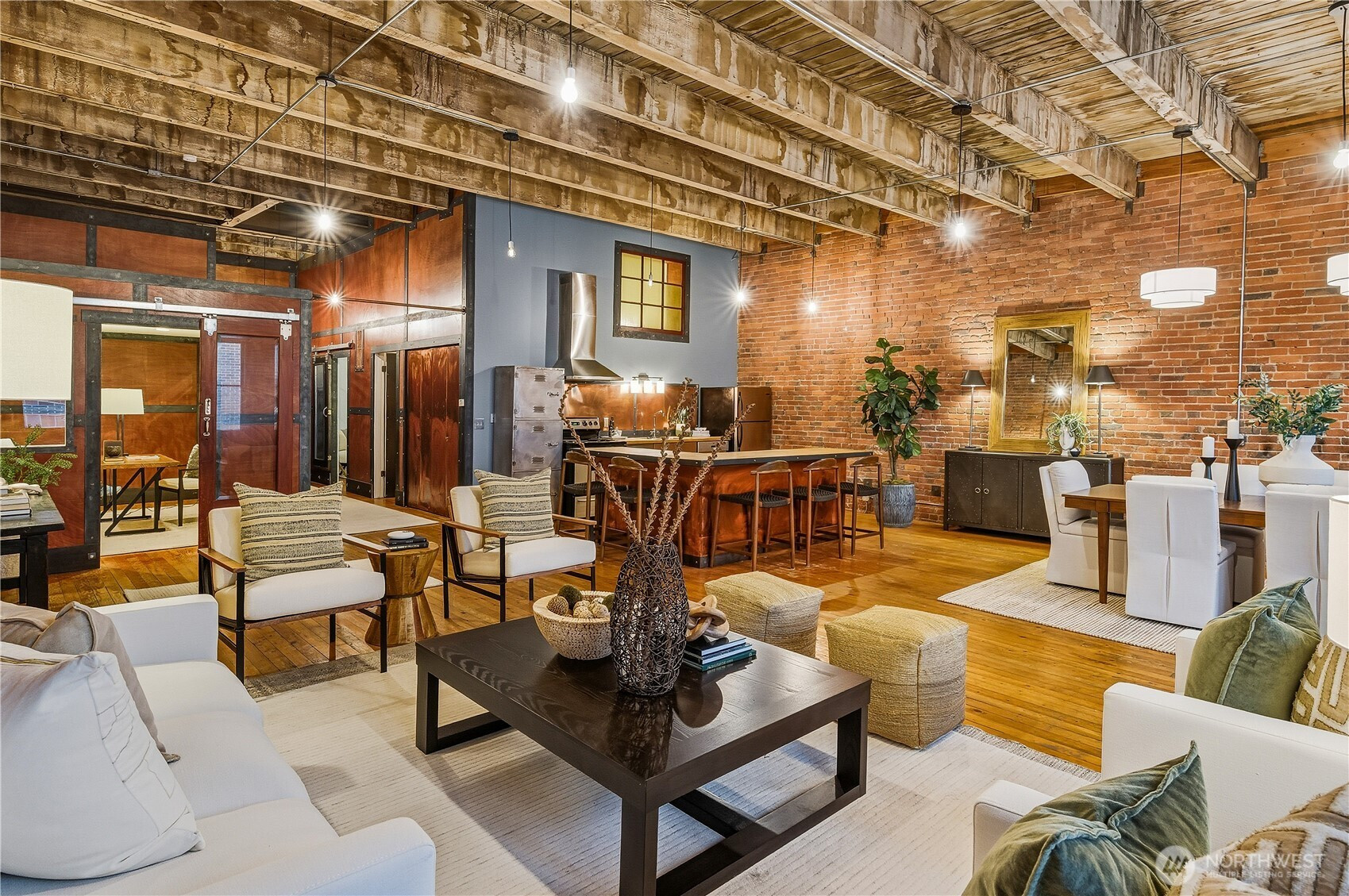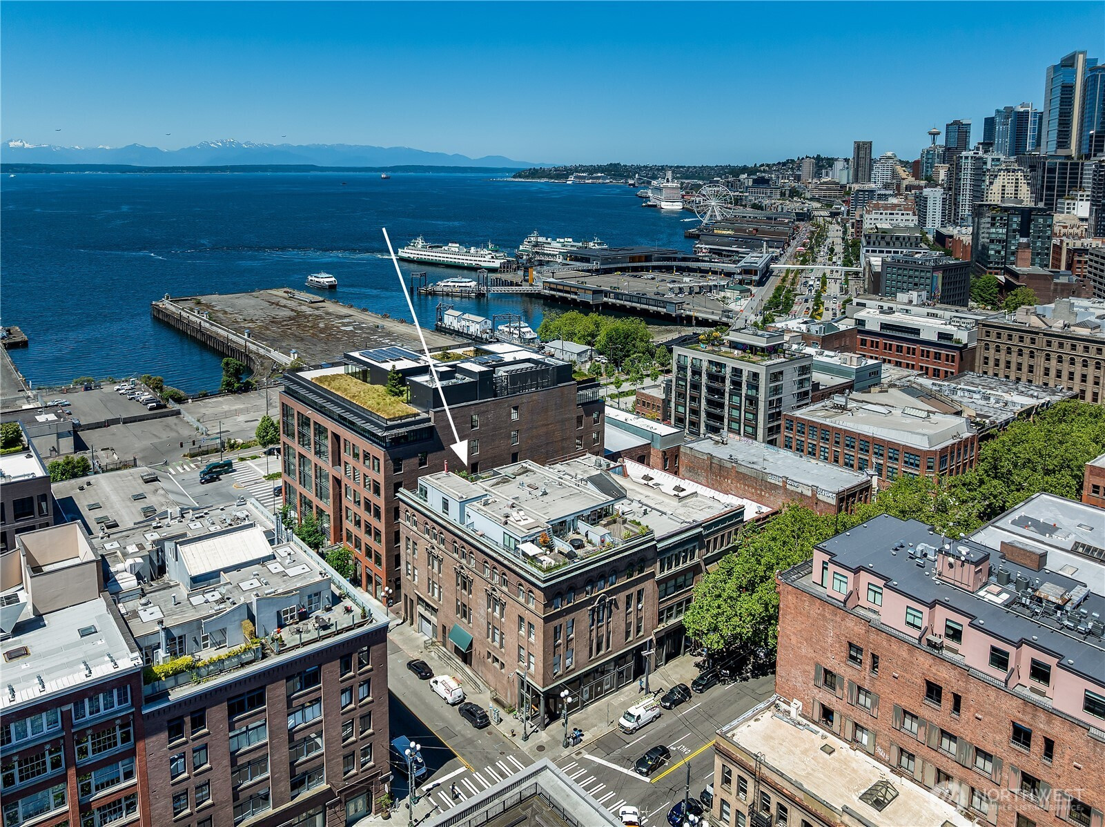 An historic, Pioneer Square gem a short jaunt away from the playoff winning Mariners, Superbowl bound Seahawks and upcoming FIFA World Cup! This New York loft-style condominium offers a blend of classic architectural elements and modern amenities. Constructed in 1900 and converted into condos in the late 1980s, the unit boasts exposed brick walls, soaring ceilings, and huge Palladian windows. Original hardwood floors flow throughout the space of the one bedroom, office/den, and newly remodeled bathroom. Stainless steel appliances and abundantly sized eating bar accent the kitchen. Large dining and living areas have plenty of room for all your entertaining needs. Access to a rooftop deck with Westerly views of the Great Wheel, Bainbridge Island and beyond. One car secured parking and storage unit located in a secure garage. A cultural mecca for our city's venues for local galleries, sports, concerts, eateries, wineries and beer halls.