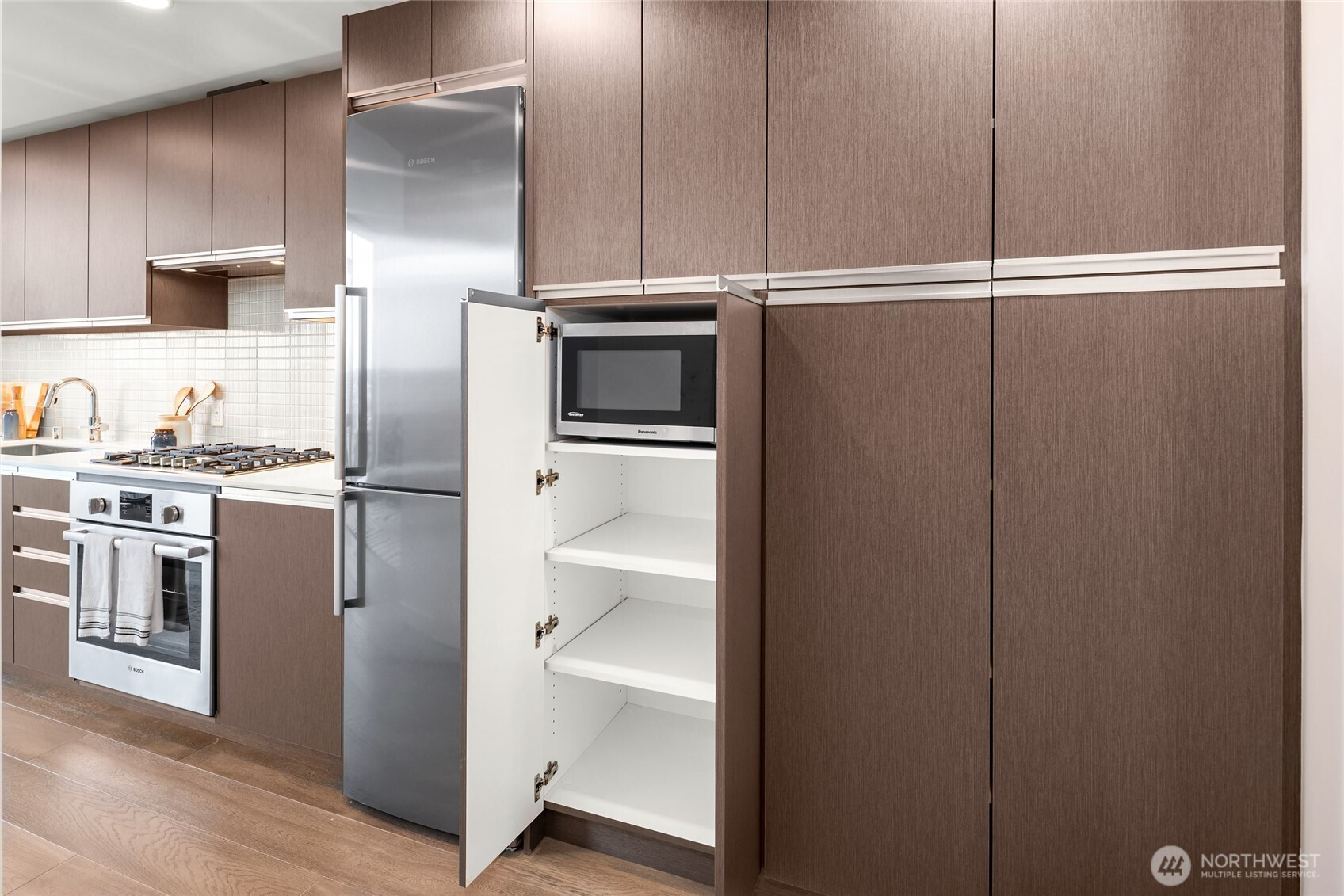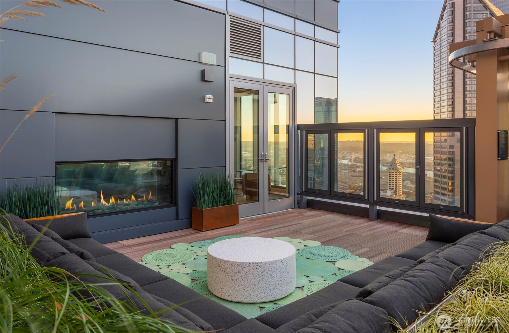 Experience modern city living in this west-facing open one-bedroom at The Graystone, one of Seattle’s newest high-rise residences. Built with premium curtain wall construction, the home is filled with natural light and showcases sweeping views of the Seattle skyline, Smith Tower, Elliott Bay, and the Olympic Mountains. The galley kitchen features Bosch appliances, a gas cooktop, and ample storage. The open-concept layout offers flexible living and sleeping space, complemented by a deep closet for additional storage. Includes a full-size stacking Electrolux washer and dryer. The bathroom features a sleek standing glass shower. Residents enjoy 24/7 concierge service, a fitness center overlooking the waterfall park, a co-working level, and a video game lounge. Graystone showcases one of Seattle’s few fully integrated 360-degree rooftop amenity spaces, featuring NanaWall systems that open seamlessly into expansive outdoor areas. The rooftop offers panoramic views from Mt. Baker to Mt. Rainier, the Cascades to the Olympics, Elliott Bay, South Lake Union, Lake Washington, and Downtown Bellevue.