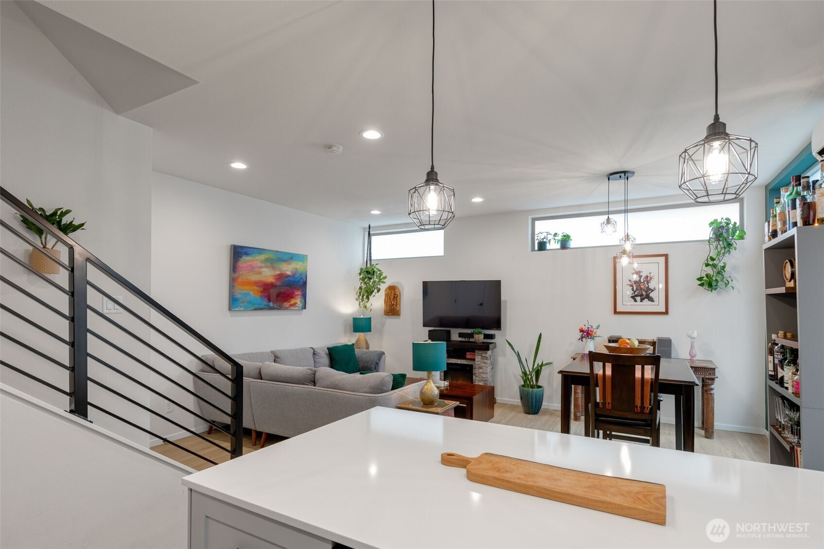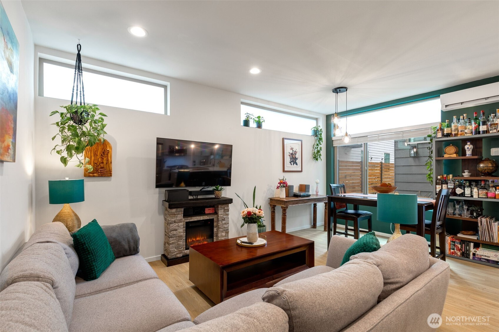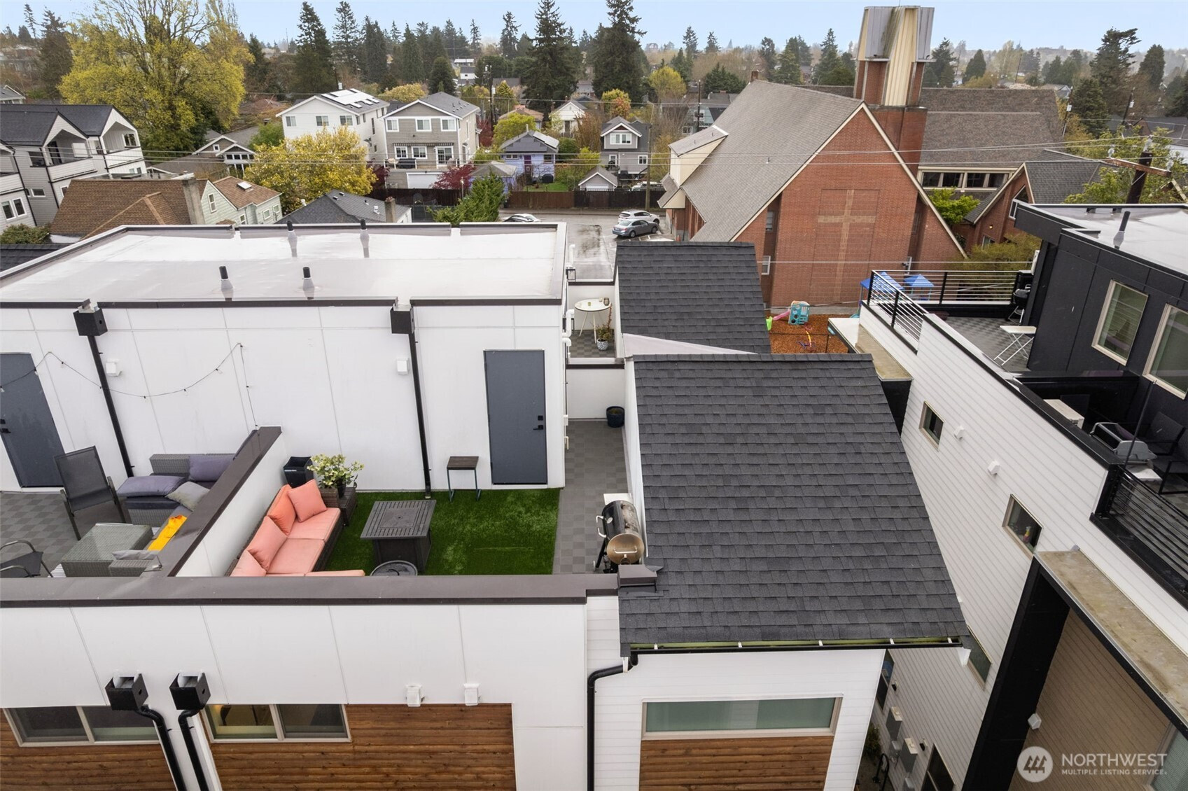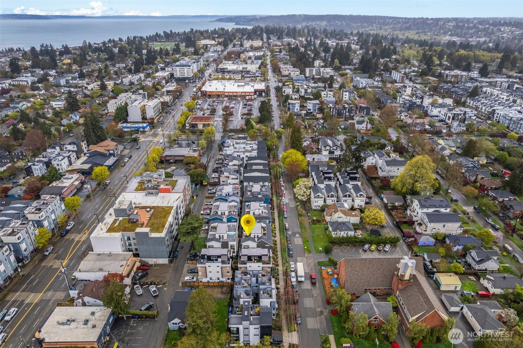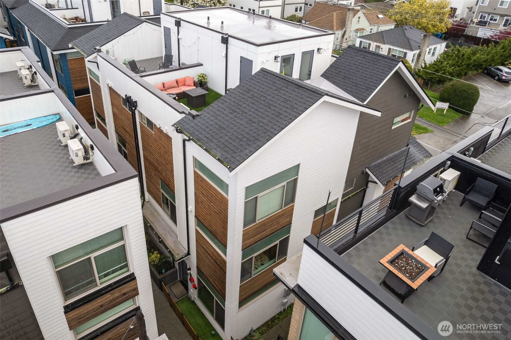 Tucked into an 8-unit community, this Loyal Heights townhome was built for generous, easy living. The main level opens from living room to kitchen, with quartz counters, stainless appliances, and a gathering-ready island, with room to lounge, dine, and entertain. Vaulted ceilings and clerestory windows flood the space with light while keeping things private. Two bedrooms and a full bath on the middle level offer flexibility for guests or work-from-home life, while the top-floor primary suite feels like a getaway—complete with a walk-in closet and spa-like bath with double vanity and custom tile shower. Head up to the rooftop deck for territorial views and a quiet moment above it all. Mini-splits keep things comfortable year-round, street parking close to your door is always easy to find. All set on a leafy street near parks, and easy to access grocery stores (including Metropolitan Market), with Ballard and Golden Gardens close at hand. Be close to the heartbeat of NW Seattle but in a quiet enclave in an easy-to-maintain home.