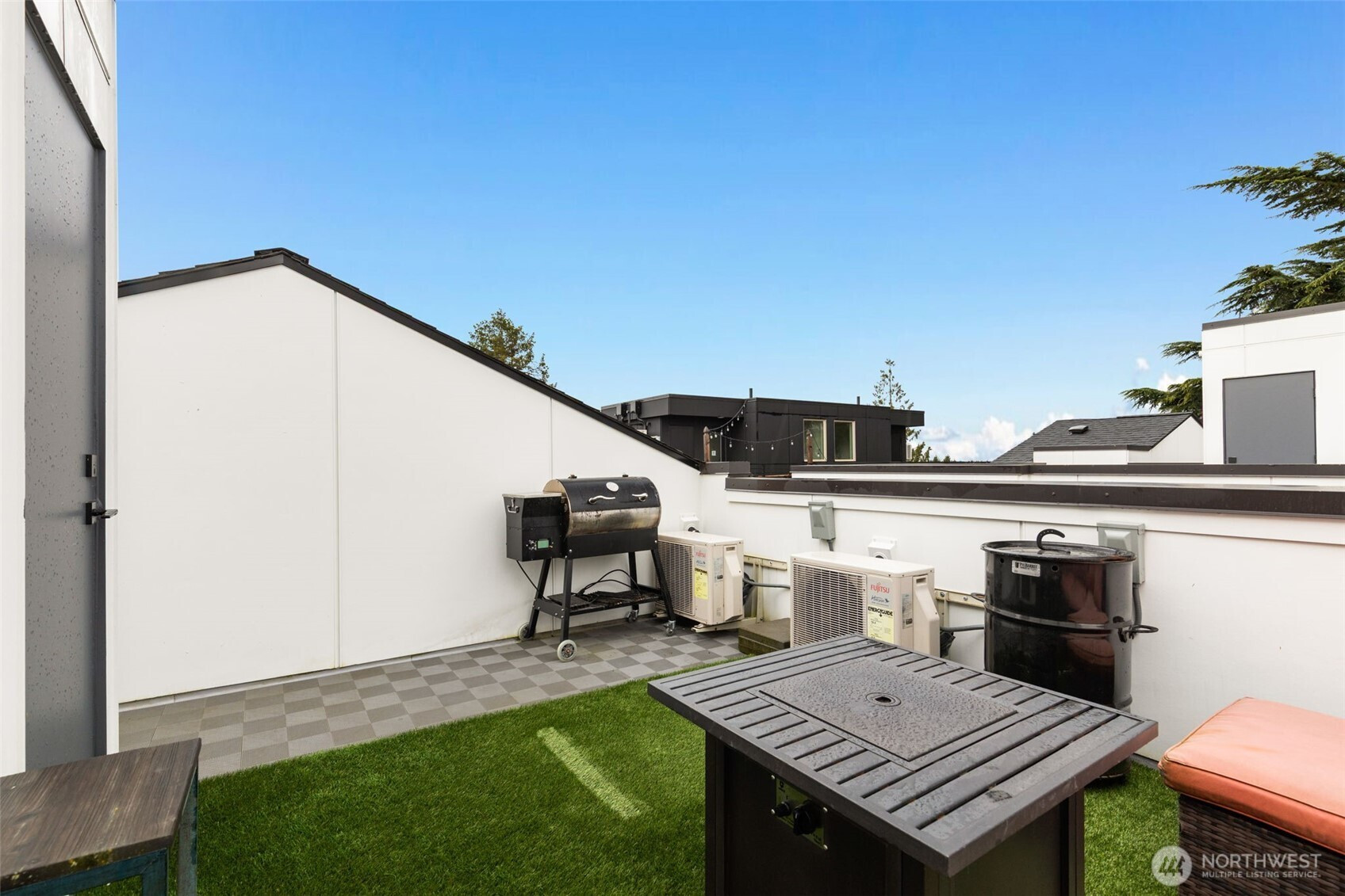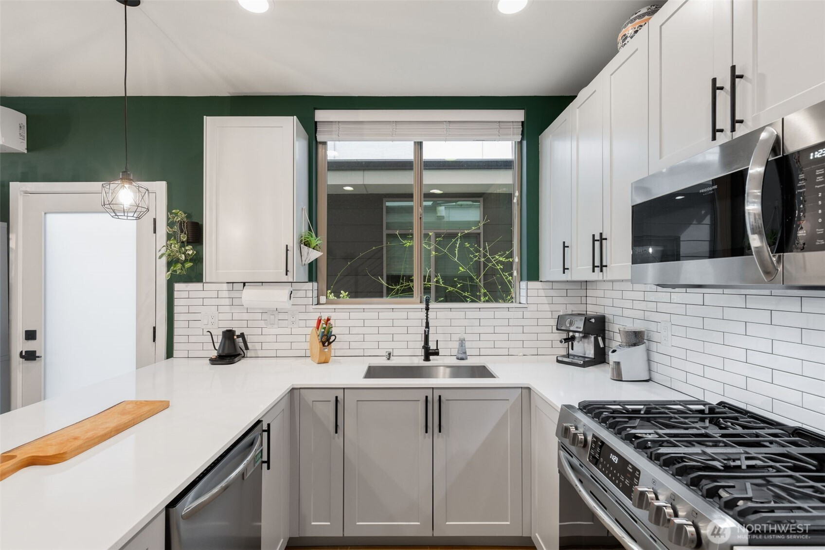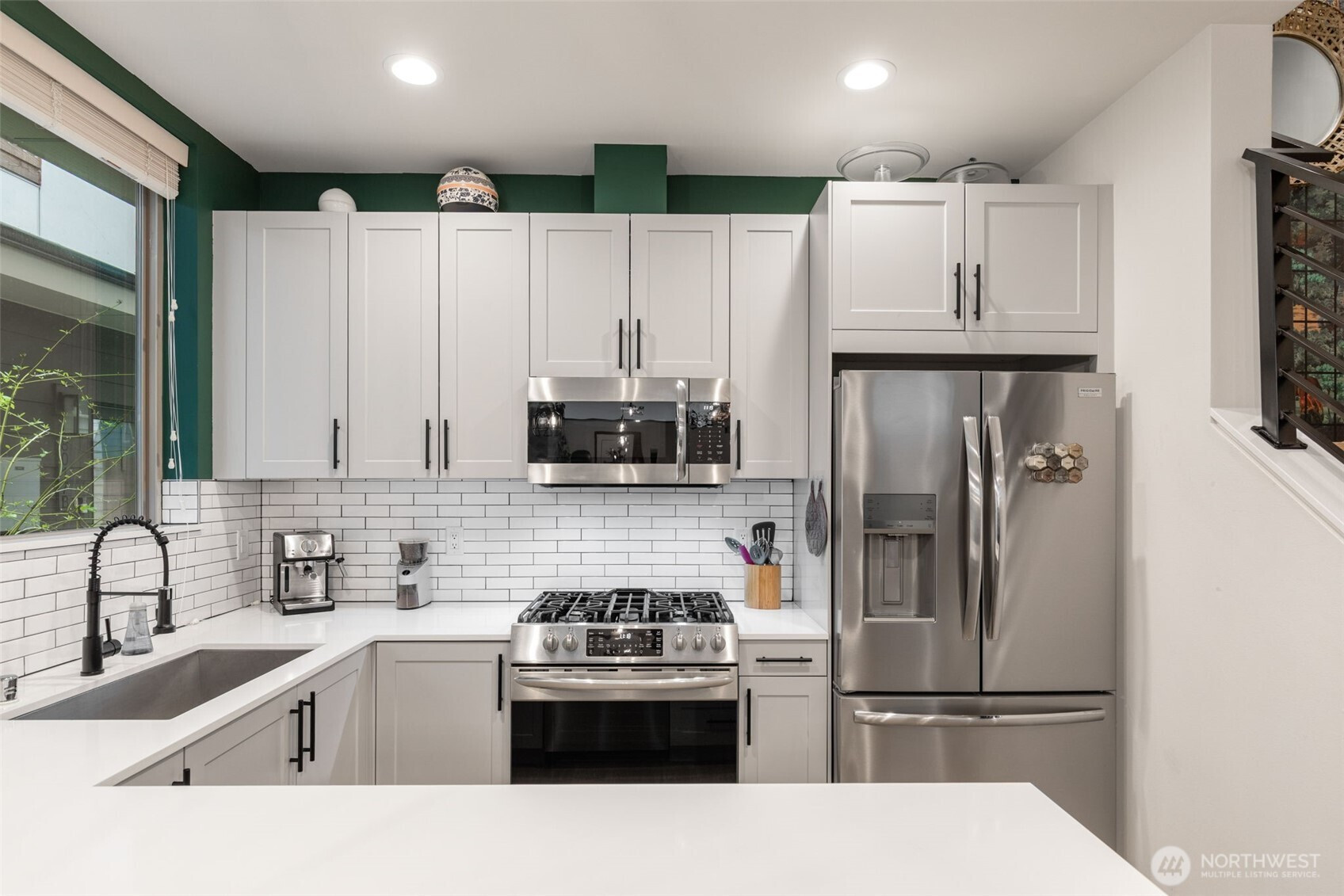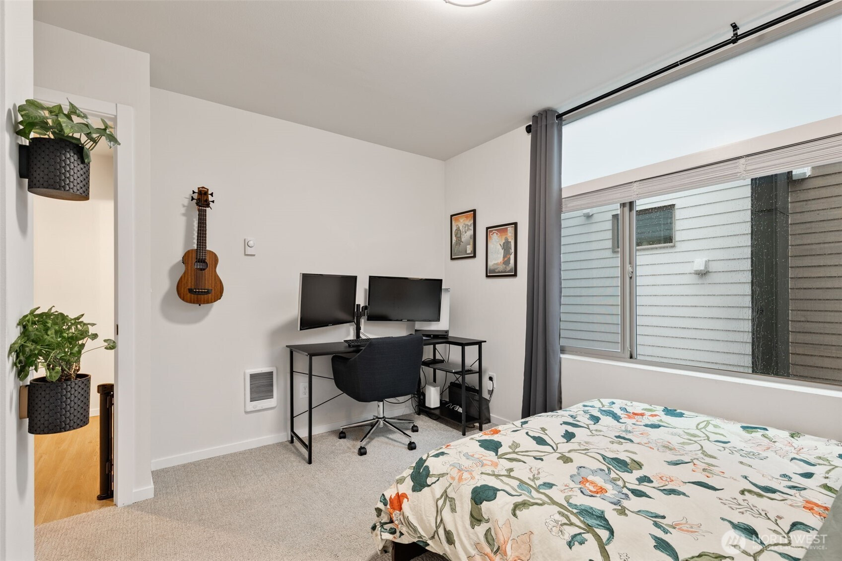Tucked into an 8-unit community, this Loyal Heights townhome was built for generous, easy living. The main level opens from living room to kitchen, with quartz counters, stainless appliances, and a gathering-ready island, with room to lounge, dine, and entertain. Vaulted ceilings and clerestory windows flood the space with light while keeping things private. Two bedrooms and a full bath on the middle level offer flexibility for guests or work-from-home life, while the top-floor primary suite feels like a getaway—complete with a walk-in closet and spa-like bath with double vanity and custom tile shower. Head up to the rooftop deck for territorial views and a quiet moment above it all. Mini-splits keep things comfortable year-round, street parking close to your door is always easy to find. All set on a leafy street near parks, and easy to access grocery stores (including Metropolitan Market), with Ballard and Golden Gardens close at hand. Be close to the heartbeat of NW Seattle but in a quiet enclave in an easy-to-maintain home.