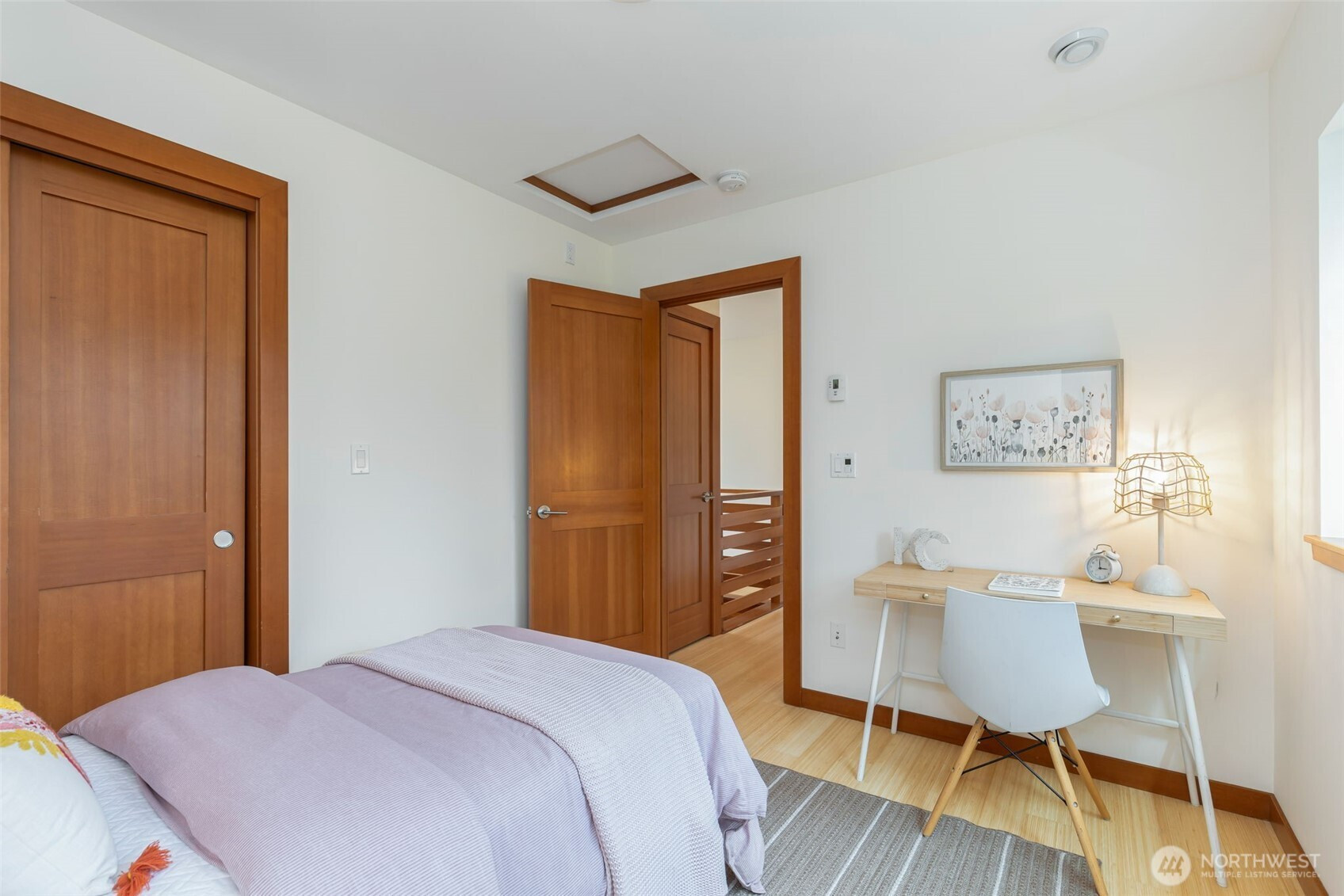 This Northwest contemporary home, a true sanctuary in the city, is an impeccable example of thoughtful design intersecting with a natural setting. This green-built home, made largely with locally sourced materials, is only steps from all that Wedgwood has to offer. On a lush protected greenbelt, the sweet birdsongs change with the seasons. Organic materials and walls of windows, awash in natural light, integrate the indoors to the outdoors. The combination of open concept living and comfortable, discreet spaces make this a home that will delight. The metal roof, concrete board siding, Ipe decks, 220 electric in the garage for EV, a premium HRV whole house air filtration system, and radiant heating are among the comforting and sustainable choices made in the well considered construction. There's no need to compromise. You get all of this with the perfect floorplan - 3 bedrooms and 2 baths up, 1 bedroom or office with its own entrance and a half bath on the main, and downstairs is a spacious bedroom, another bath, and a media room with a second kitchen/laundry. The downstairs can also be used as an ADU with permitting already in place and its own entrance. The gardens around the home are expansive and special, perfect for gardening, relaxation, and play. You are going to love this home and it will love you back.