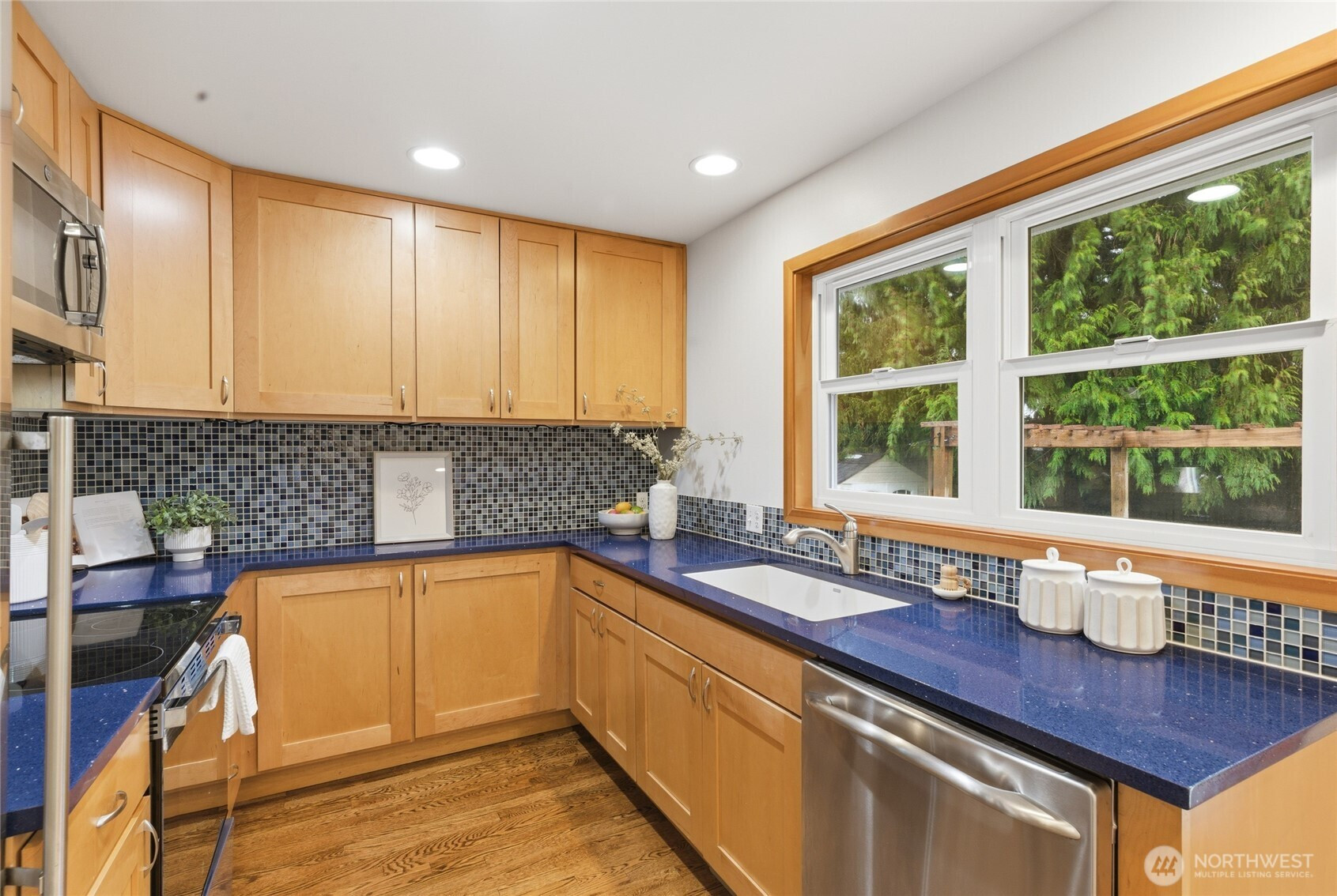 Pretty Wedgwood classic residence on level, friendly street exudes warmth and comfort.. Extensive 2011 remodel including systems, baths, roof, windows, utilities- this home is ready to go! Crisp finishes, Open floor plan, oak floors, clear fir moldings, cozy gas fireplace. Remodeled kitchen overlooks spacious back yard. Ample cabinets and slab countertops, stainless appliances. Large bedrooms. A laundry and bath on each floor offers flexibility. Lower level play room and non conforming bedroom. Big fenced back yard with plenty of play space, sizable entertainment deck, dining terrace and big cedar to offer shade and cooling properties. Flowering and fruiting plants add summer interest, native plantings encourage birds. Great schools! Bus line! Close to parks, neighborhood shops, restaurants and amenities including Hunter Tree farm, the Wedgwood Broiler, Meadowbrook Pool and the NE Seattle library. Welcoming and well-located home!