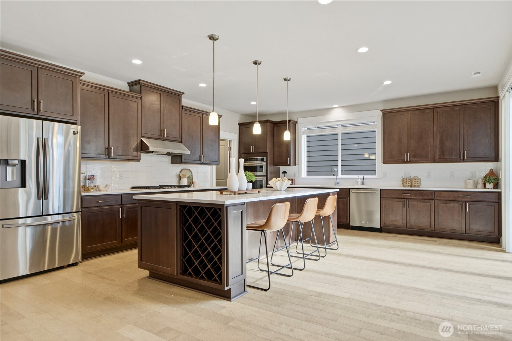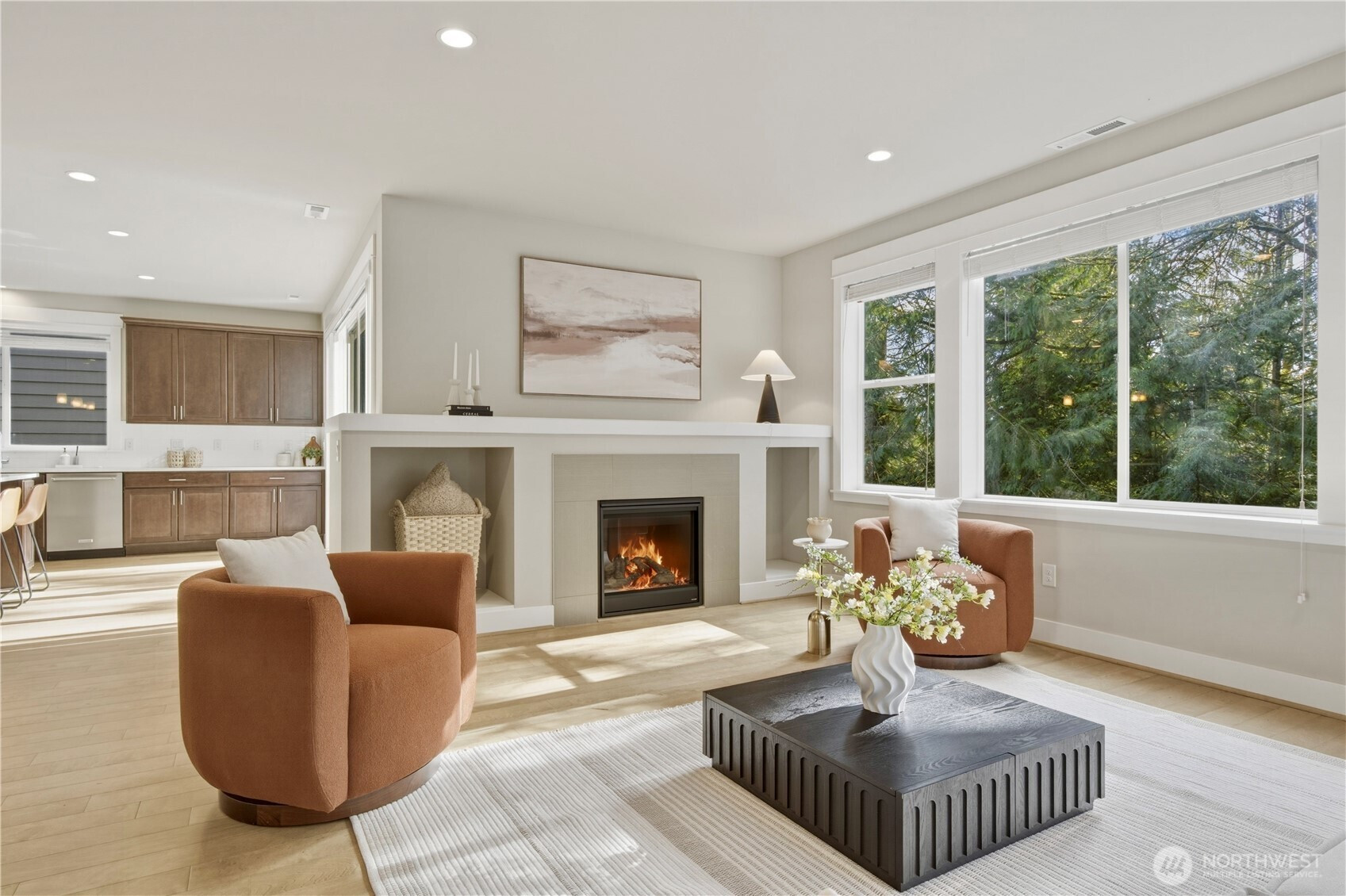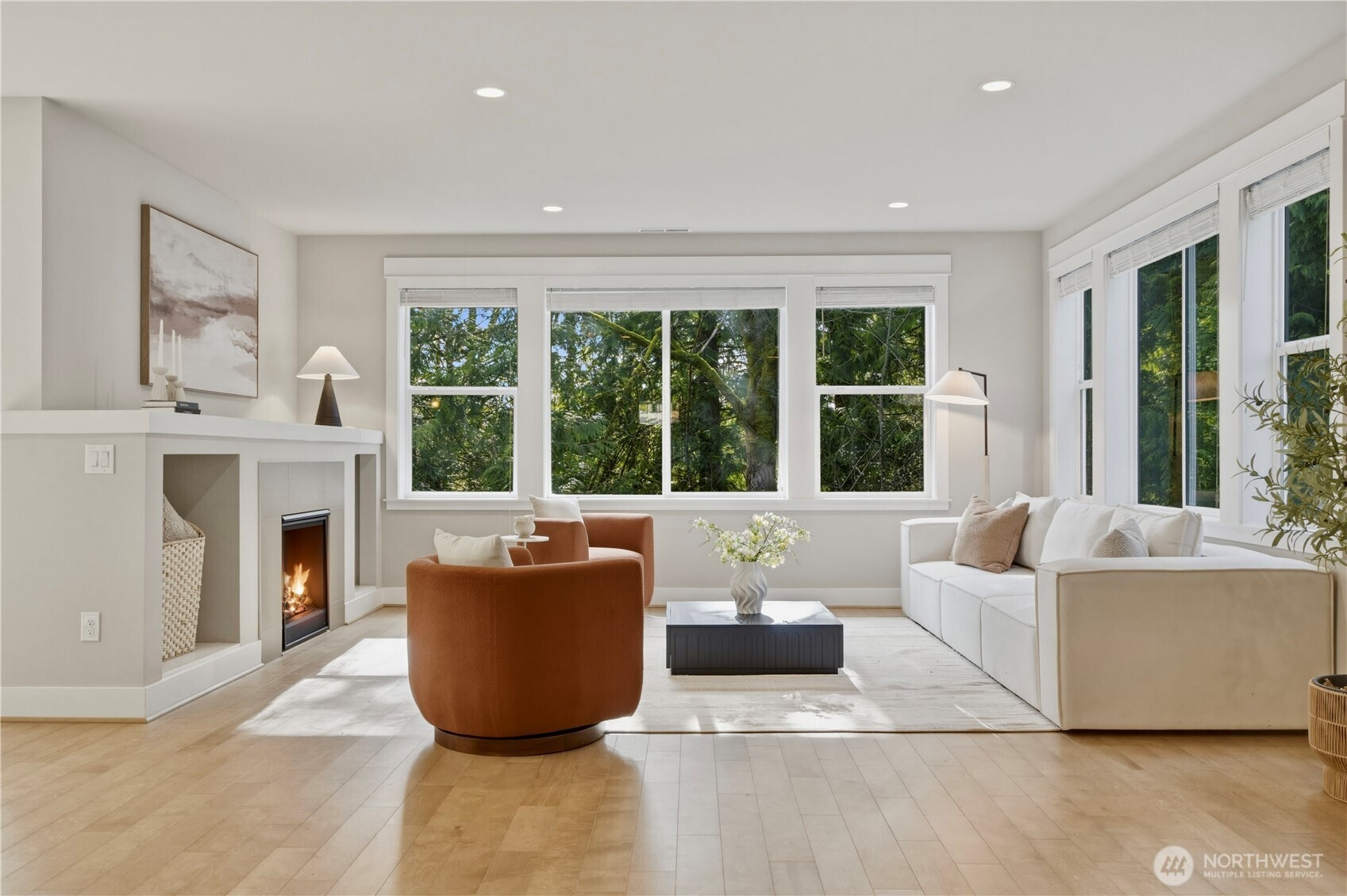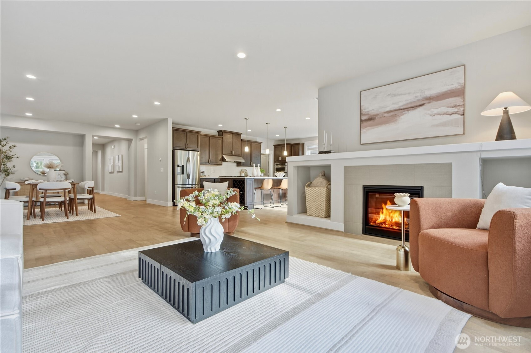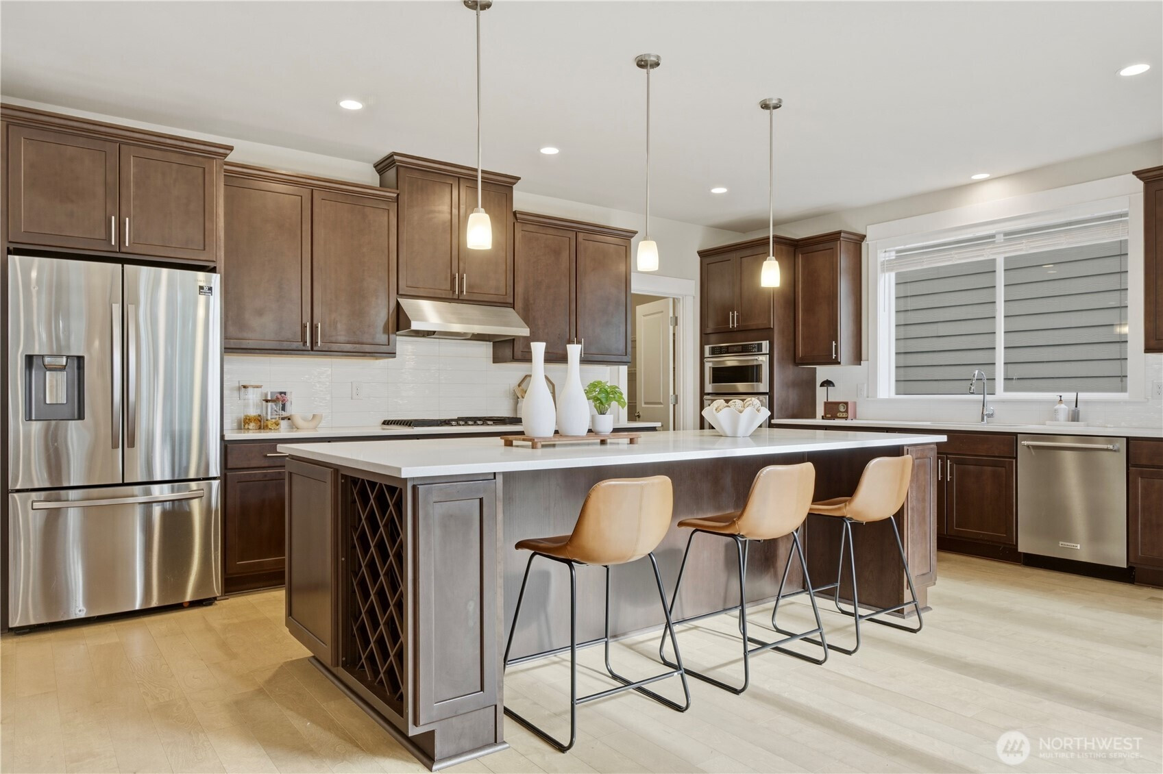 Built in 2018 by renowned Toll Brothers, this north-facing home is filled with natural light and timeless architectural details, blending modern elegance with everyday functionality. The main level showcases hardwood flooring and a seamless open-concept layout, creating an airy, connected living space centered around a chef’s kitchen with an oversized island, quartz countertops, custom cabinetry, and premium stainless-steel appliances — ideal for both entertaining and daily living. The kitchen opens to a spacious deck, perfect for morning coffee or summer BBQ gatherings. Upstairs, the expansive primary suite features a spa-inspired bath and a generous walk-in closet, complemented by three additional bedrooms and a full bath for flexibility. The lower level offers a large bonus room and a private bedroom with an en-suite bath, ideal for guests or multi-generational living. Backing to a lush greenbelt, the peaceful backyard provides privacy and serene natural views. Located within walking distance to Trader Joe’s, Safeway, and local dining, and served by the highly rated Lake Washington School District — this is a home where comfort, privacy, and convenience truly come together.