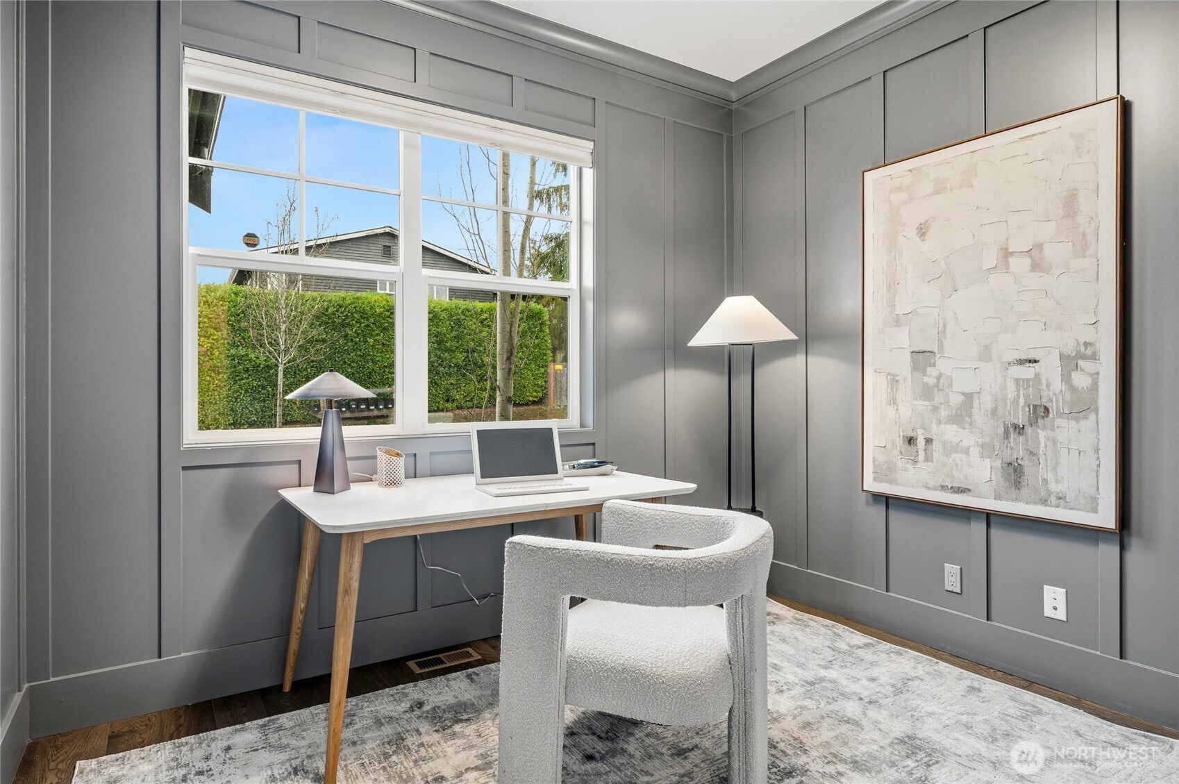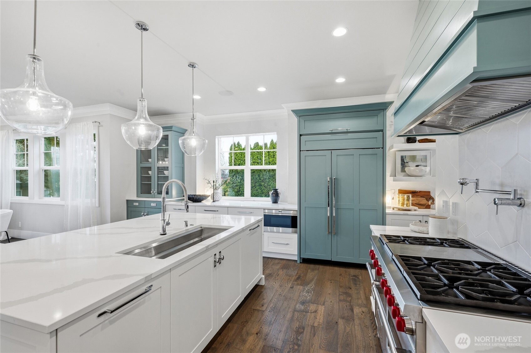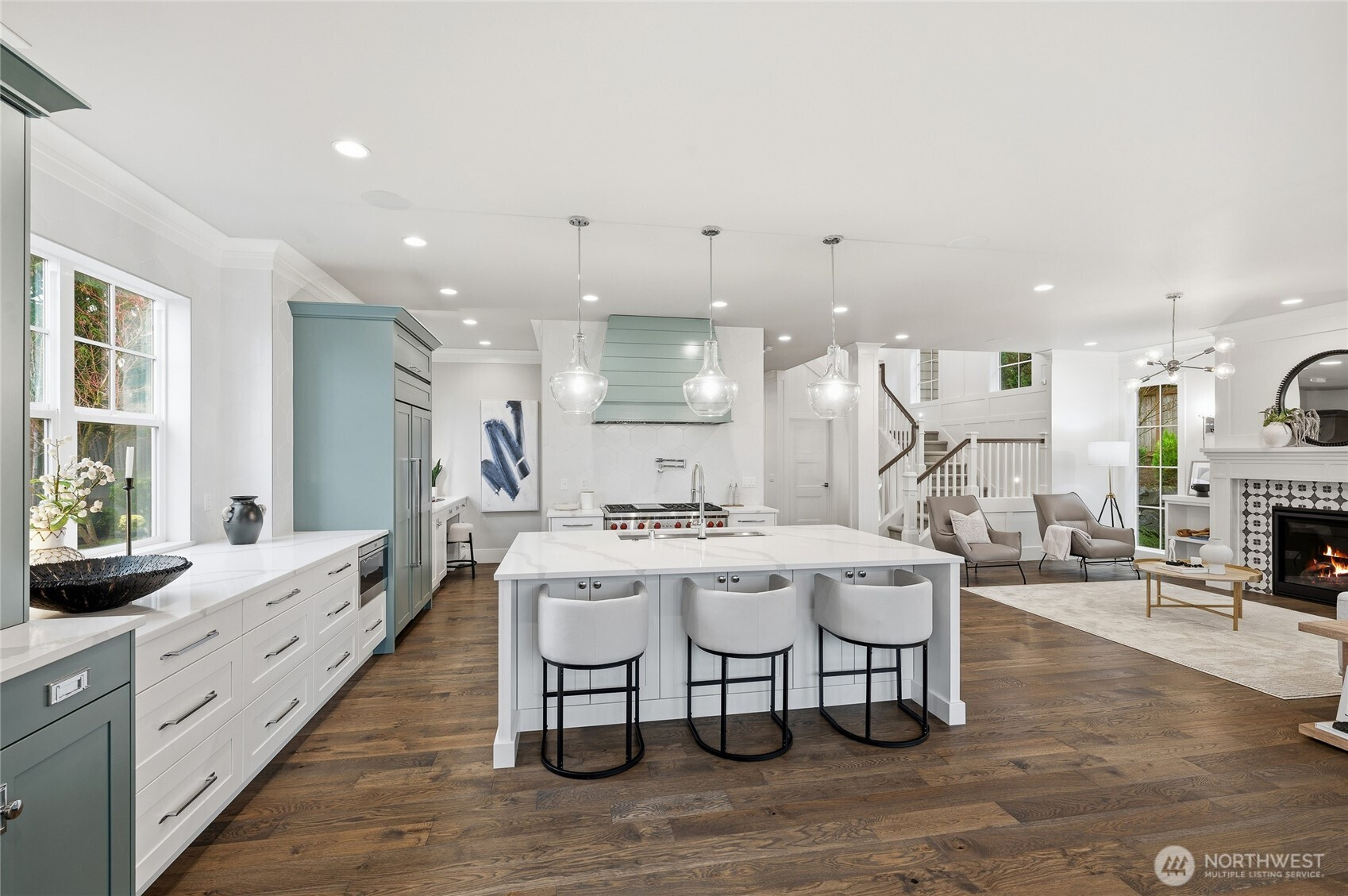 Stunning custom Craftsman like-new built in 2020 by Enfort Homes, offering 5 bedrooms, 4.5 bathrooms and 4,031sf of thoughtfully designed living. Rich engineered hardwoods, extensive crown molding and millwork, custom tile, designer lighting, 9’ ceilings and 8’ doors elevate every space. Main-level bedroom suite with private bathroom ideal for multi-generational living, plus a beautifully appointed home office with wainscoting. The kitchen is a true centerpiece featuring Wolf double ovens and gas range, quartz countertops, oversized island with under-counter storage, walk-in pantry, workstation, soft-close cabinetry and panel-ready refrigerator and dishwasher. The great room showcases a gas fireplace, floor-to-ceiling windows and a butler’s bar with beverage fridge and glass-front cabinetry. Seamless indoor-outdoor living with multiple covered decks, including heated outdoor space with stone gas fireplace and BBQ stub. Luxurious primary retreat with private covered deck, fireplace and coffee bar. Lavish primary bathroom has all the extras: heated floors, soaking tub, and oversized glass shower with multiple shower heads. Smart home hub, built-in speakers, central A/C with Nest thermostat, tankless water heater, 3-car garage with EV charger. No HOA. Prime Kirkland location near Everest Park, Cross Kirkland Corridor, Google campus, and waterfront dining.