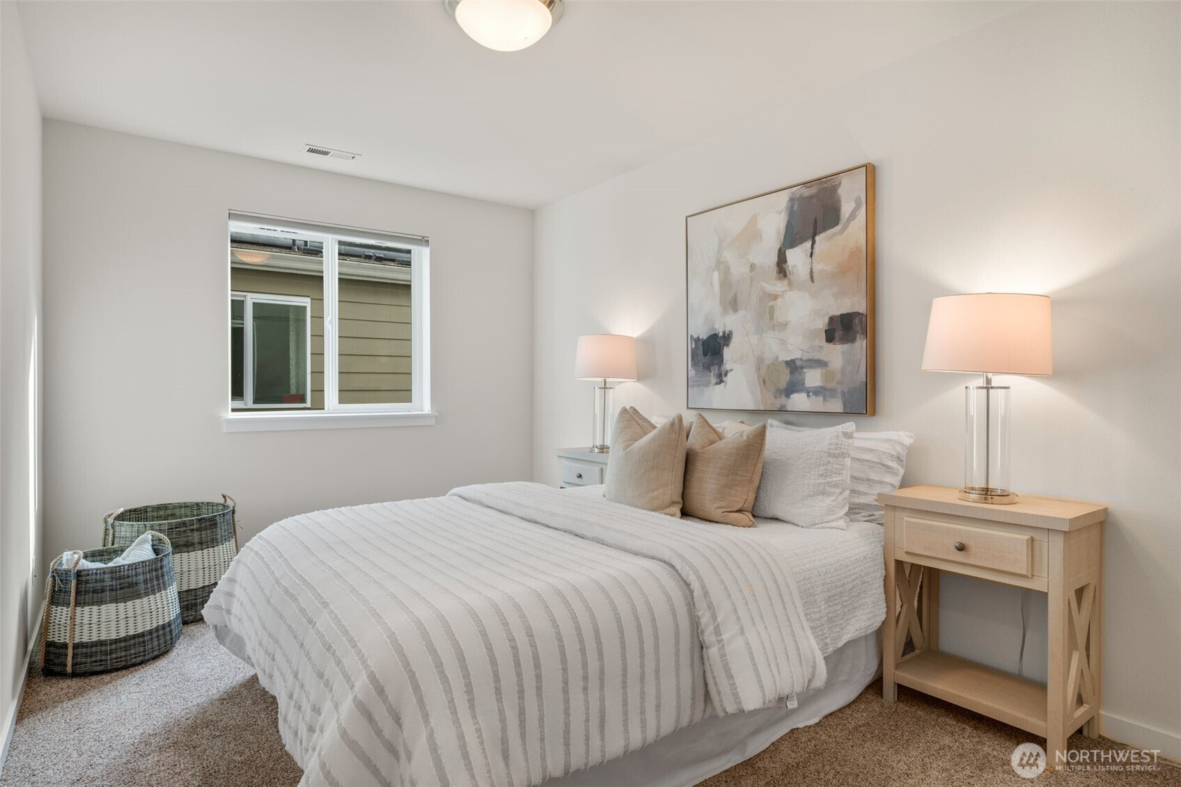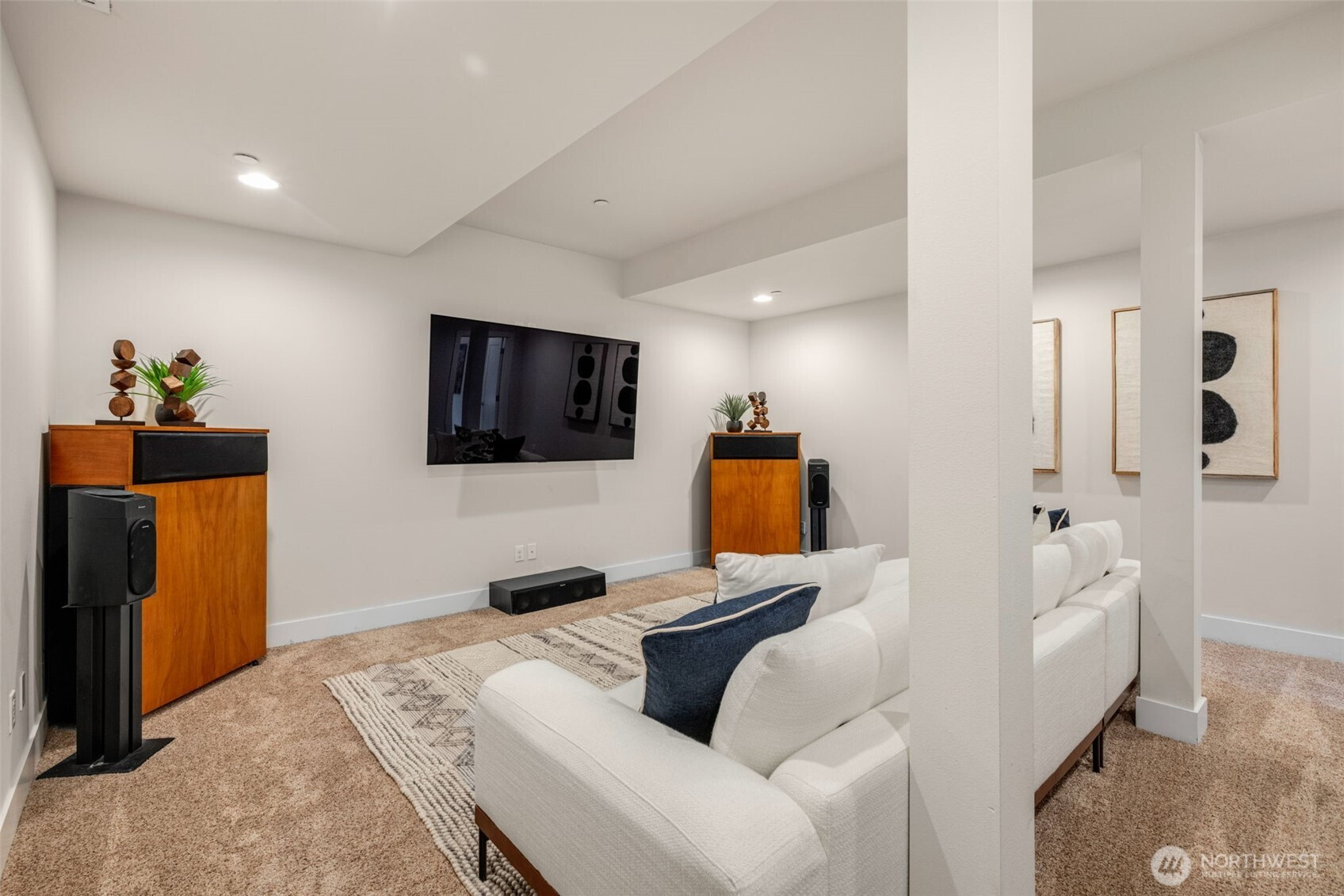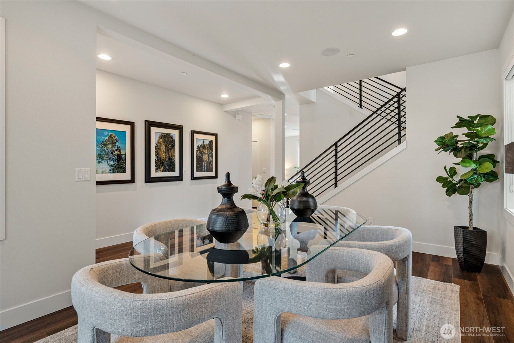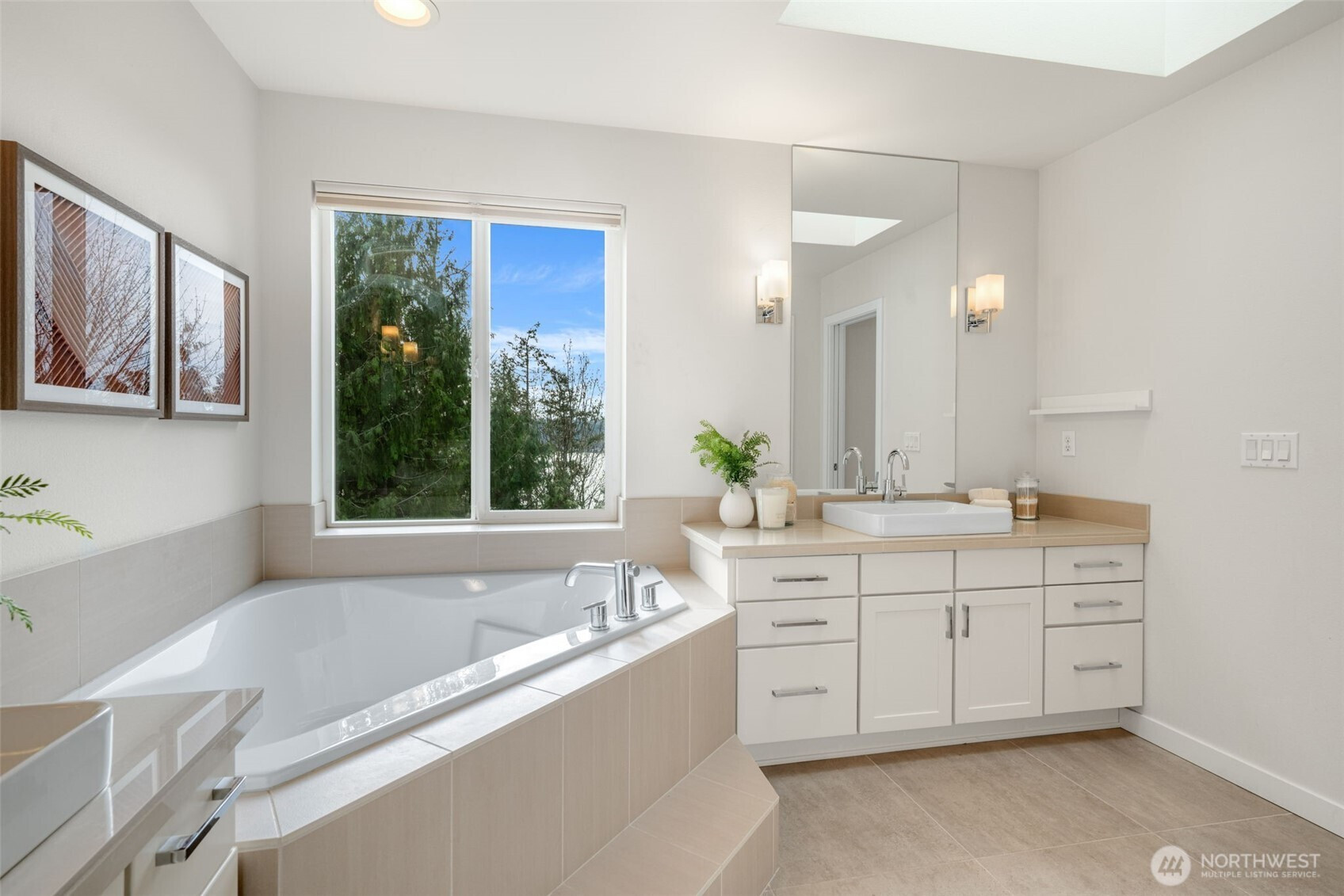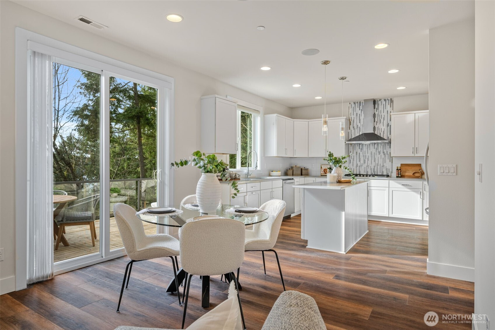 Modern Comfort Meets Northwest Views in Sammamish. Tucked on a quiet dead-end street, this beautifully updated home blends modern style with serene Pacific Northwest surroundings, featuring filtered views of Lake Sammamish and a lush tree canopy backdrop. The light-filled living and dining area offers newer flooring, a cozy gas fireplace, and built-in cabinetry, with an 8-foot door opening to the view deck for seamless indoor-outdoor living. The kitchen is designed for everyday living and entertaining with white shaker cabinets, a spacious island with pendant lighting, grey solid surface countertops, stainless appliances, French door fridge, wall oven, cooktop, and white tile backsplash. A versatile front flex room with fireplace is ideal for a dining room, office, or library, plus a convenient powder room on the main level. Upstairs, the primary suite features lake views, dual closets, and a five-piece bath with soaking tub and separate shower. Three additional bedrooms, a full bath with double sinks, and a laundry room complete the level. The daylight basement includes a large family room with deck access, an additional bedroom, ¾ bath, bonus/media room with wet bar, and ample storage. Solar panels with battery bank back-up power, A/C, and an attached garage add comfort and efficiency. Located near parks, the Burke Gilman Trail, and an optional community beach club membership, this home offers the best of Sammamish living.