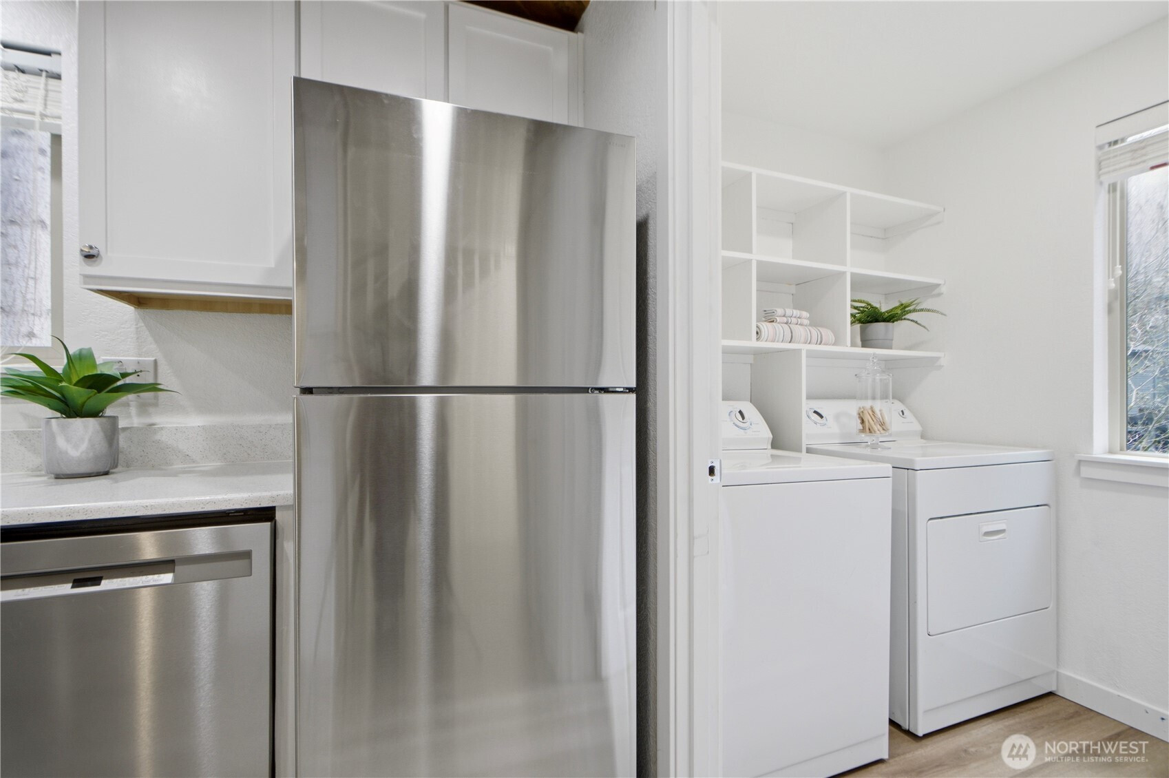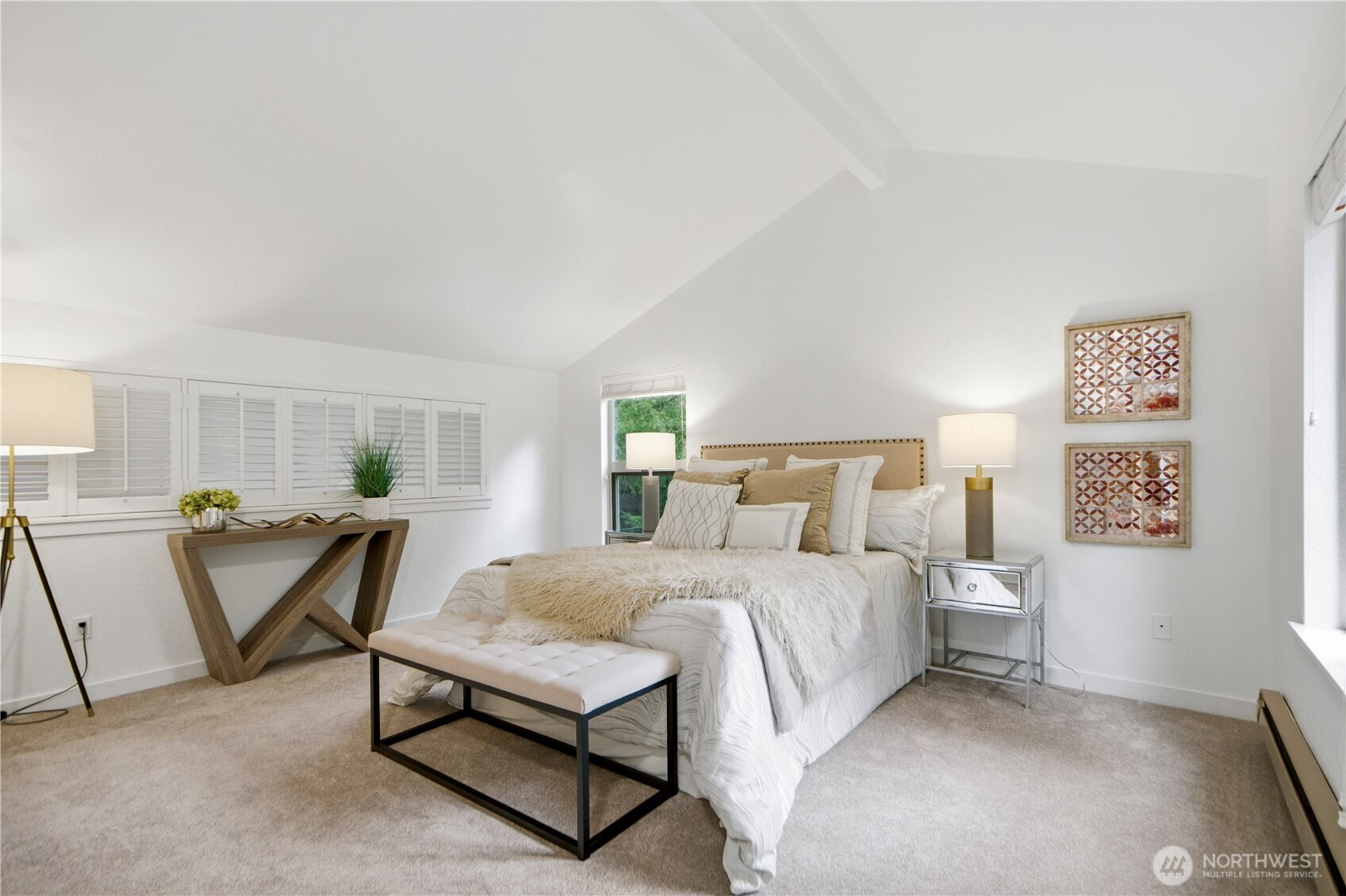 Experience the perfect blend of comfort and convenience in this stunning 3-bedroom, 2-bathroom condo nestled in the serene Cedar Ridge community. Perched on the top floor with a tranquil, park-like setting, this home is a true "commuter's heaven," offering effortless access to Bellevue, the Microsoft campus, and the vibrant downtown hubs of both Kirkland and Redmond. The main level features an open-concept layout with soaring vaulted ceilings and oversized windows. The modern kitchen flows seamlessly into the dining and living rooms, where a timeless real-wood fireplace adds warmth and charm. Step right out from your living room to your spacious patio to expand your living area—perfect for hosting guests or firing up the grill. Two spacious bedrooms share a full bath on the main floor. Upstairs, the loft-style primary suite showcases vaulted ceilings, a walk-in closet, and a 5-piece bathroom. Enjoy ample storage space throughout, plus a generous storage room by the balcony. The home includes one covered carport space, a community EV charging station, and plenty of guest parking. All this, plus the acclaimed Lake Washington School District! No rental cap!