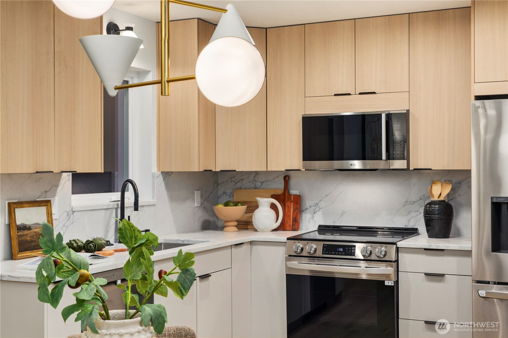 Set in the heart of Seattle this beautifully designed home blends sophistication with everyday comfort. Created by a world renowned interior designer every detail has been thoughtfully curated with elevated finishes throughout. The open layout flows from the living room with its cozy fireplace into the dining space and modern kitchen perfect for entertaining. Enjoy a fully fenced yard plus the convenience of a one-car garage and an additional guest parking spot. The primary suite features a luxurious ensuite and a spacious walk-in closet while both bathrooms showcase spa-inspired tiled showers. Modern refined and effortlessly stylish.