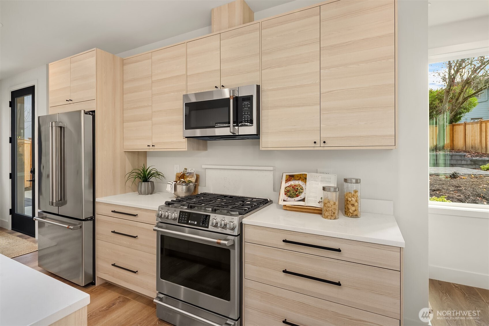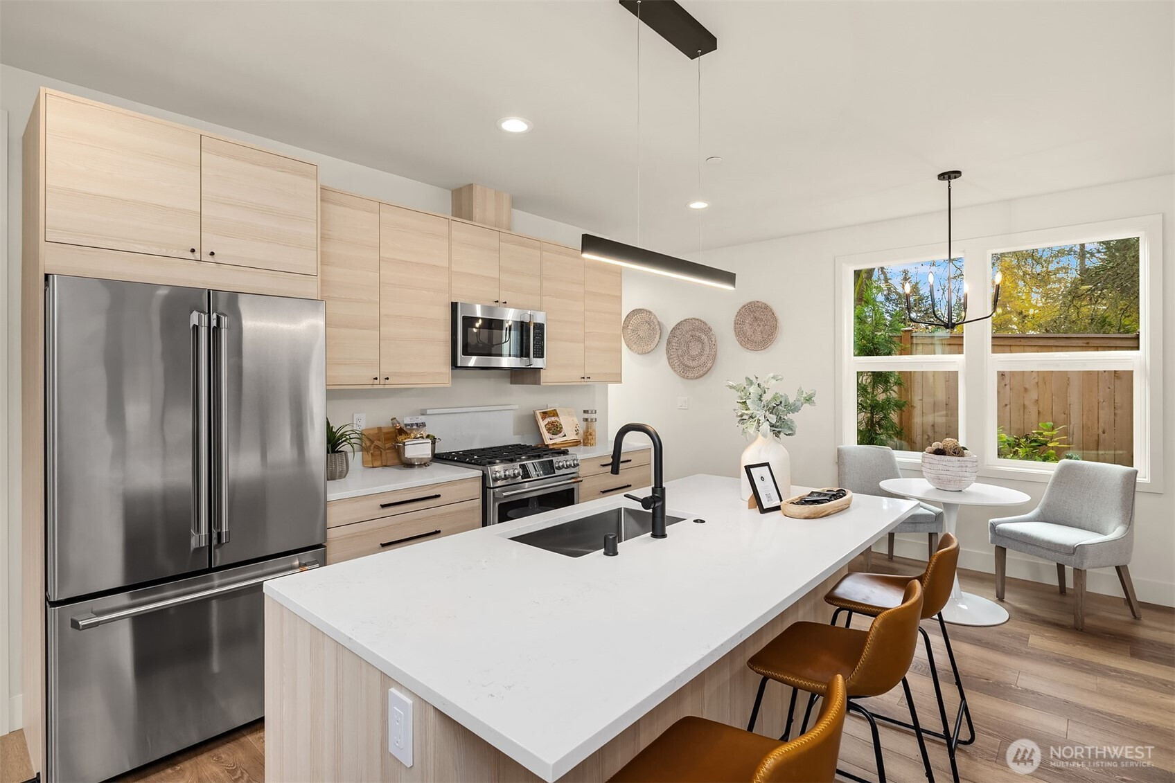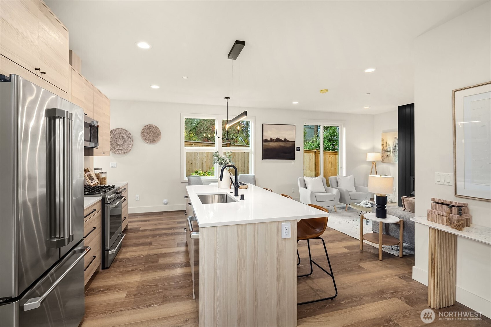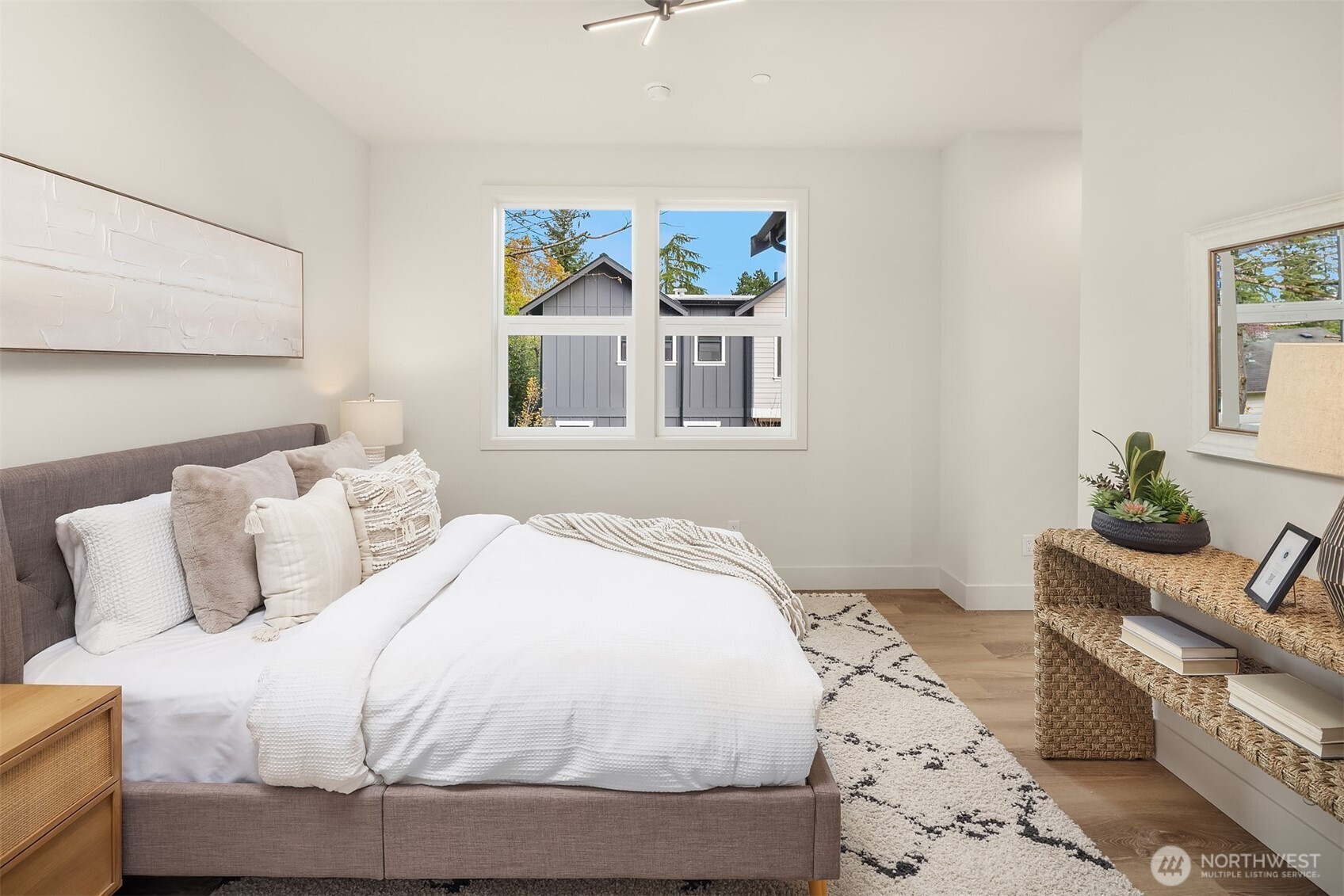 Welcome to this new construction cottage in coveted West of Market. Light-filled main level features open kitchen, dining, and living with fireplace and sliders to a covered patio and fenced yard—perfect for indoor/outdoor living. Kitchen shines with gas range and quartz counters. Upstairs offers a serene primary suite with luxurious bath & WIC. Secondary bedroom includes walk in closet. Full bath and laundry complete this thoughtfully-appointed home. Enjoy proximity to Lake Washington, Waverly Beach Park, and downtown Kirkland. Off-street parking provides peace of mind at the end of the day.