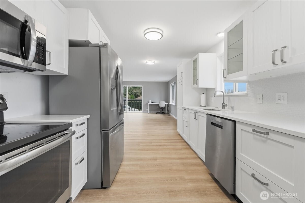 Light-filled one-story home with a finished daylight basement, perfectly suited for multi-generational living, just minutes from SeaTac Airport. Thoughtfully updated throughout, this home features new LVP flooring, a new roof, newer interior and exterior paint, new windows, updated electrical and plumbing, plus a sewer line redone about five years ago. The main level offers a brand-new remodeled kitchen with modern finishes, fresh cabinetry, flowing seamlessly into the inviting living and dining areas—ideal for everyday life and entertaining. Downstairs, the finished daylight basement functions like its own residence with a second kitchen, full-sized washer/dryer, full bath, bedroom, and expansive living area or other flexible living needs.