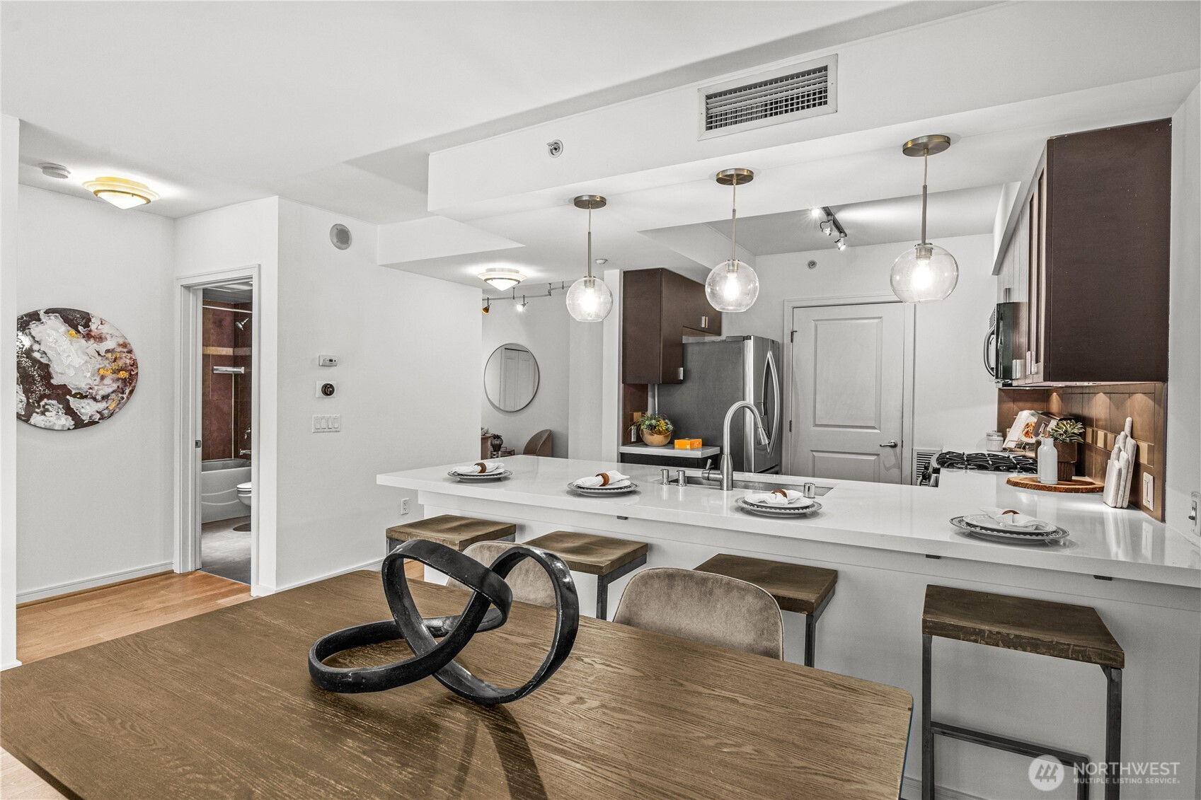 Sophisticated high-rise retreat thoughtfully designed to live like a luxury two-bedroom residence. The oversized den, with a dedicated closet, offers a versatile space perfect as a quiet home office or a secondary guest suite (spacious enough for a full-sized mattress or Murphy bed). Floor-to-ceiling windows frame twinkling city views and provide abundant natural light, all while preserving privacy from neighboring buildings. Move-in ready with freshly painted interiors and new carpeting. The chef’s kitchen is equipped with stainless appliances, gas burners, and an oversized eating counter that flows seamlessly into the living area. The primary suite, with a spacious walk-in closet and a private balcony, overlooks the iconic Seattle cityscape. A/C, in-unit washer and dryer, 1 garage parking space, and 1 private storage room. The Cosmopolitan an premier building with a 99 Walk Score, offers urban living at its finest—walkable to Amazon, Whole Foods, and Seattle’s world-class dining. Amenities include a 24-hour concierge, guest suite, a fitness center with a sauna and jacuzzi, and a lush, park-like rooftop deck with BBQ area overlooking Lake Union. No rental cap and a strong HOA.