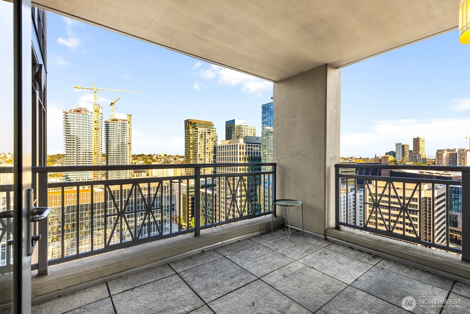 Discover this breathtaking end-unit penthouse on the 33rd floor of The Cosmopolitan with breathtaking vistas. This urban retreat features hardwood floors, a gas fireplace, and a gourmet kitchen with granite counters, Wolf appliances and Sub-Zero fridge. Each bedroom offers plush carpeting and walk-in closets; the primary suite includes a modern en-suite bath with a rain shower and dual vanities. Enjoy in-unit washer/dryer and built-in storage. Relax on your private balcony with breathtaking vistas. Amenities include 24-hour concierge, fitness center, spa with sauna, and a rooftop deck showcasing the Space Needle, Lake Union, and Puget Sound. Perfectly situated in Denny Triangle, near Amazon, Whole Foods, and light rail. Don't miss this gem!