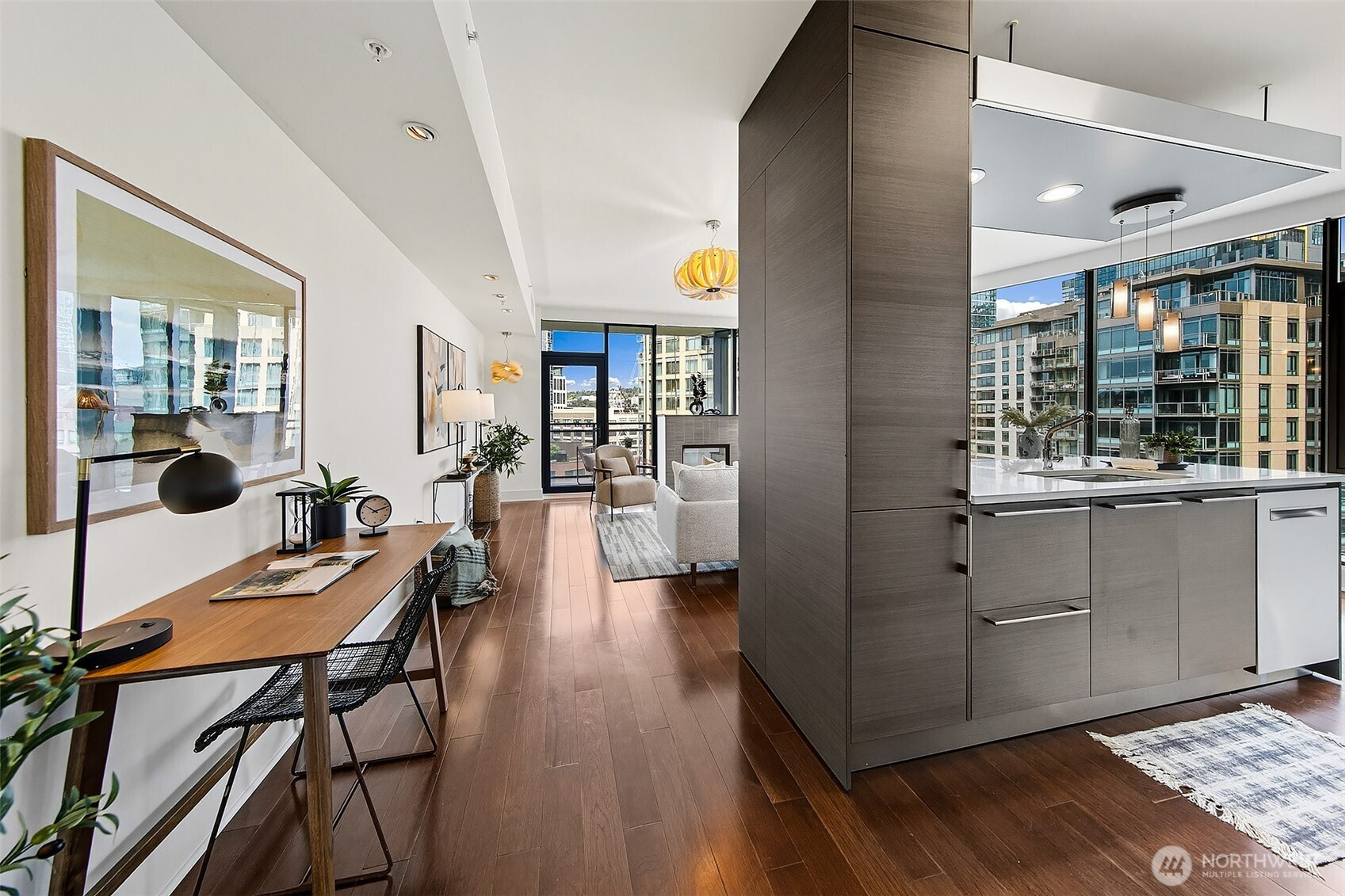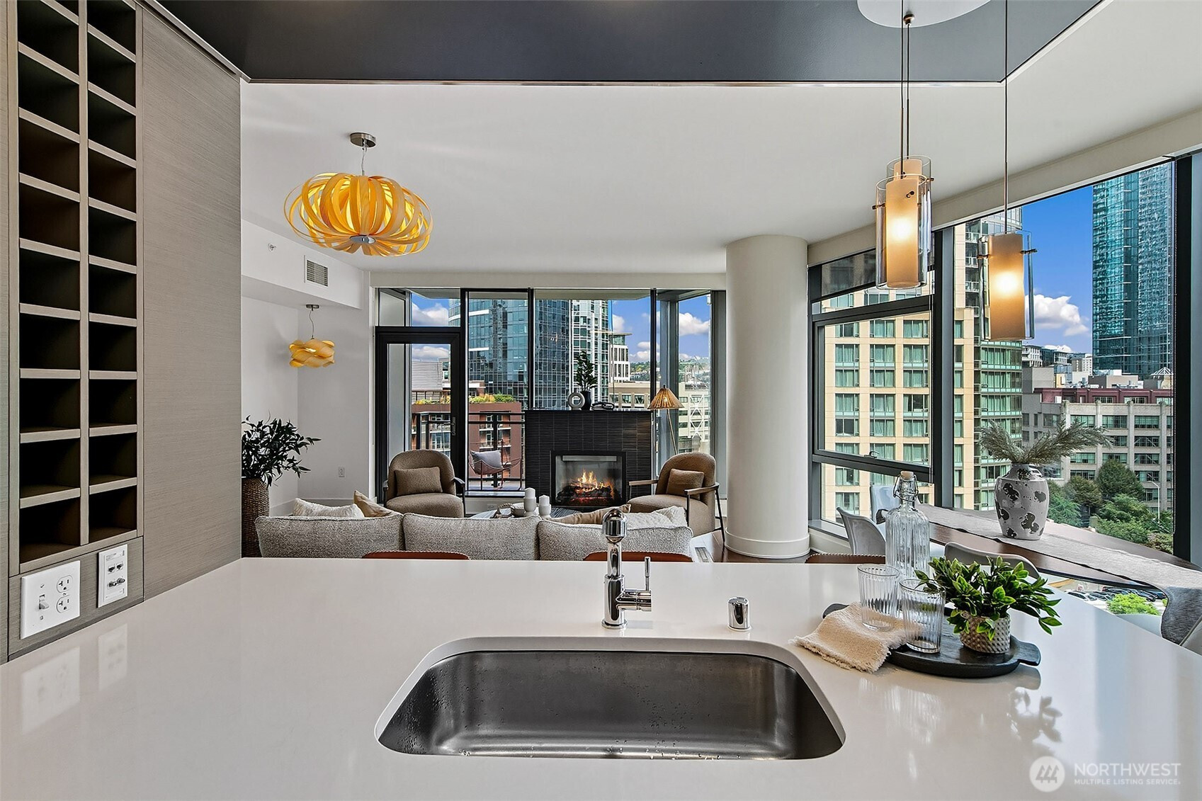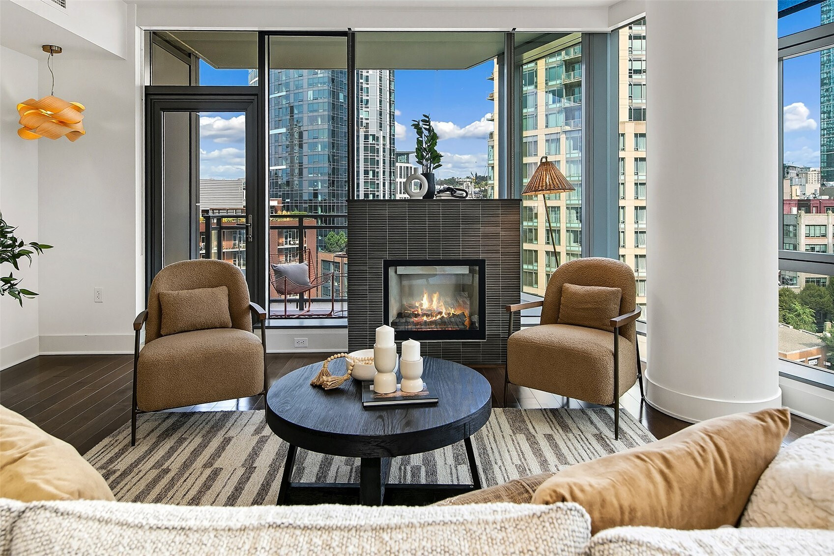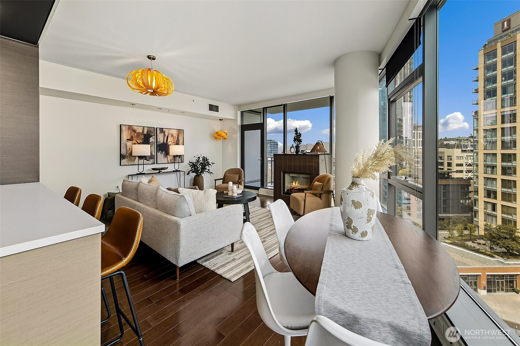 Luxury condominium living in the heart of South Lake Union. City views and Lake Union shine from floor to ceiling window walls that wrap the southeast corner of this spacious 1388 sq ft 2 bedroom at Enso Condominiums. Open living layout with high ceilings and spacious rooms. Hardwood floors and a gas fireplace anchor the living room with a private balcony overlooking Westlake with corridor views towards Lake Union. Beautiful kitchen with Eggersmann cabinets, stone counters, gas cooktop and display built-ins that frame the open eating bar. Gracious primary suite with 5-piece ensuite bath and huge walk-in closet; 2nd bedroom and bath complete this wonderful floorplan. Enso is a LEED Gold high-rise with concierge staff in a prime location.