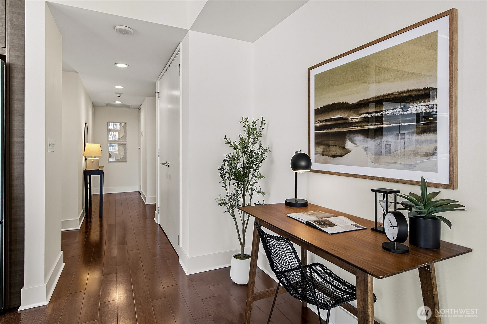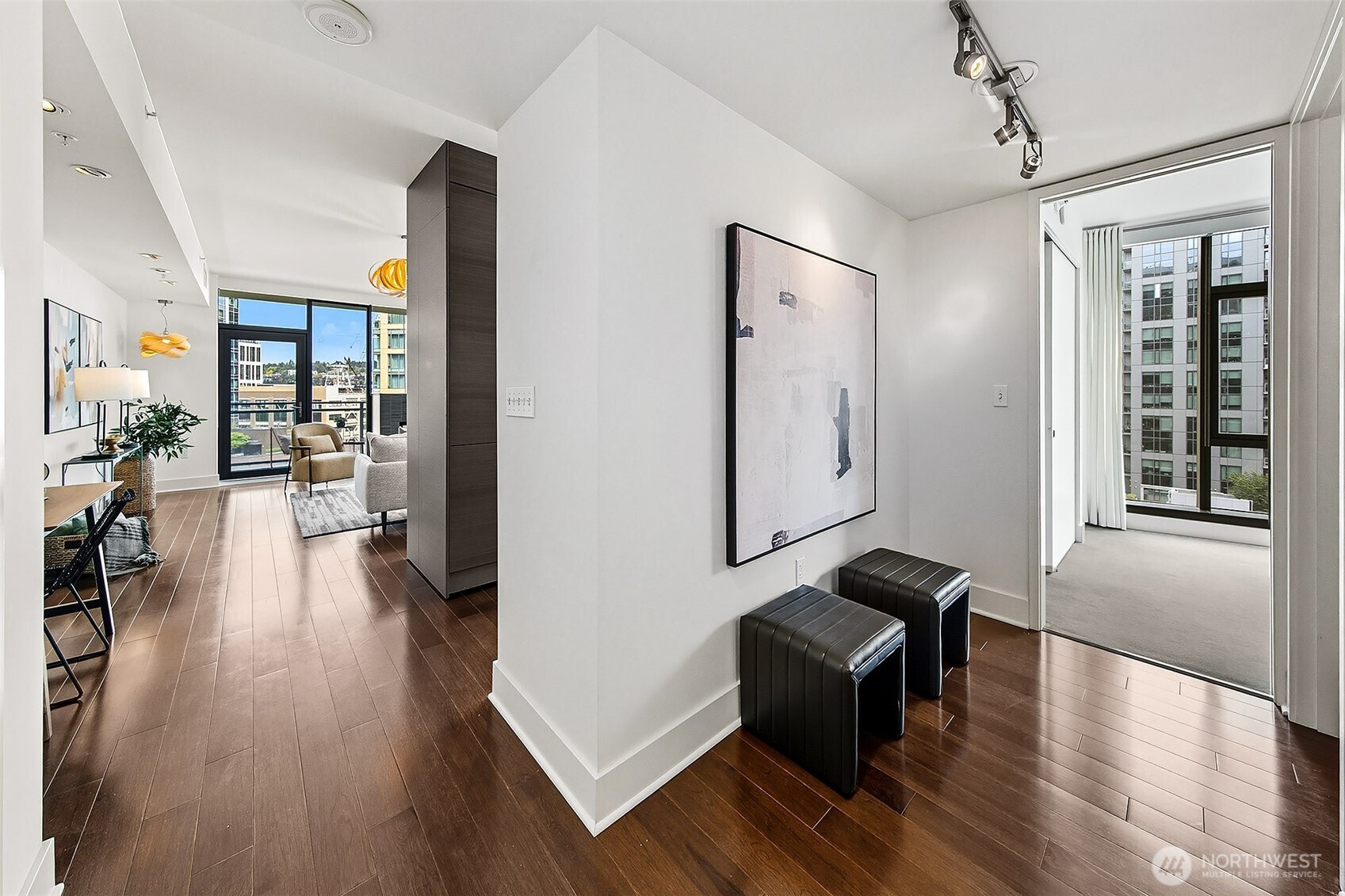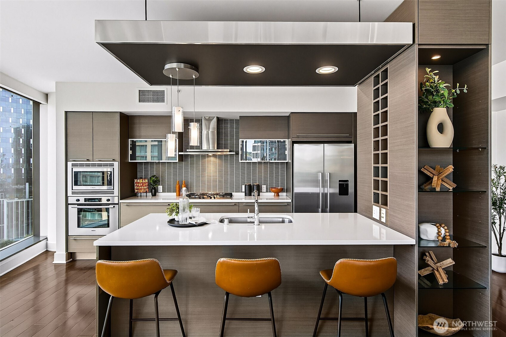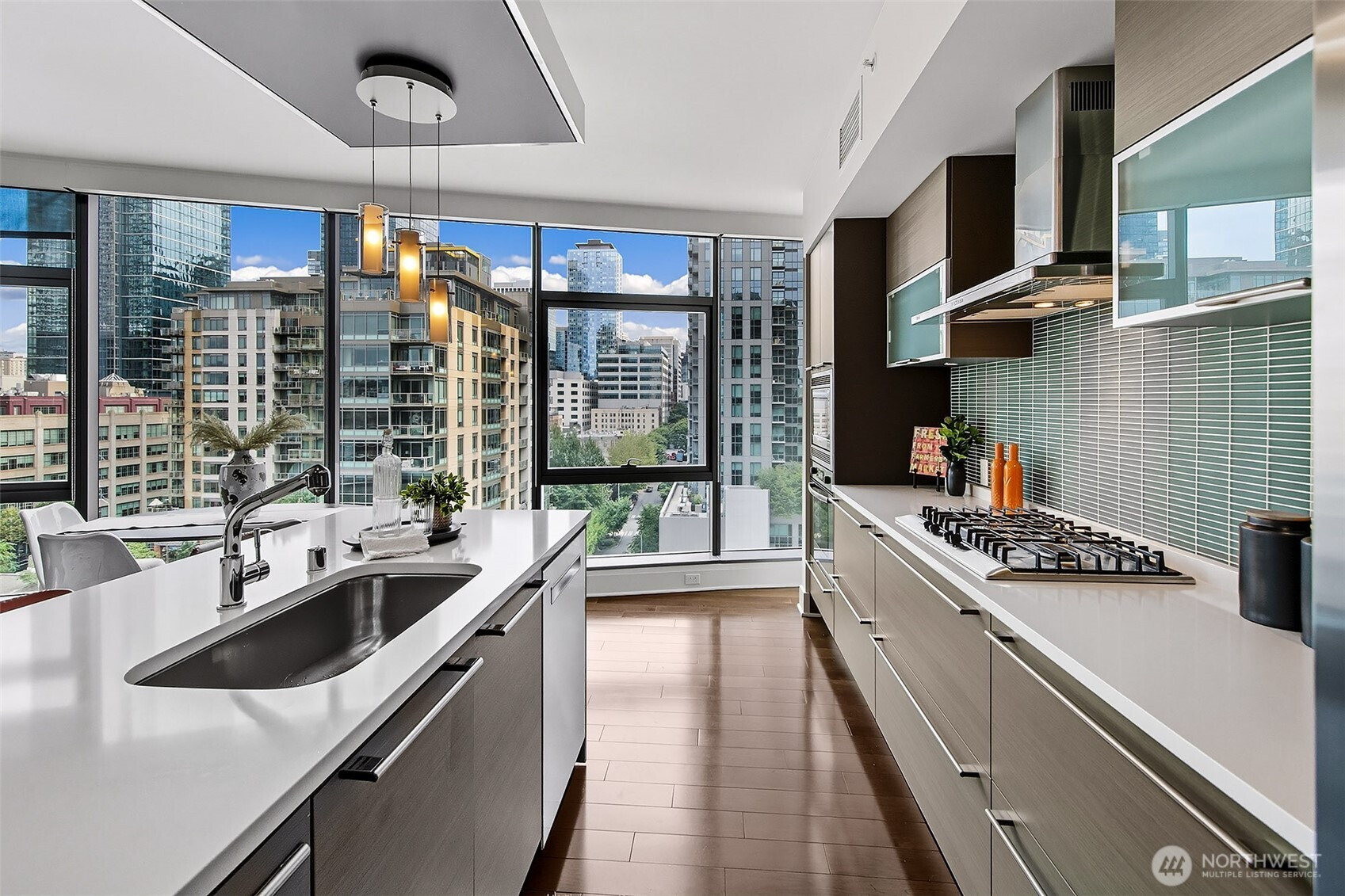 Luxury condominium living in the heart of South Lake Union. City views and Lake Union shine from floor to ceiling window walls that wrap the southeast corner of this spacious 1388 sq ft 2 bedroom at Enso Condominiums. Open living layout with high ceilings and spacious rooms. Hardwood floors and a gas fireplace anchor the living room with a private balcony overlooking Westlake with corridor views towards Lake Union. Beautiful kitchen with Eggersmann cabinets, stone counters, gas cooktop and display built-ins that frame the open eating bar. Gracious primary suite with 5-piece ensuite bath and huge walk-in closet; 2nd bedroom and bath complete this wonderful floorplan. Enso is a LEED Gold high-rise with concierge staff in a prime location.