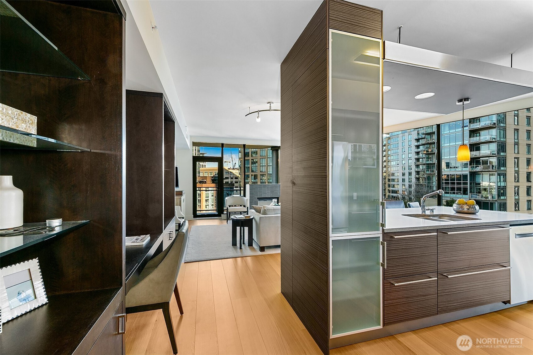 Convenience, luxury and quality define this updated corner 2 bedroom at Enso in the heart of South Lake Union. This fully furnished turn-key condominium with custom designer furniture included, wide plank oak floors, custom lighting, and clever built-ins fulfill city living dreams. High ceilings with a dramatic curved wall of windows wrap the southeast corner providing a jewel box of light with city and Lake Union views from inside and out with a private balcony to expand your living outdoors. Open living layout with a gas fireplace to cozy up and a display kitchen to show off your skills. 2 spacious bedrooms with a 5-piece ensuite bath and huge walk-in closet in the primary. Find your urban respite in this comfortable and contemporary community with full time facility manager and concierge staff, fitness center, community rooms, deck with bbqs, guest suite, and well run and financially capable building. Google fiber available. Rentals (6+ mo) & Pets allowed. Two parking spaces and storage included. LEED Gold Certified concrete and steel building. Whole Foods, restaurants, and shopping all within blocks.