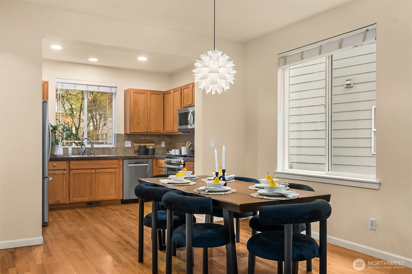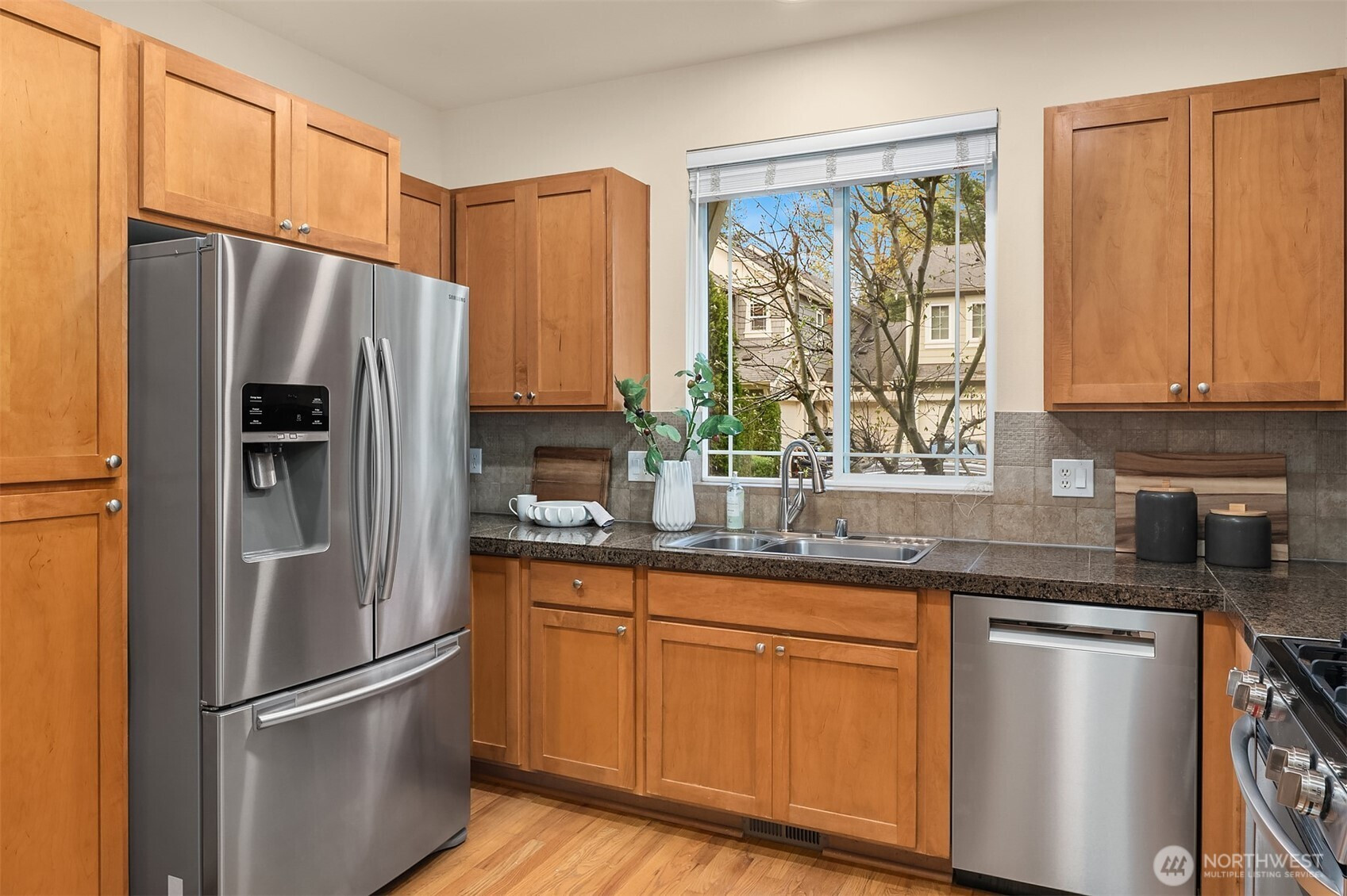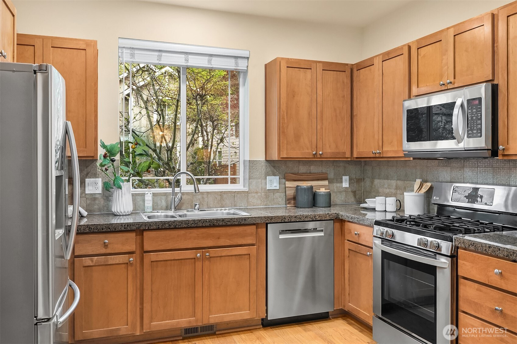 Welcome to Redmond Ridge — one of Redmond's most sought-after communities, where mature tree-lined streets meet convenient access to the region's top tech employers. This well-appointed 3-bedroom, 2.5-bath single house with a 2-car garage offers 1,630 sq ft of thoughtfully designed living space. The main floor impresses with 9-ft ceilings, rich hardwood floors throughout, and a welcoming gas fireplace with stone surround — the perfect backdrop for both everyday living and entertaining. The gorgeous kitchen features maple cabinetry, granite countertops, and a full tile backsplash, complemented by a newer dishwasher ready for daily use. Upstairs, the generous primary suite includes a walk-in closet, with two additional bedrooms and a full bath rounding out the upper level. Recent updates bring true peace of mind: brand-new carpet, fresh interior paint, a new sump pump, a smart thermostat system for year-round comfort, and a near-new roof — so you can move in and simply enjoy. The garage is equipped with a ChargePoint EV charger, making it effortlessly ready for your electric vehicle. Located minutes from Microsoft, SpaceX / Starlink, and the broader Redmond tech corridor, with easy access to SR-520, top-rated Lake Washington school district, dining, and shopping. Whether you're a tech professional or a savvy investor, this Redmond Ridge gem checks every box!