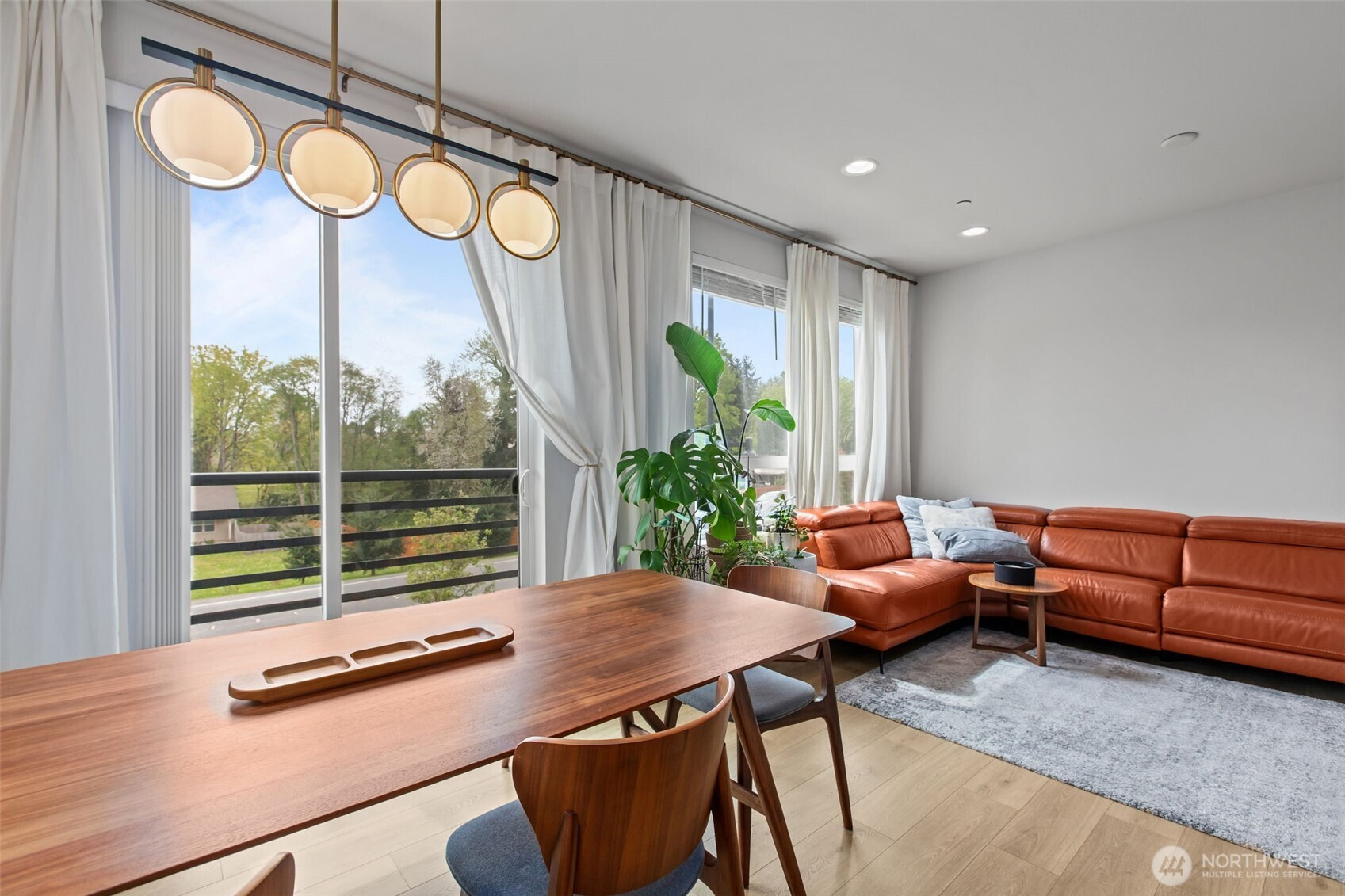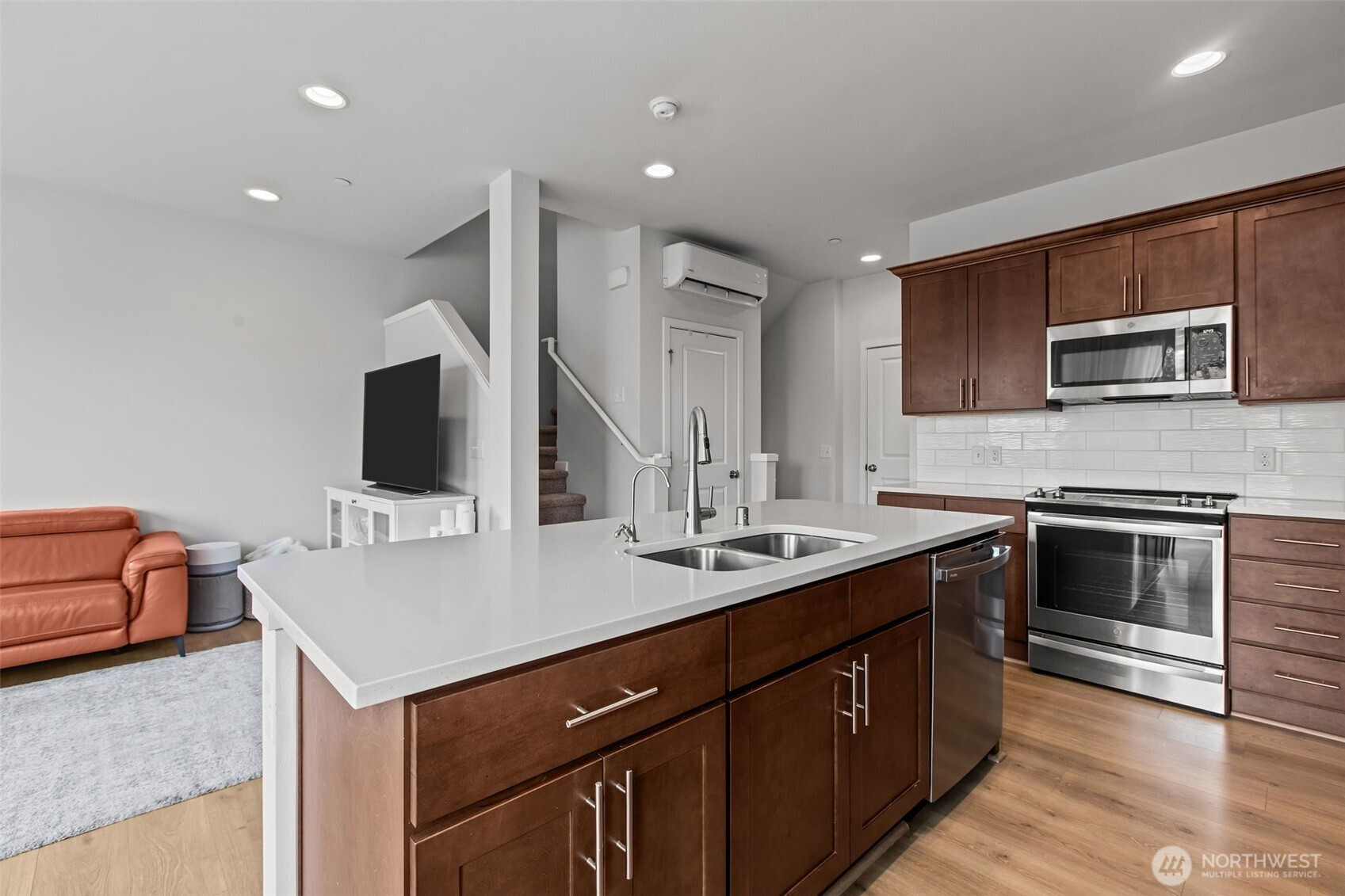 Experience the best of Earlington Village in this exceptional south facing end unit completed in 2021. This home is designed to capture amazing natural light through expansive windows that keep the living spaces bright and inviting year round. Standing out from others in the community, this unit features an additional mini-split system for superior climate control across multiple levels. The thoughtful layout begins on the lower level with a private bedroom and bathroom, offering a versatile space perfect for a quiet home office, guest suite, or extra bedroom with its own patio access. The open level main floor flows seamlessly between an upgraded kitchen featuring high end stainless steel appliances, a huge island, sleek quartz countertops, and upgraded light fixtures. Upstairs you will find three more generously sized bedrooms, including a luxurious primary suite that offers breathtaking views of Mount Rainier. Modern touches like wide plank flooring and designer tile accents elevate the contemporary feel throughout the home. Residents enjoy a close knit community atmosphere with access to a private play area, basketball court, and community garden. Perfectly situated for a modern lifestyle, this home offers easy access to The Landing in Renton for premier shopping, dining, and Topgolf, with minutes away connections to I-5, I-405, and HWY 167 for a seamless commute to Seattle or Bellevue.