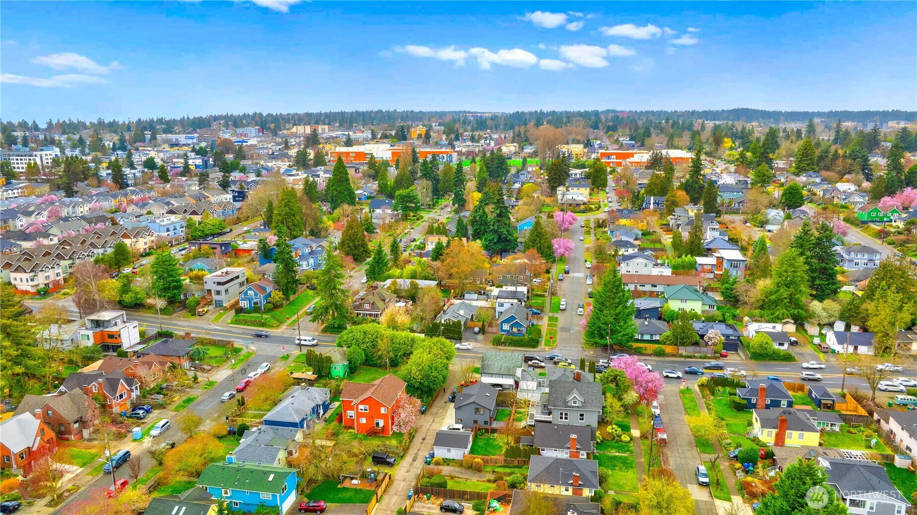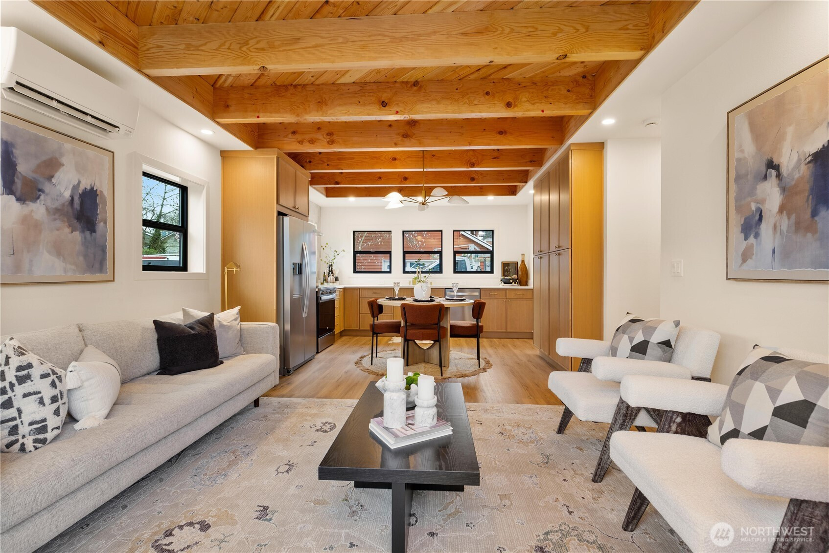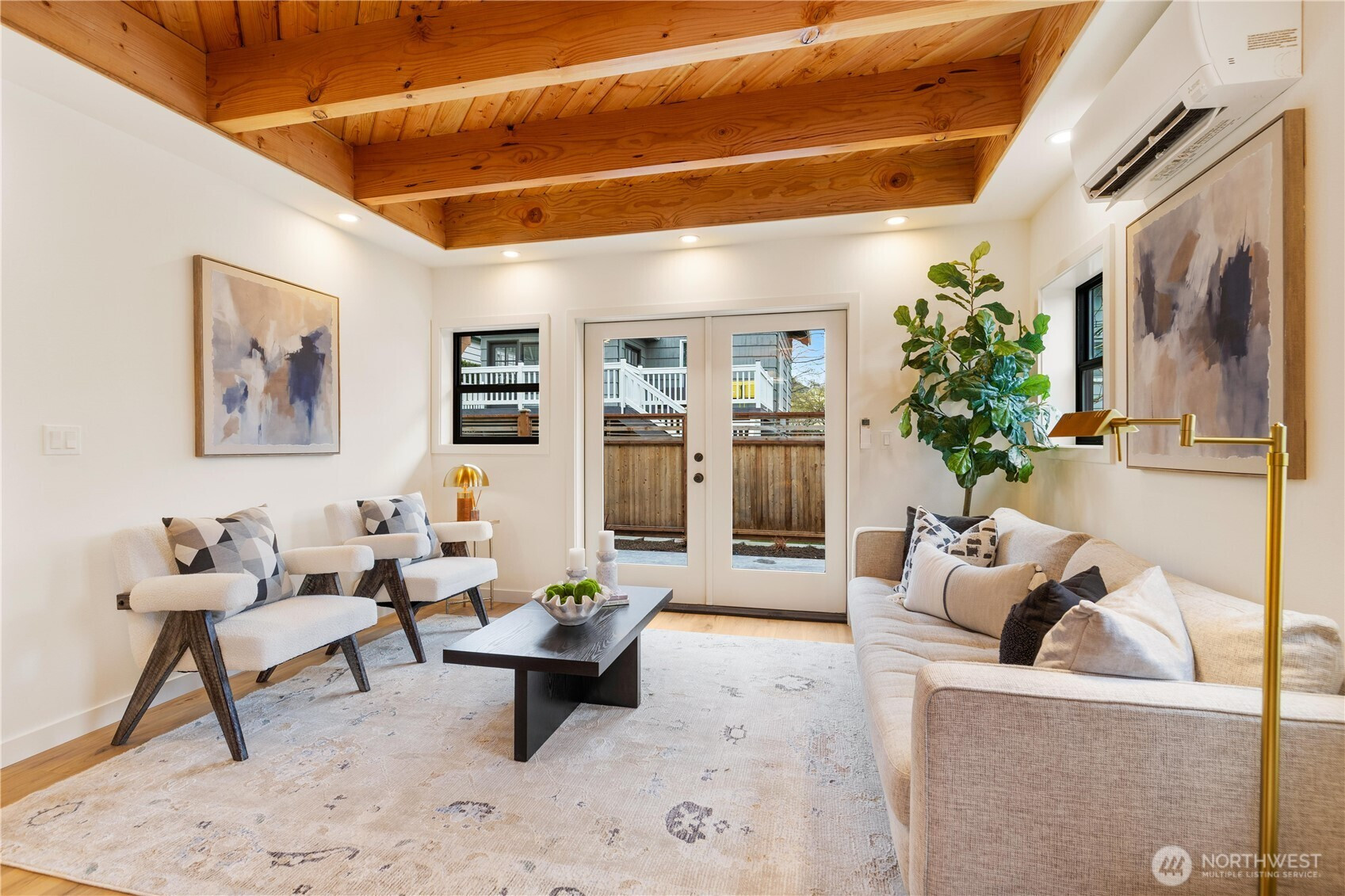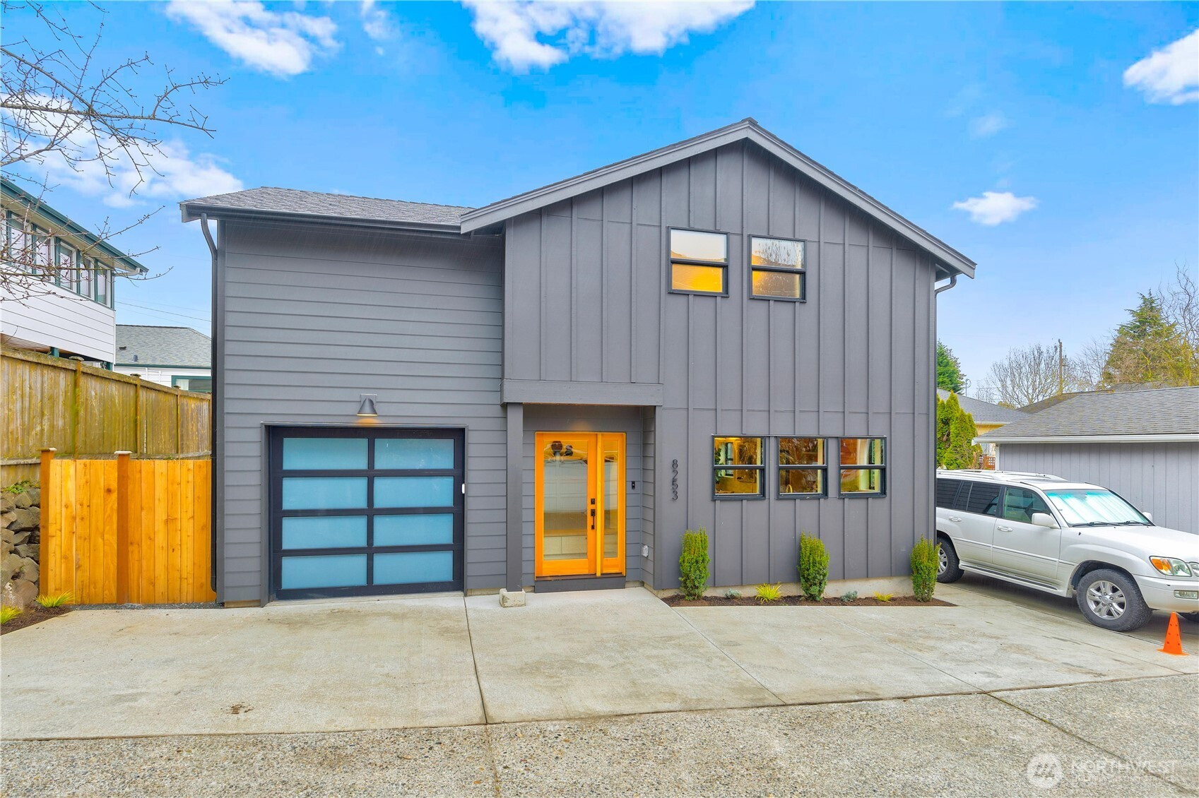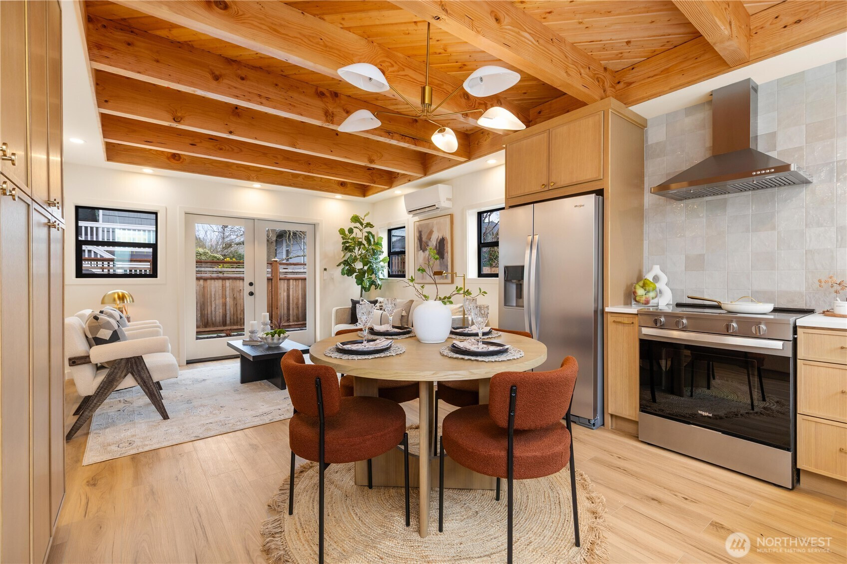 High-end custom Northwest build in an ideal location just moments from Green Lake. A striking exterior sets the tone for the thoughtfully designed interior where every inch has been carefully curated and maximized for modern living. The spacious kitchen is anchored by oak cabinetry and framed by black windows that flood the space with natural light, while the exposed fir ceiling introduces warmth and architectural character that carries throughout the home. Dining seamlessly connects to the inviting living room with French doors opening to the patio and newly landscaped, usable yard—perfect for effortless indoor-outdoor living. A stylish powder room and convenient garage access complete the main level. Upstairs, a beautifully lit stairway with designer sconces and a skylight leads to the exceptional primary retreat—a true rarity. Vaulted ceilings, a generous walk-in closet, and a spa-inspired five-piece bath with double vanity and soaring ceilings create a space that feels both luxurious and serene. Two additional bedrooms and laundry on the same level provide the ideal layout. A refined custom home offering elevated design, premium finishes, and a prime location just minutes to parks, dining, shops, commuter routes, and everything Green Lake living has to offer.