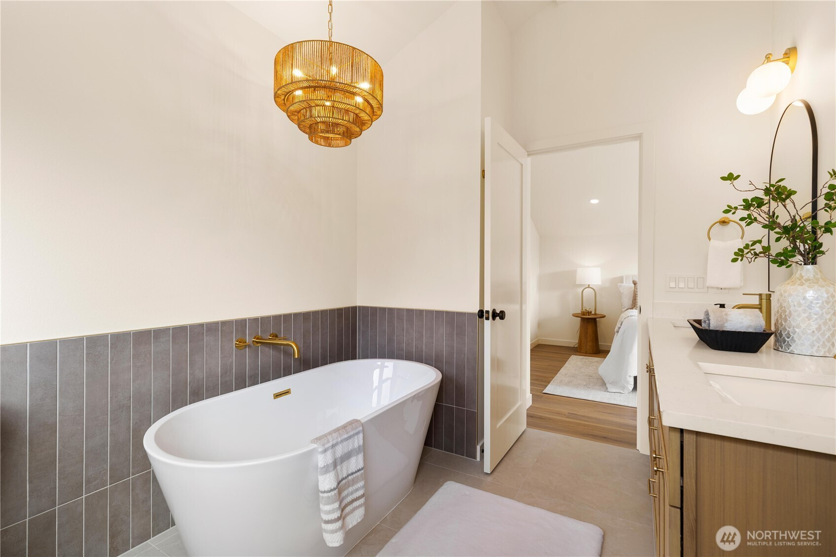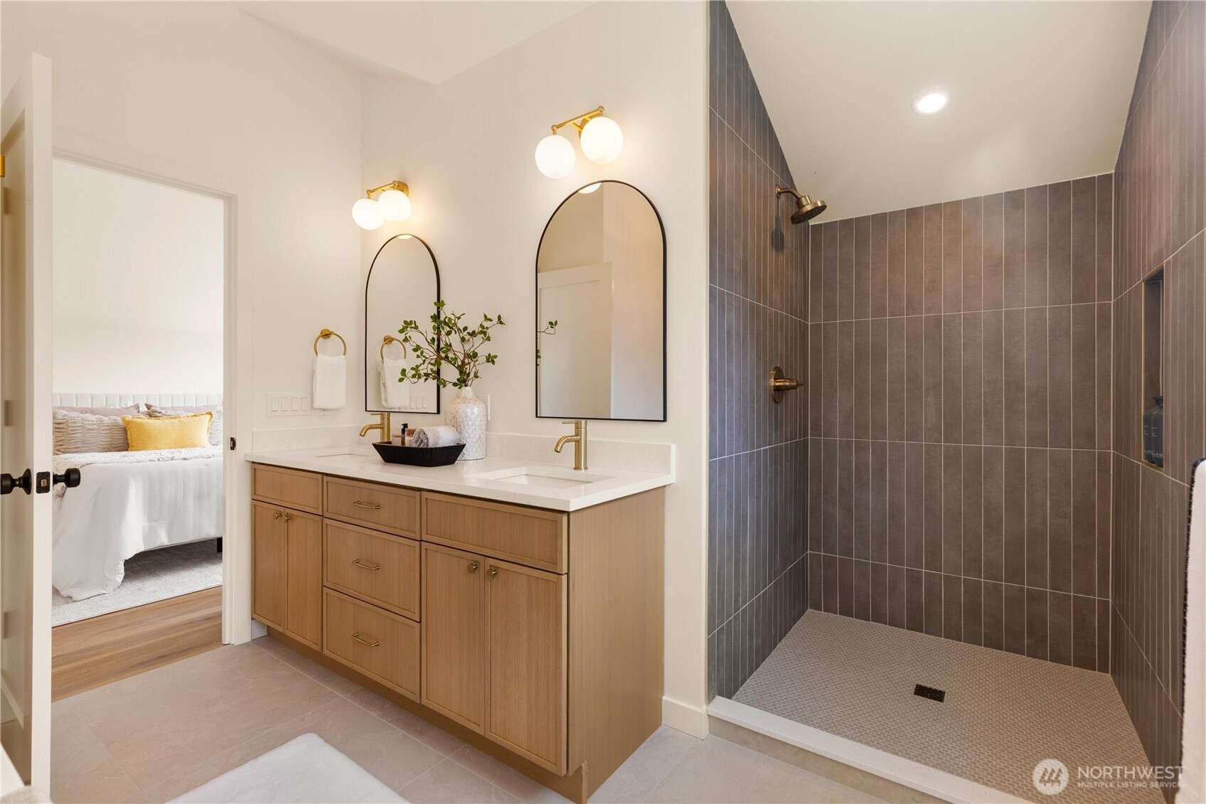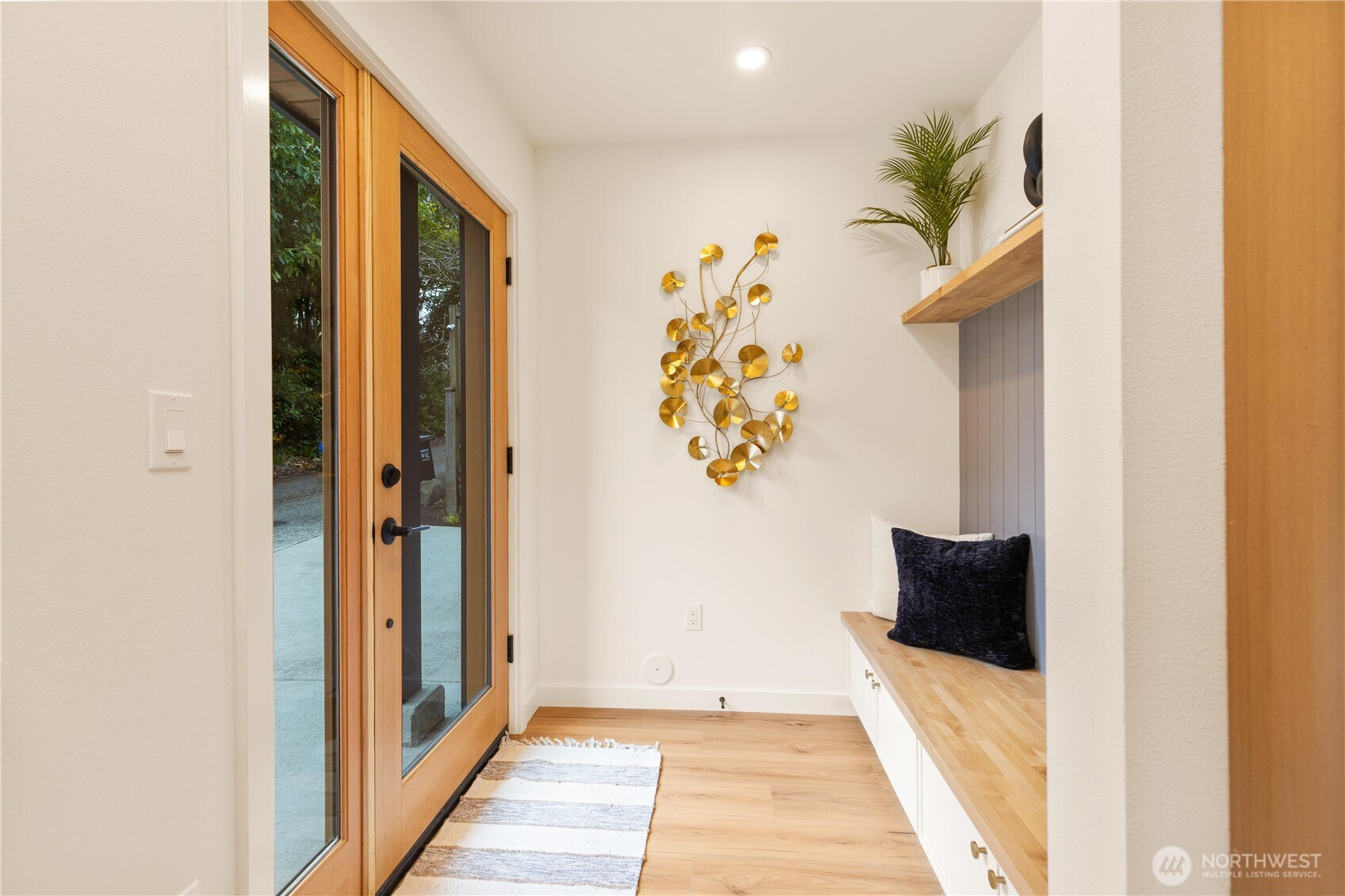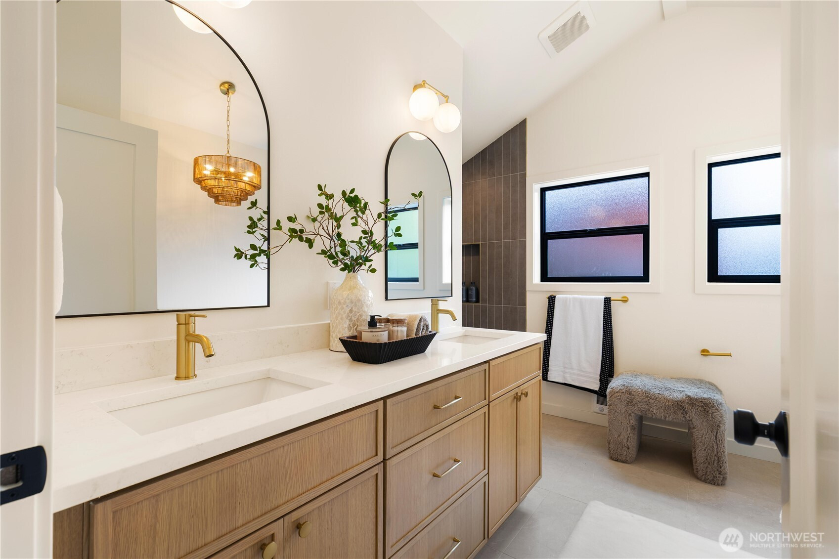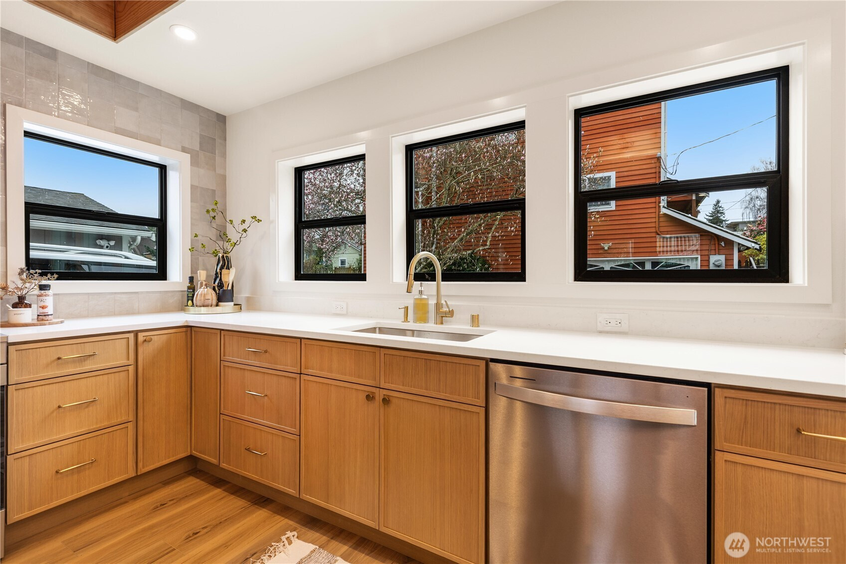 High-end custom Northwest build in an ideal location just moments from Green Lake. A striking exterior sets the tone for the thoughtfully designed interior where every inch has been carefully curated and maximized for modern living. The spacious kitchen is anchored by oak cabinetry and framed by black windows that flood the space with natural light, while the exposed fir ceiling introduces warmth and architectural character that carries throughout the home. Dining seamlessly connects to the inviting living room with French doors opening to the patio and newly landscaped, usable yard—perfect for effortless indoor-outdoor living. A stylish powder room and convenient garage access complete the main level. Upstairs, a beautifully lit stairway with designer sconces and a skylight leads to the exceptional primary retreat—a true rarity. Vaulted ceilings, a generous walk-in closet, and a spa-inspired five-piece bath with double vanity and soaring ceilings create a space that feels both luxurious and serene. Two additional bedrooms and laundry on the same level provide the ideal layout. A refined custom home offering elevated design, premium finishes, and a prime location just minutes to parks, dining, shops, commuter routes, and everything Green Lake living has to offer.