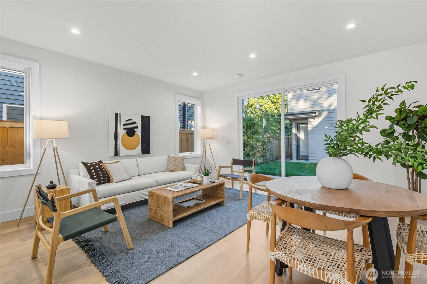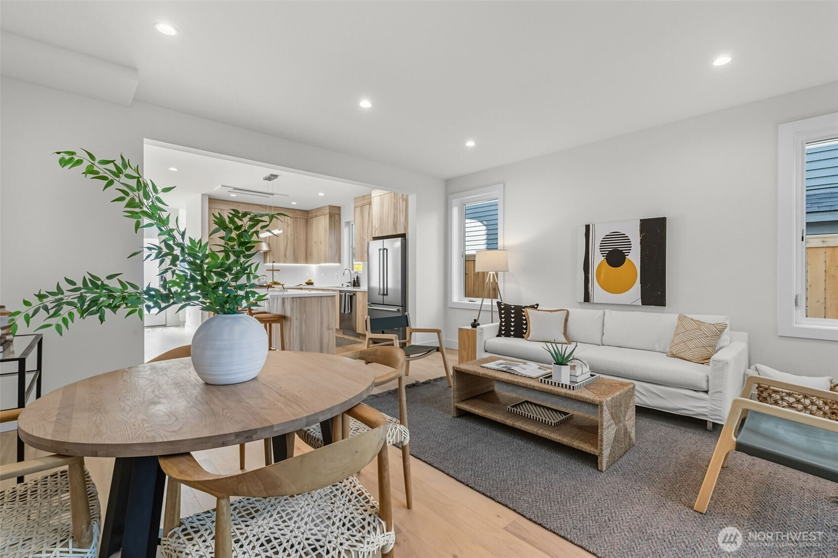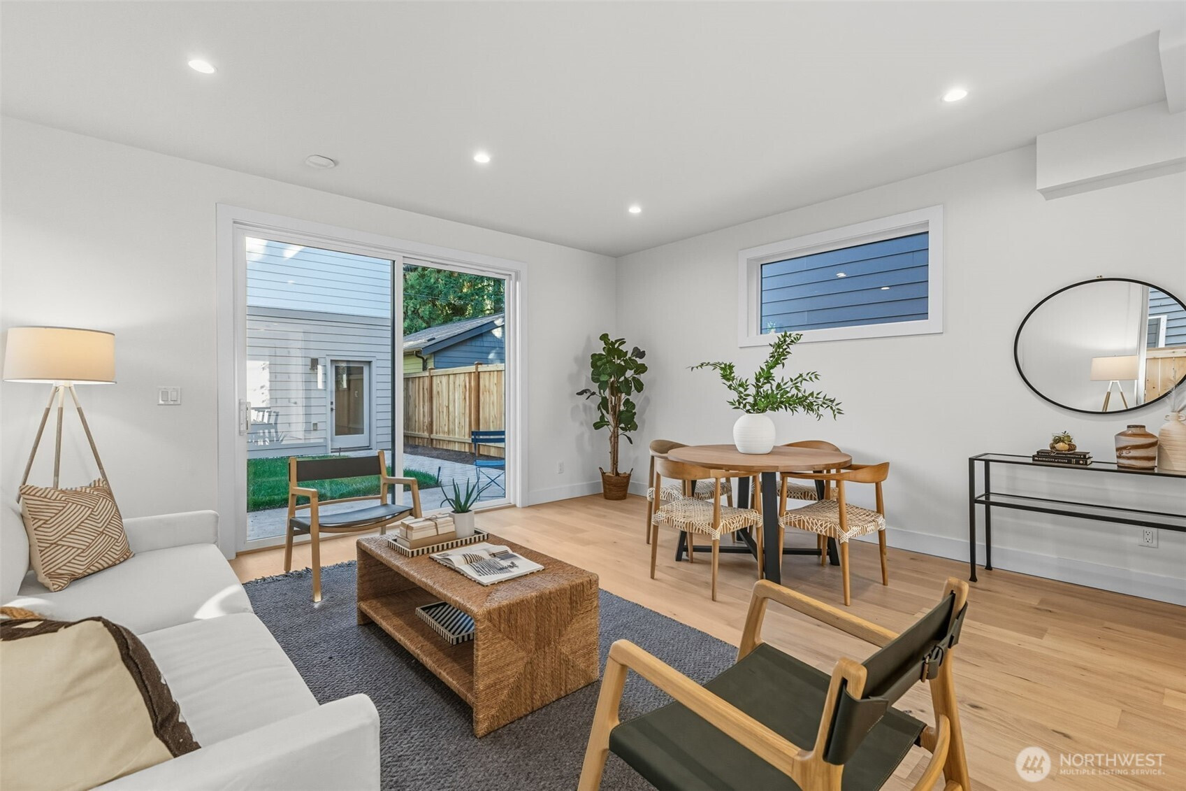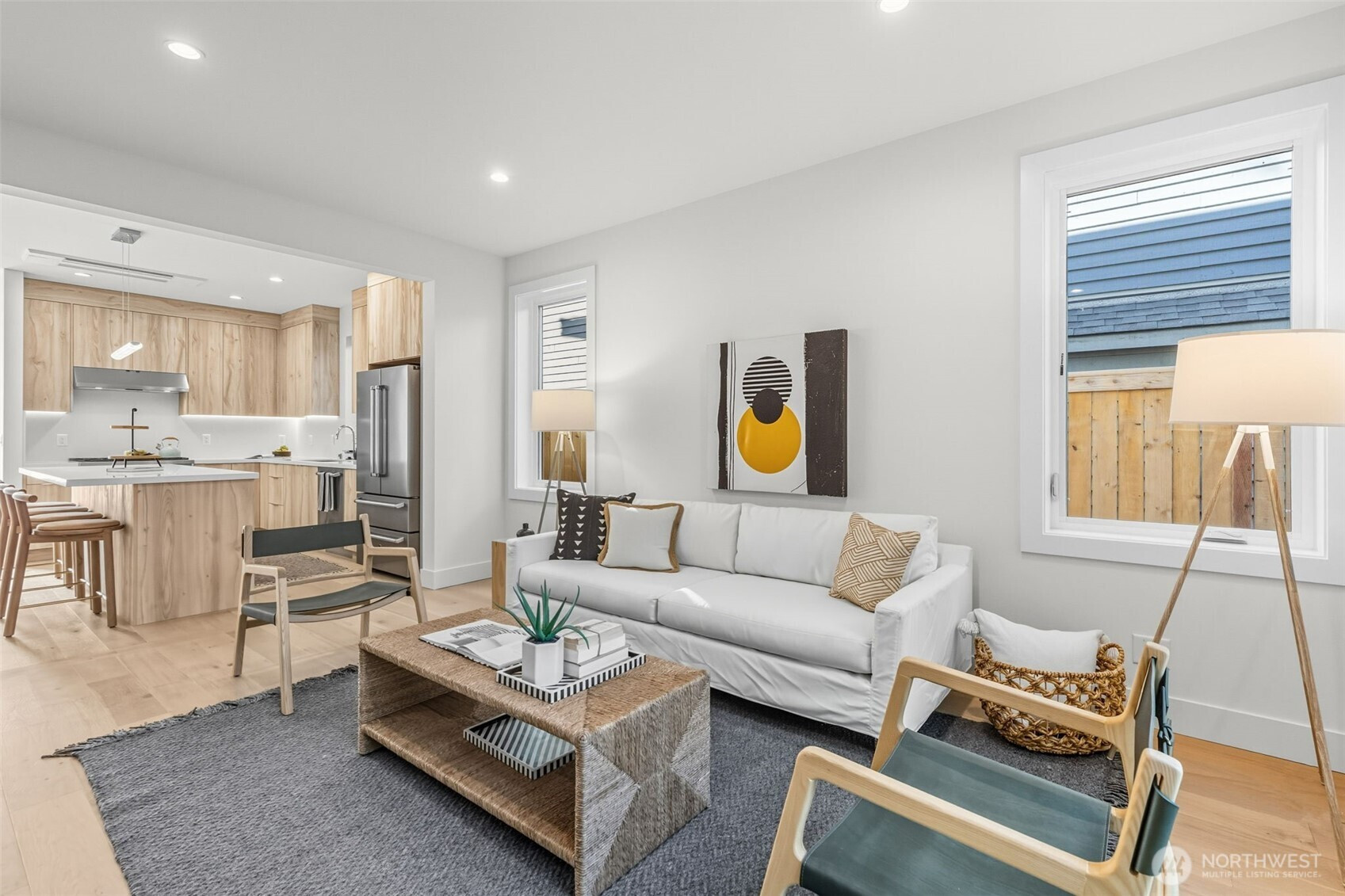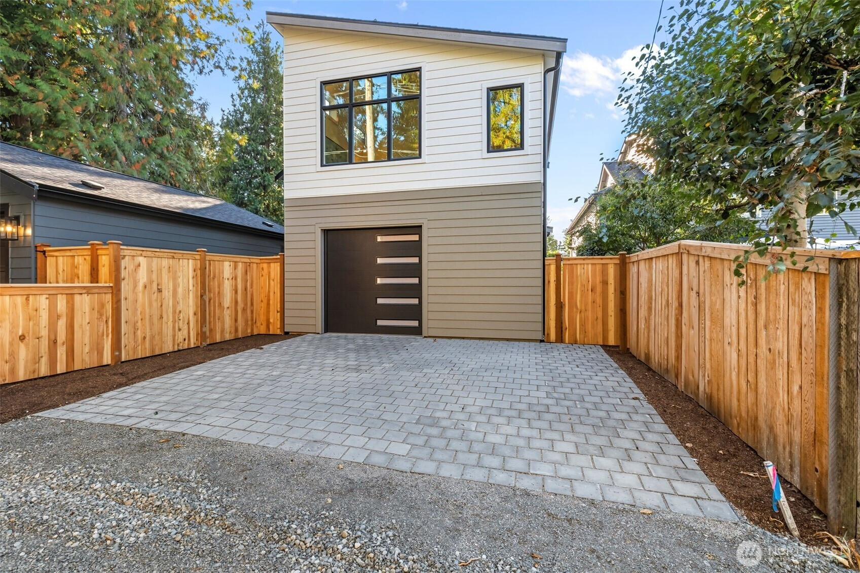Beautifully designed new construction in Wedgwood with versatile living options. The 1,436 sf main home offers an open concept kitchen/dining/living area with powder bath, plus an upper-level primary suite with spa bath and heated floors, two guest bedrooms and shared full bath. Modern finishes include engineered hardwoods throughout + efficient mini-split heating/cooling. Enjoy a fully fenced yard shared with the garage/studio. Above the one-car garage, a 502 sf private studio provides a kitchenette, full bath, hardwoods, and mini-split—perfect for home office, movie nights, or creative use. Quality construction, smart layout and excellent location make this a rare find in one of Seattle’s most desirable neighborhoods.