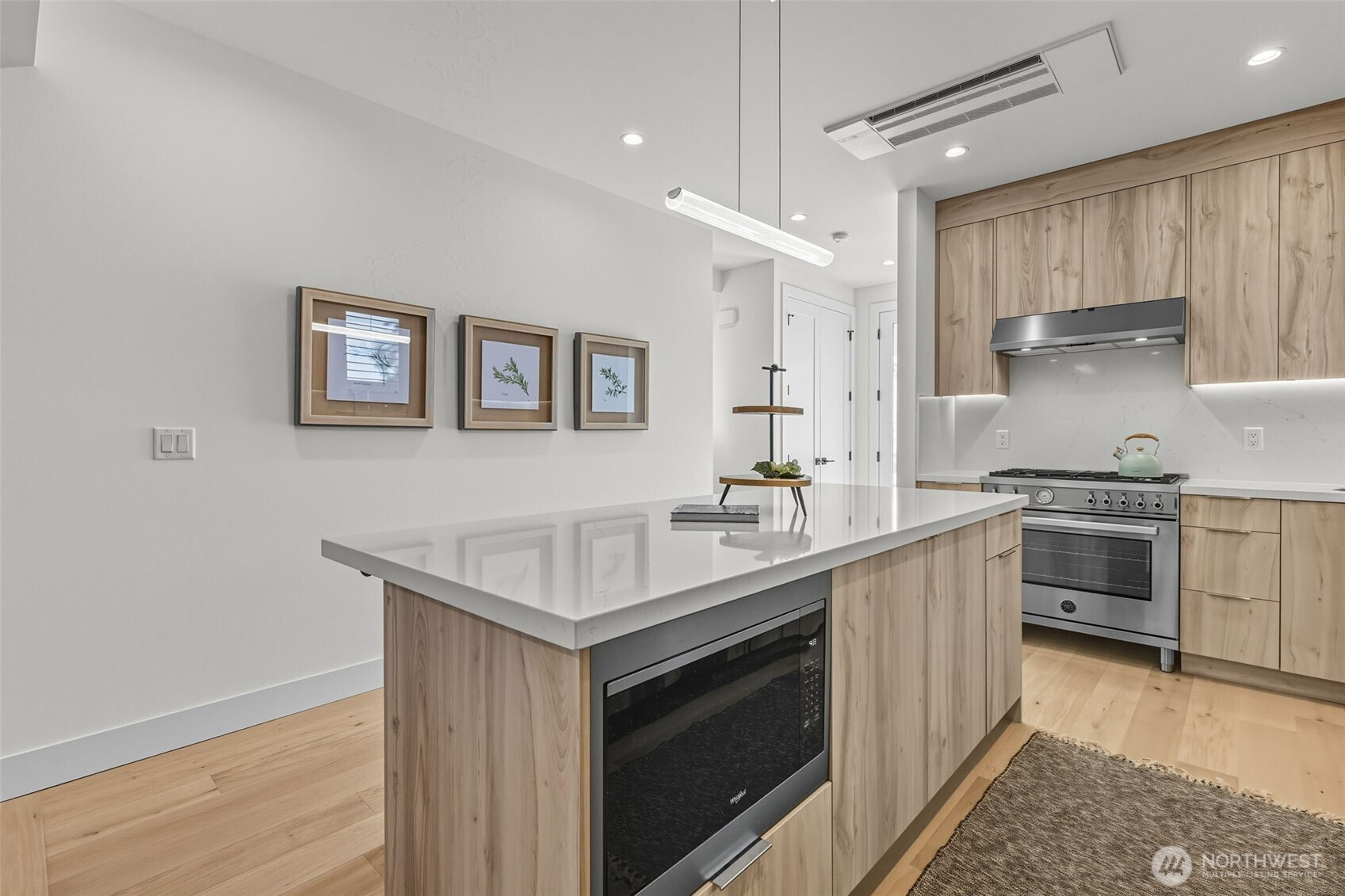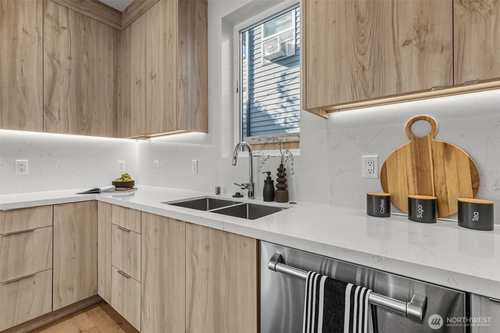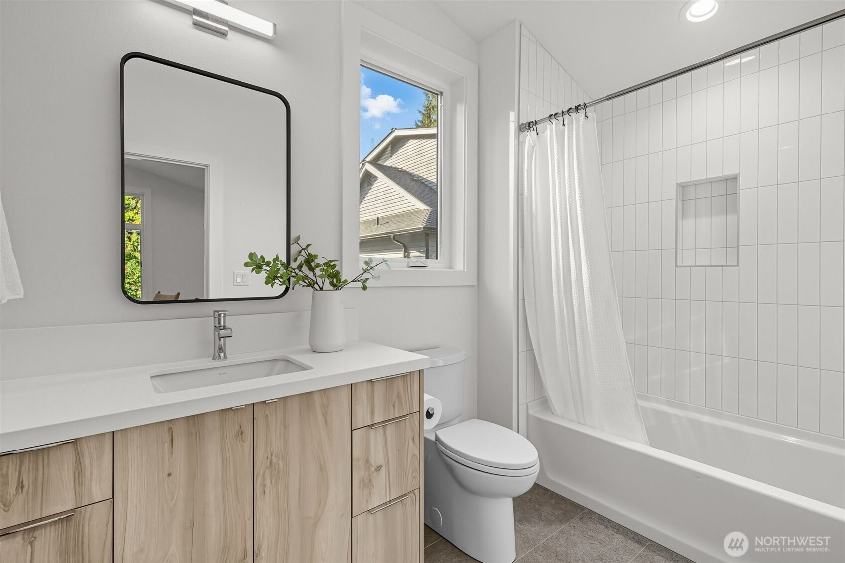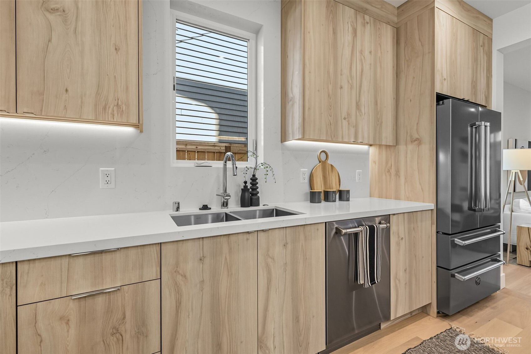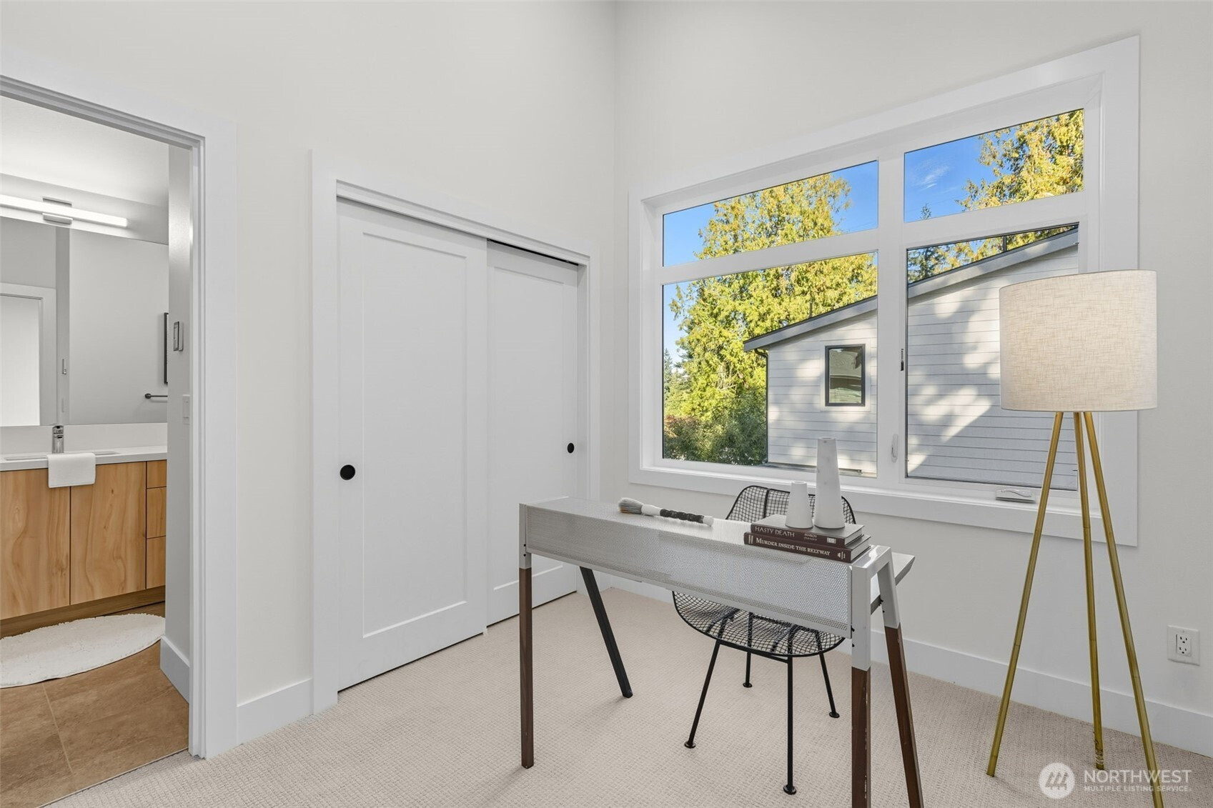Beautifully designed new construction in Wedgwood with versatile living options. The 1,436 sf main home offers an open concept kitchen/dining/living area with powder bath, plus an upper-level primary suite with spa bath and heated floors, two guest bedrooms and shared full bath. Modern finishes include engineered hardwoods throughout + efficient mini-split heating/cooling. Enjoy a fully fenced yard shared with the garage/studio. Above the one-car garage, a 502 sf private studio provides a kitchenette, full bath, hardwoods, and mini-split—perfect for home office, movie nights, or creative use. Quality construction, smart layout and excellent location make this a rare find in one of Seattle’s most desirable neighborhoods.
