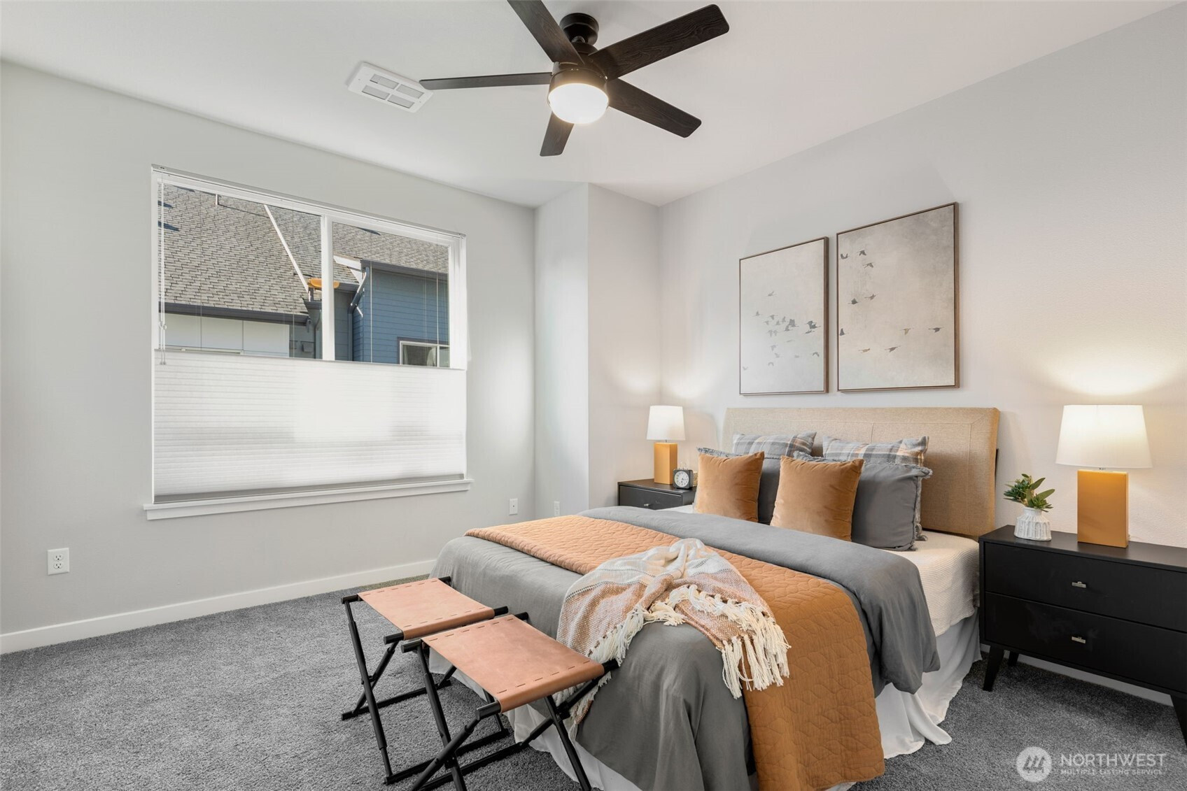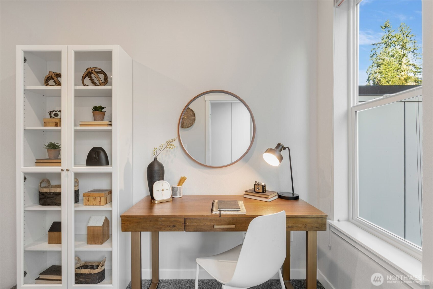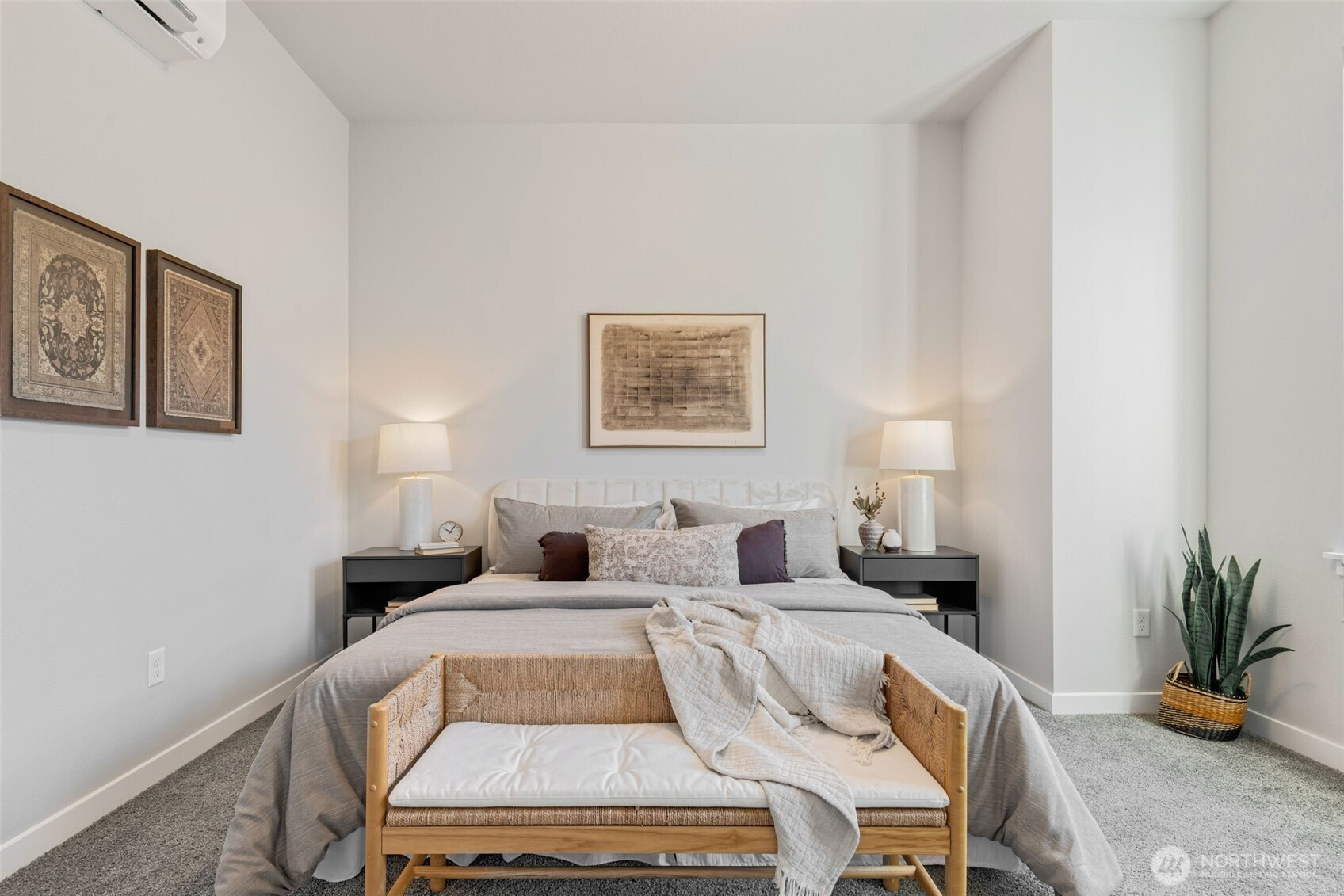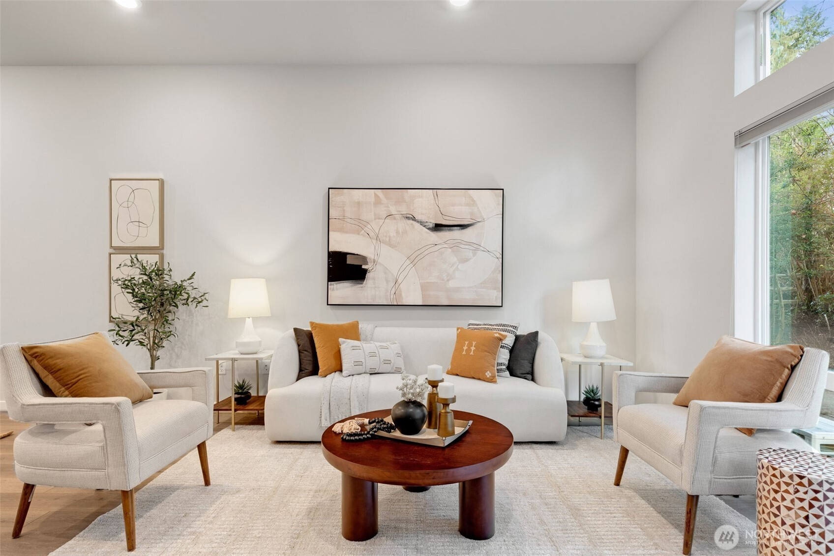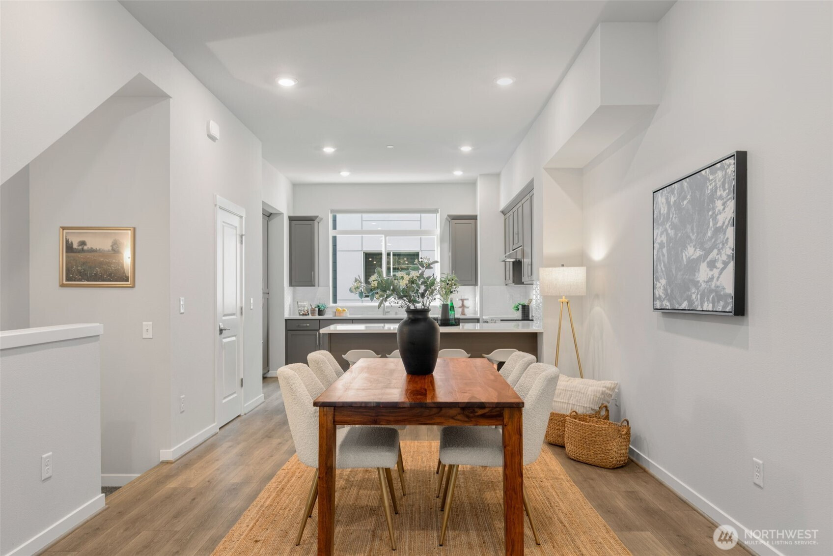 Welcome to elevated modern living in this beautifully crafted 3-bedroom, 2.25-bath townhouse where thoughtful design and everyday comfort come together seamlessly. Soaring ceilings and large windows create an airy open-concept main level, while luxury vinyl plank flooring and contemporary finishes create a warm, sophisticated ambiance. The seamless flow between the living, dining, and kitchen spaces makes both entertaining and daily living effortless. At the heart of the home, the stunning kitchen features quartz countertops, abundant cabinetry, stainless-steel appliances, and generous prep and pantry space—perfectly designed for gathering and gourmet inspiration alike. Upstairs, two spacious bedrooms with expansive windows and tall ceilings share a well-appointed full bath with dual vanities. The roomy top-floor primary suite offers a private sanctuary complete with an ensuite bath and dual closets. Just outside the primary, a versatile office or reading nook provides the ideal flex space. Step onto the rooftop deck overlooking a serene wooded backdrop—an inviting retreat for morning coffee or evening unwinding. The tandem two-car garage offers exceptional storage and flexibility, while EV charging adds modern convenience. Ideally located near downtown Bothell, the Burke-Gilman Trail, Lake Washington, and major commuter routes (522 and I-405), this home delivers refined, low-maintenance living in a prime setting.