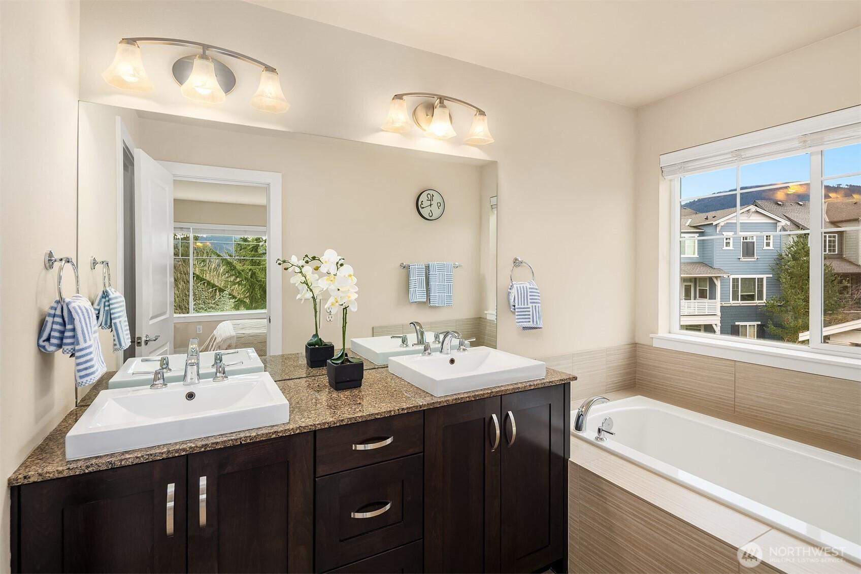 Former model home and immaculate move-in ready detached home in West Highlands Park offering nearly 2000 sq ft of living space. The main level showcases a light-filled Great Room with spacious living and dining that seamlessly flows to the huge Espresso colored kitchen with expansive countertop and cabinet space - perfect for both chefs and entertaining. A walk-in pantry and adorable nook leads to the covered deck. Newly installed white oak floors run throughout the entire home for ease, style & continuity. This 3-bedroom home features a versatile entry-level bedroom or private office with an ensuite full bath, making it ideal for guests, multigenerational living or remote work. Upstairs, you’ll find two spacious bedrooms each with their own private bathroom. The primary suite captures beautiful mountain views of the Issaquah Alps and the Olympics on a clear day. Large laundry room with side-by-side machines and built-in storage for ultimate convenience. This home is uniquely sited for privacy from your neighbors with two access points to the attached 2 car garage. Gently lived in by the original owners, the home is immaculate with new hot water heater and AC. An easy walk/short drive to grocery stores, restaurants, parks, & trails, with quick freeway access for an easy commute to Issaquah, Bellevue, Sammamish, Seattle, and major employers like Microsoft, Google, and Amazon. Modern comfort, ideal location, and pristine condition. Pre-inspected. Top rated Issaquah Schools