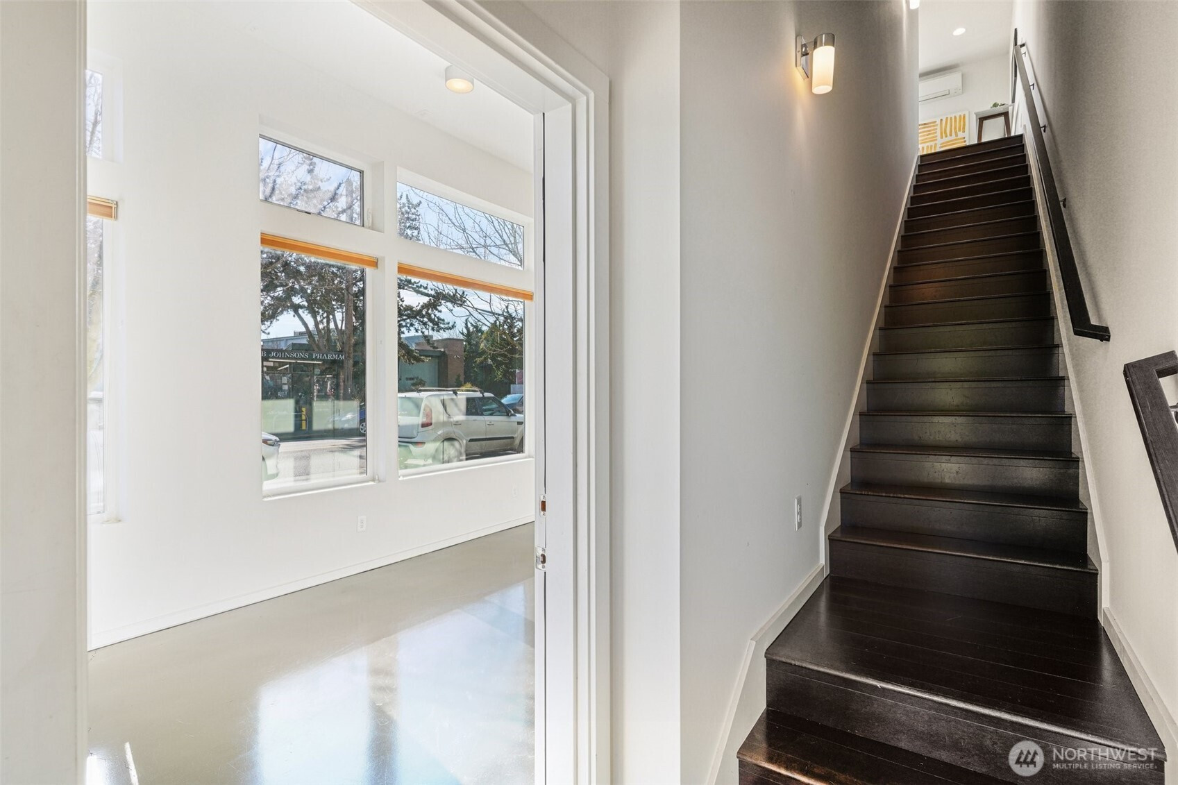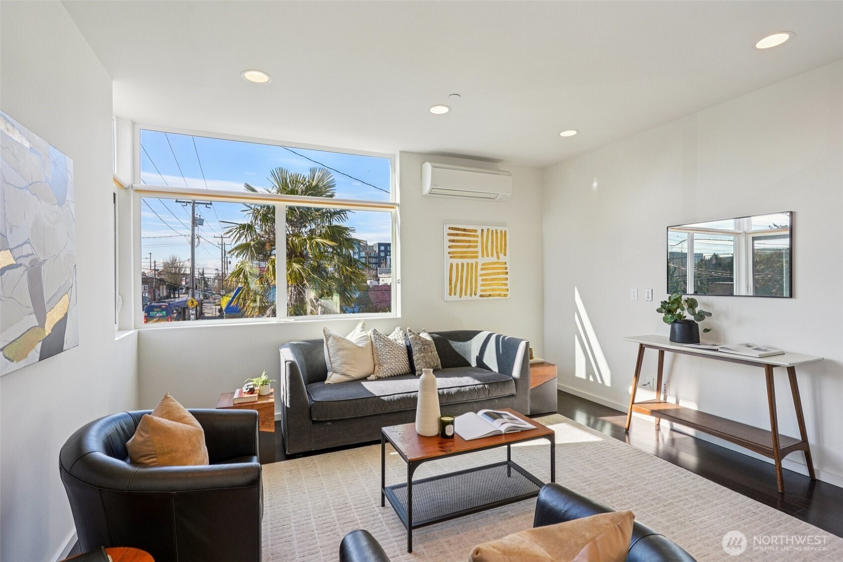 Exceptional opportunity to own a rare corner townhome flooded with natural light on three sides in sought-after Crown Hill. Built 2016, this 1,939 sq ft, 3-level residence blends modern design with extraordinary flexibility. Open-concept main level: quartz countertops, soft-close cabinetry, Bosch dishwasher, LG washer/dryer—ideal for entertaining and daily life. Upstairs: two spacious bedrooms, primary suite with spa-inspired bath, oversized rain shower, and walk-in closet with dual access from bedroom and bath. Ground floor: versatile 600 sq ft studio with separate street entrance, keypad entry, 3/4 bath, kitchenette, ample attic storage, and independent ductless A/C and Fiber internet are perfect for home office, workspace, guest retreat, or 3rd bedroom with outstanding 85th St visibility. Covered secure garage, a rooftop deck with gas hookup that has Rainier, Cascades and Olympic views. Walk to Met Market, Whittier Elementary, Loyal Heights, Whitman Middle, cafés, RapidRide D Line, Golden Gardens Beach. Flexibility meets urban living—a Crown Hill gem!