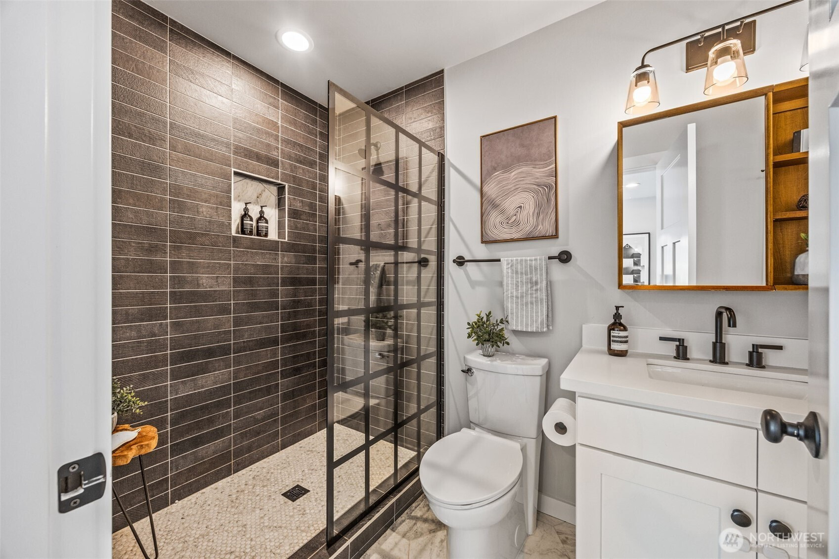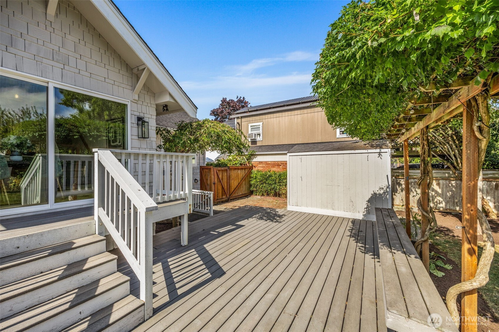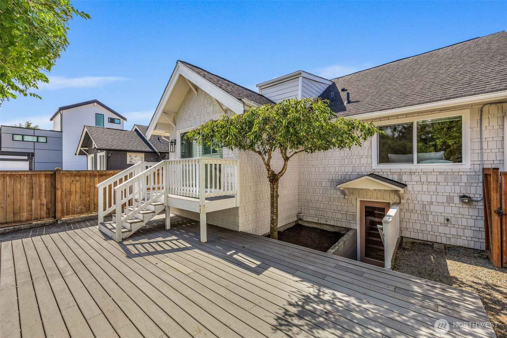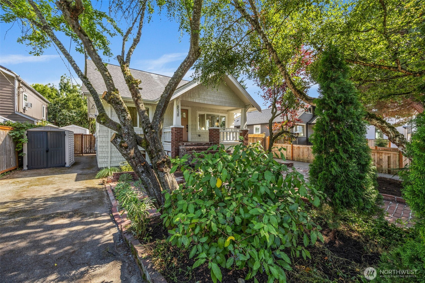 Charm meets modern living by following the enchanting, brick path under blooming cherry trees to this beautifully remodeled 1924 Craftsman with covered front porch. Light-filled spaces w/ wide-plank oak floors, sunny office w/ French doors, stylish kitchen w/ soaring vaulted dining leads to sprawling deck for seamless indoor/outdoor living. Main floor primary room w/ bath & designer finishes plus flex spaces for work, play & guests on both upper & lower floors including media/recreation room. Fully updated systems for peace of mind & fenced yard w/ custom pizza oven offers the ultimate entertaining experience. Plenty of off-street parking with two driveways and two sheds for gear storage. Close to Metropolitan Market, eateries, & shopping.